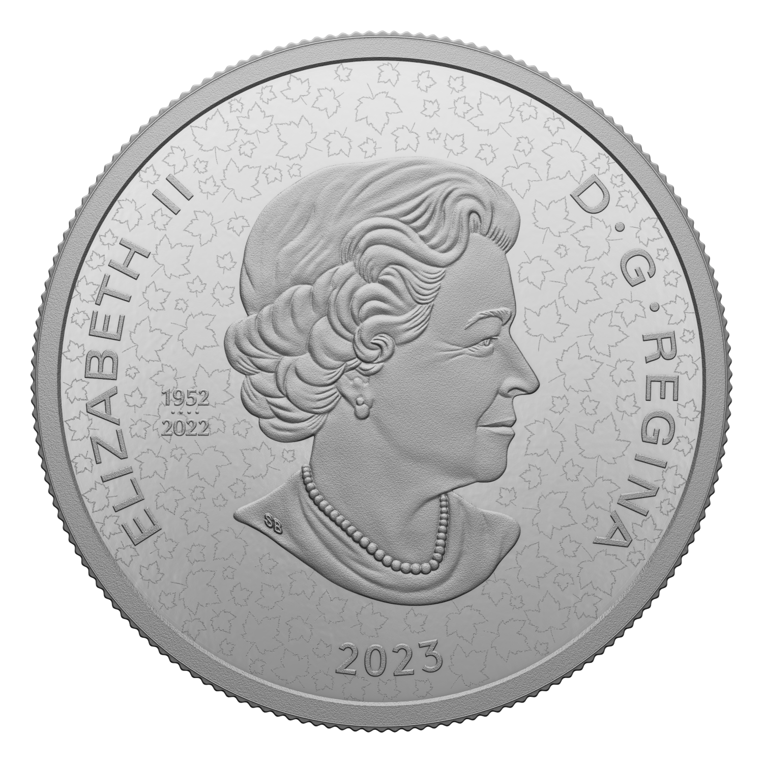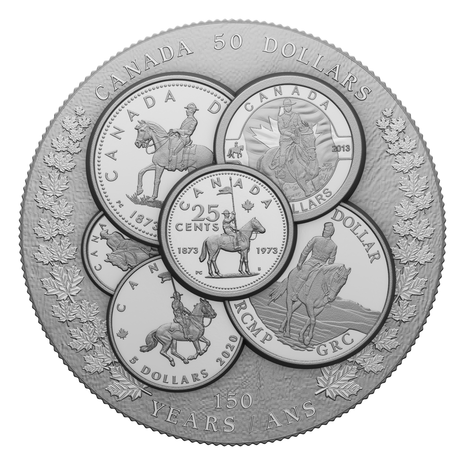Struck in Ultra High Relief, the reverse design is a compilation of Royal Canadian Mounted Police (RCMP)-themed “horse and rider” designs from previous coins (clockwise from top left): the 1973 commemorative silver dollar; 2013’s $10 O Canada: Royal Canadian Mounted Police; 1998’s 125th Anniversary of the Royal Canadian Mounted Police silver proof dollar; 2020’s $5 Moments to Hold: Celebrating 100 Years of the RCMP as Canada’s National Police Force (when legislation came into effect in 1920 that: changed the Royal North-West Mounted Police (RNWMP) name to the Royal Canadian Mounted Police); 2010’s pure gold 50-cent (1/25 oz.) RCMP coin; and at the centre, the 1973 100th Anniversary of the RCMP 25-cent circulation coin. Backed by a textured field, the designs are flanked by maple leaves and accompanied by the word “CANADA”, a face value of “50 DOLLARS”, and the words “150 YEARS / ANS” to mark the RCMP’s 150th anniversary in 2023. The obverse features a maple leaf pattern and the effigy of Queen Elizabeth II by Susanna Blunt. The obverse also bears a special marking that includes four pearls symbolizing the four effigies that have graced Canadian coins and the double date of her reign.