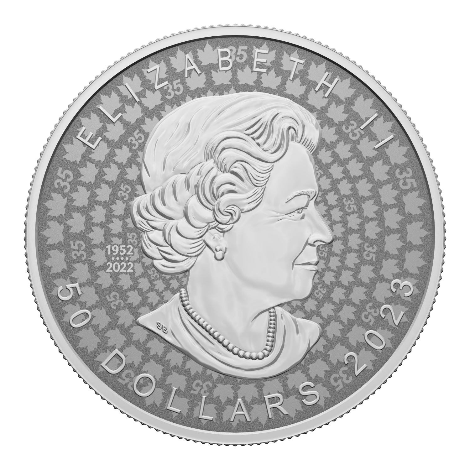 The coin’s reverse features Walter Ott’s Silver Maple Leaf (SML) design. Struck in Ultra High Relief, the iconic maple leaf is backed by a unique laser-engraved field pattern that celebrates the SML’s 35th anniversary in 2023. Seven small maple leaves appear with the number “35” to form a pattern that repeats five times, for a total of 35 mini SMLs in each ring—one mini SML for each year since Canada’s first silver bullion coin was issued in 1988. The pattern repeats on the obverse, which features the effigy of Queen Elizabeth II by Susanna Blunt. The obverse also bears a special marking that includes four pearls symbolizing the four effigies that have graced Canadian coins and the double date of her reign.