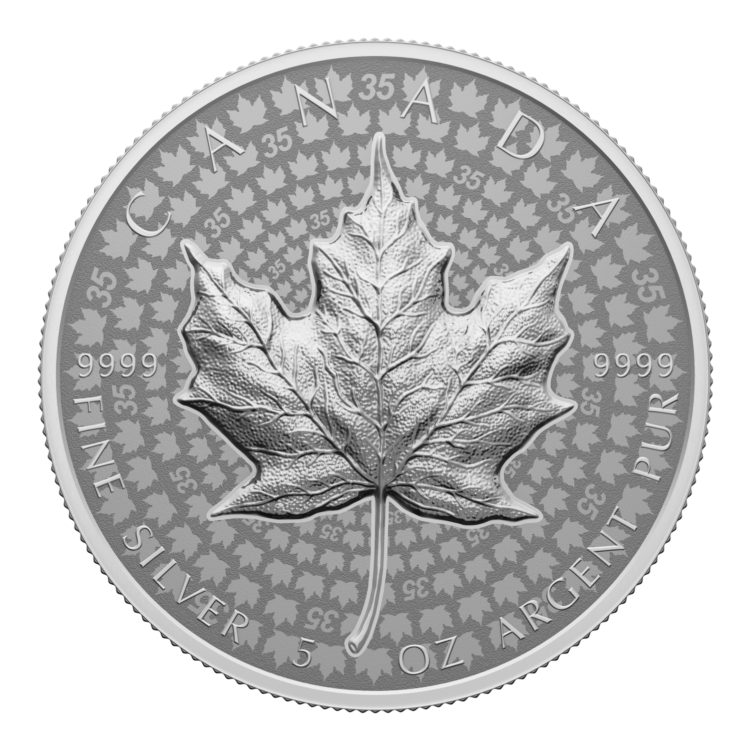 Much has changed since 1988, when the Silver Maple Leaf (SML) was first introduced to the world. Thirty-five years later, Canada’s bullion maple leaf appears untouched by time on our coins, where its natural beauty has been enhanced by different finishes and technologies over the years—including Ultra High Relief, as seen on this 5 oz. 99.99% pure silver coin. The coin’s reverse boasts an extraordinary peak relief height of 3 mm, where the shiny Ultra High Relief maple leaf is backed by a laser-engraved “SML anniversary” field pattern. Look closely and you’ll notice seven maple leaves with the number “35” — a pattern that repeats five times for a total of 35 mini SMLs that form each ring, or one leaf for every year since the first SML was issued.