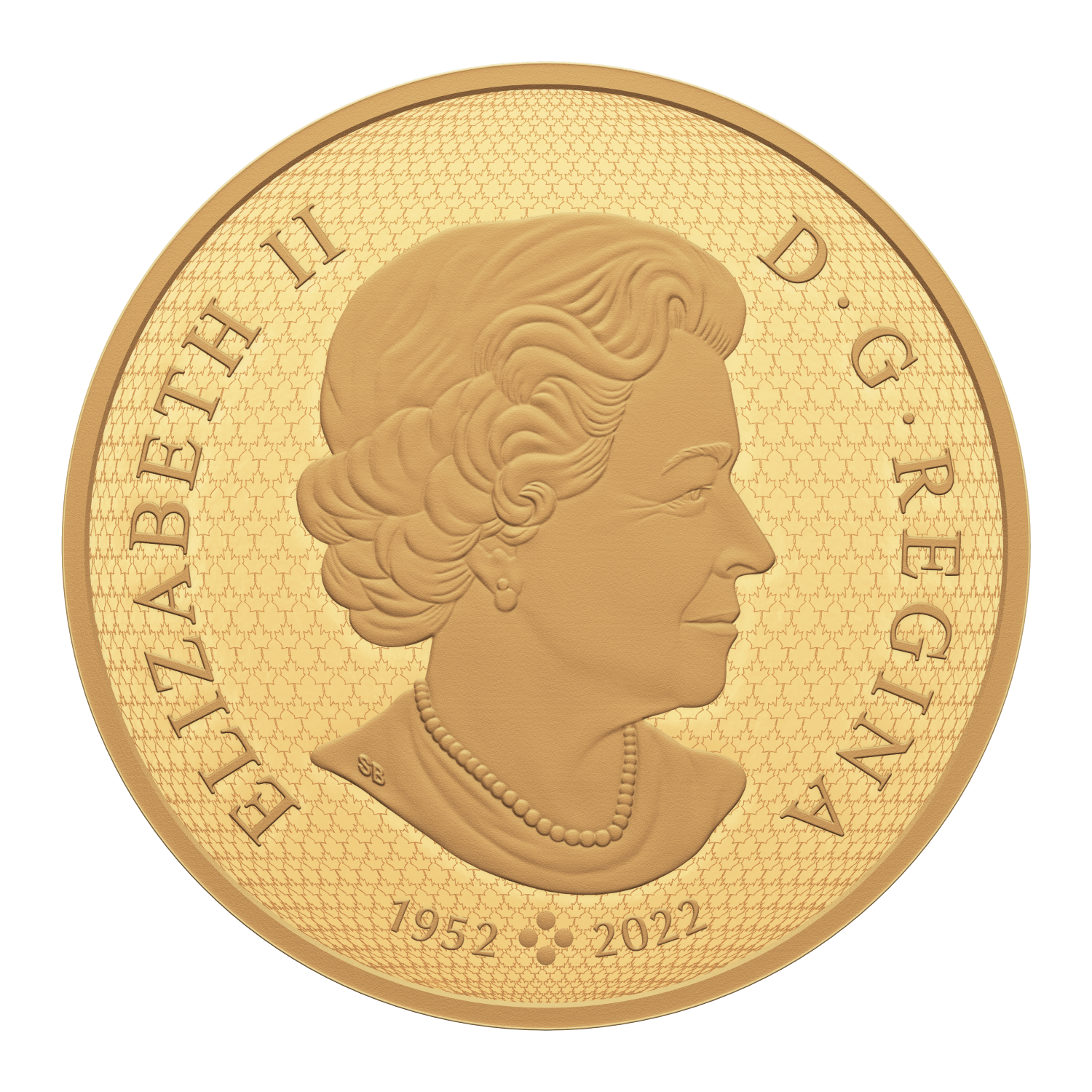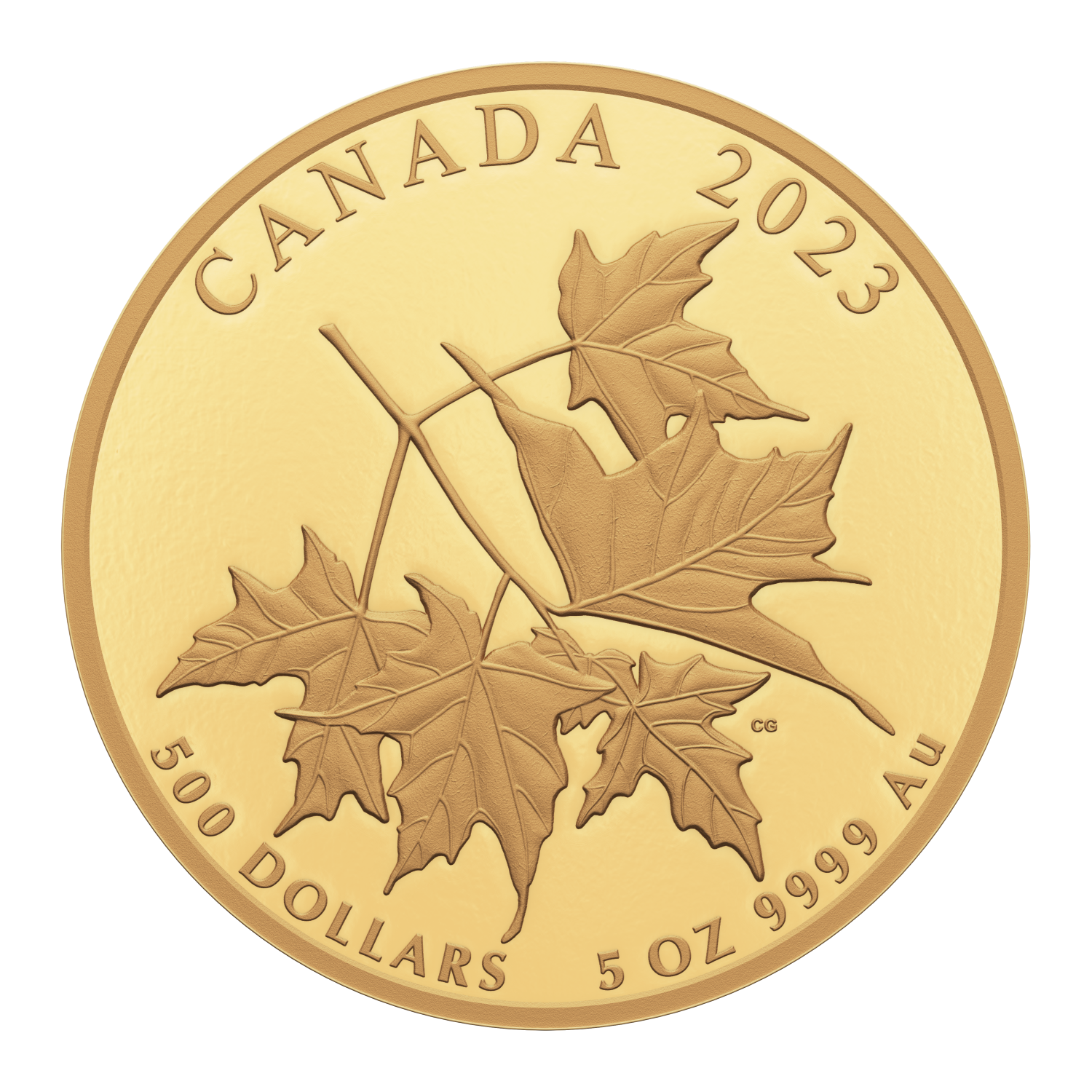 The reverse design by artist Celia Godkin captures the natural beauty of sugar maple (Acer saccharum) leaves and emphasizes the unique shape of this quintessential Canadian symbol. This late spring/summer view features six opposite-branching sugar maple leaves on slender stems and gently swaying in the wind. The text “CANADA” and the year “2023” appear above the maple leaves, while a face value of “500 DOLLARS”, the nominal metal weight “5 OZ” and the purity standard of “9999 AU” are engraved below. The obverse features a radial maple pattern and the effigy of Queen Elizabeth II by Susanna Blunt. The obverse also bears a special marking that includes four pearls symbolizing the four effigies that have graced Canadian coins and the double date of her reign.