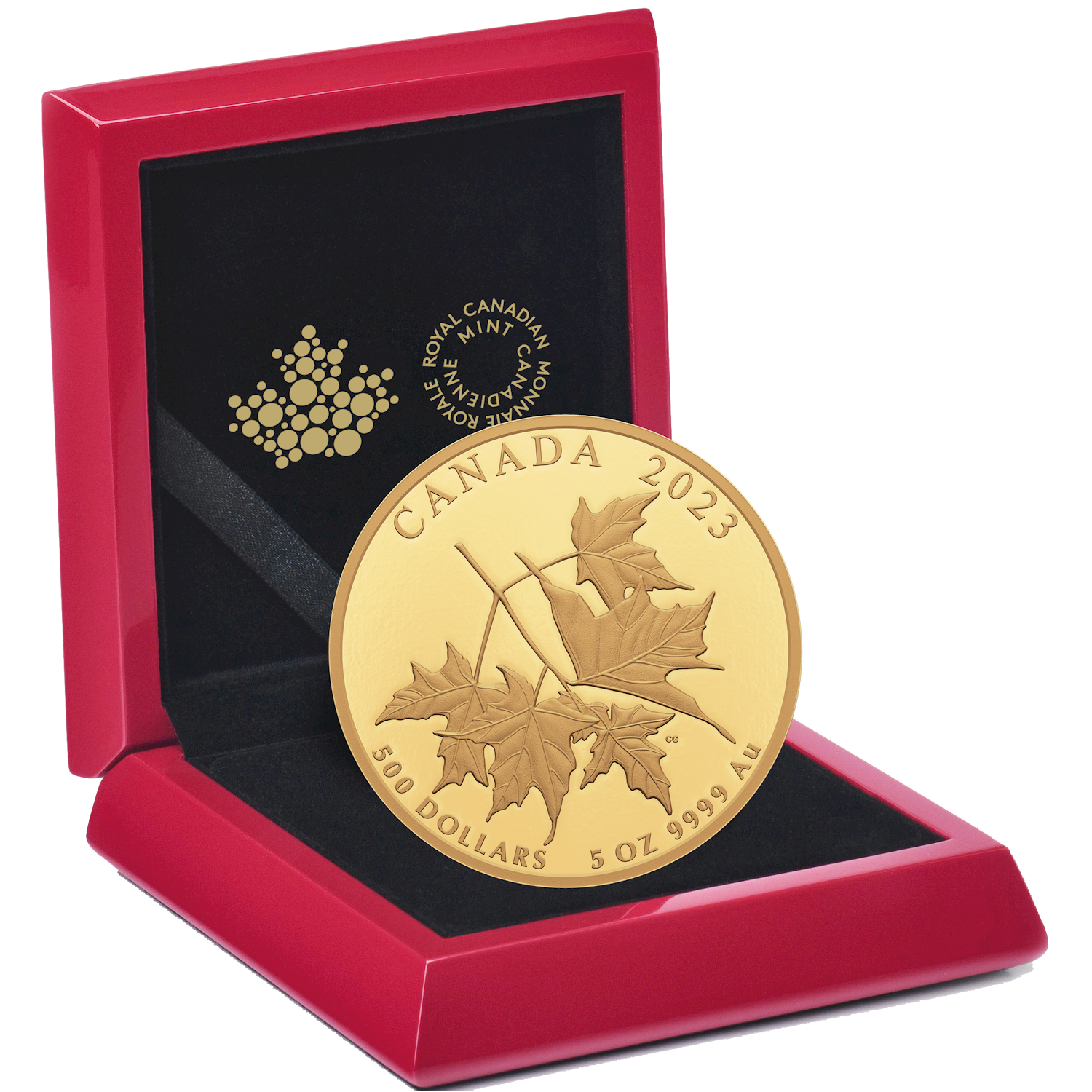• Naturally elegant! The natural beauty and elegance of a beloved Canadian symbol, the maple leaf, is forever preserved in 5 oz. of proof-quality 99.99% pure gold. The coin features the most famous of all Canadian maple species, Acer saccharum (sugar maple).