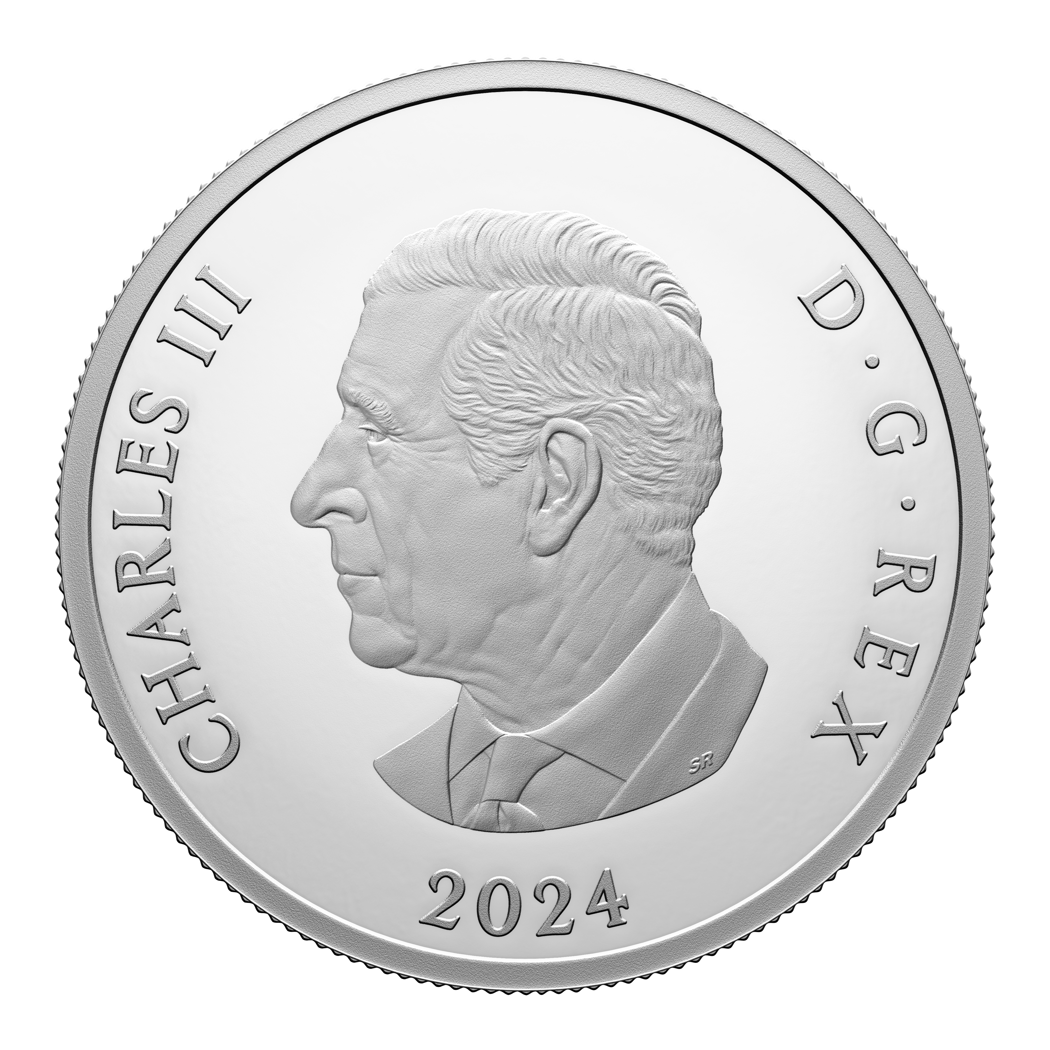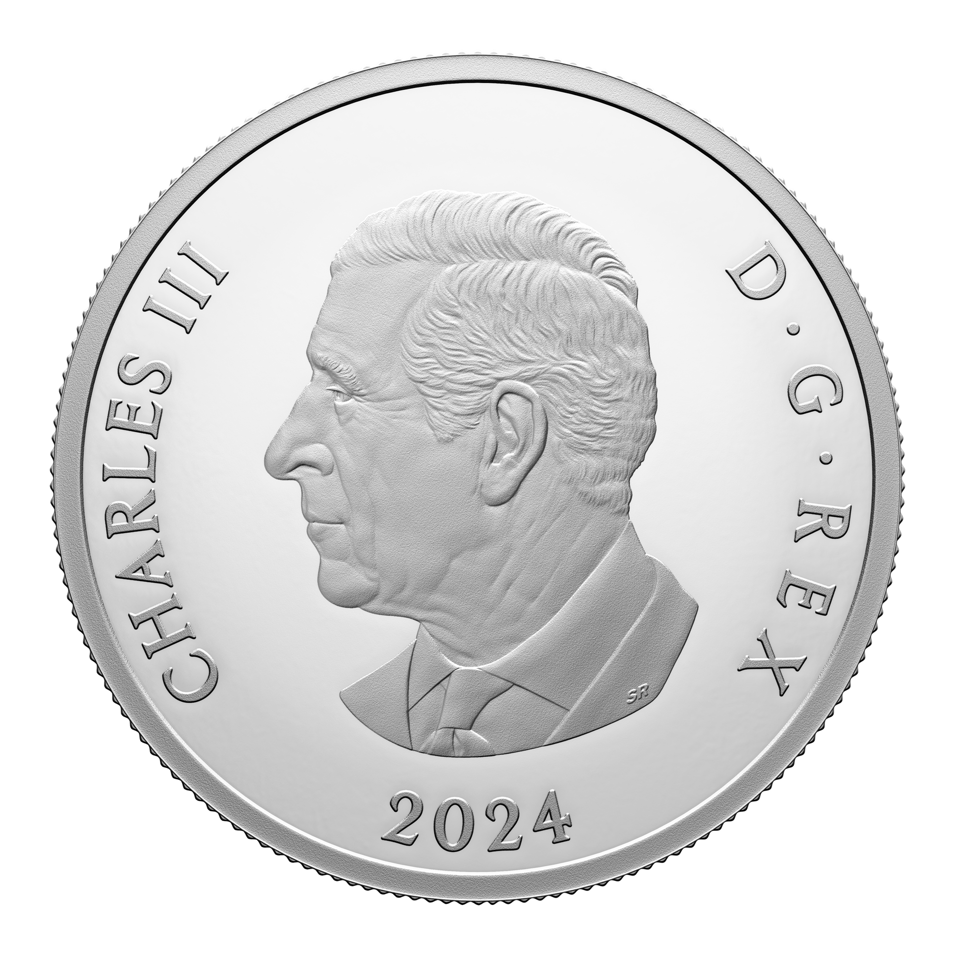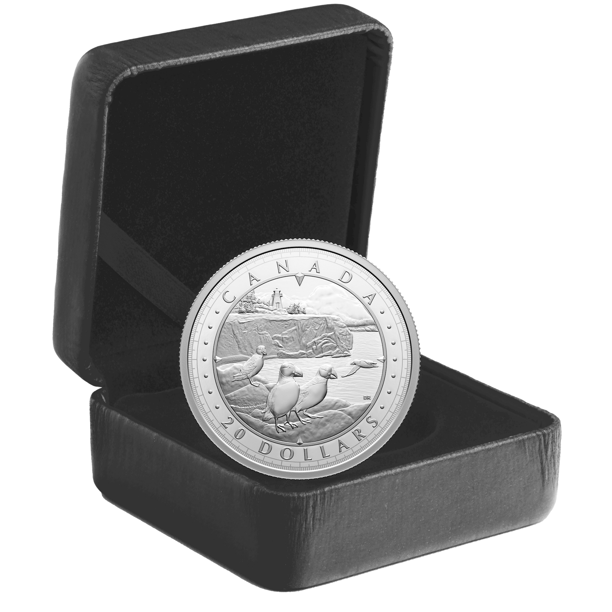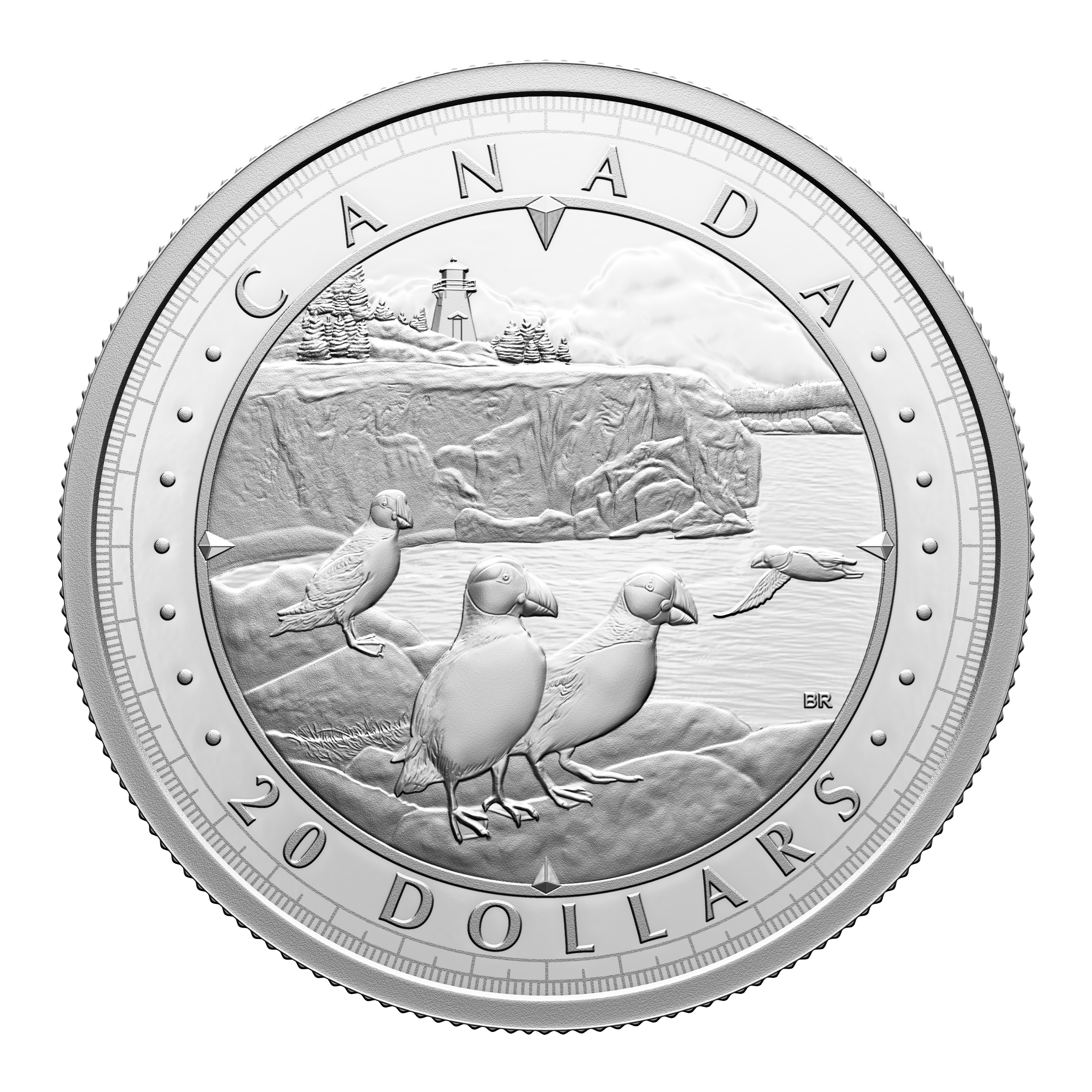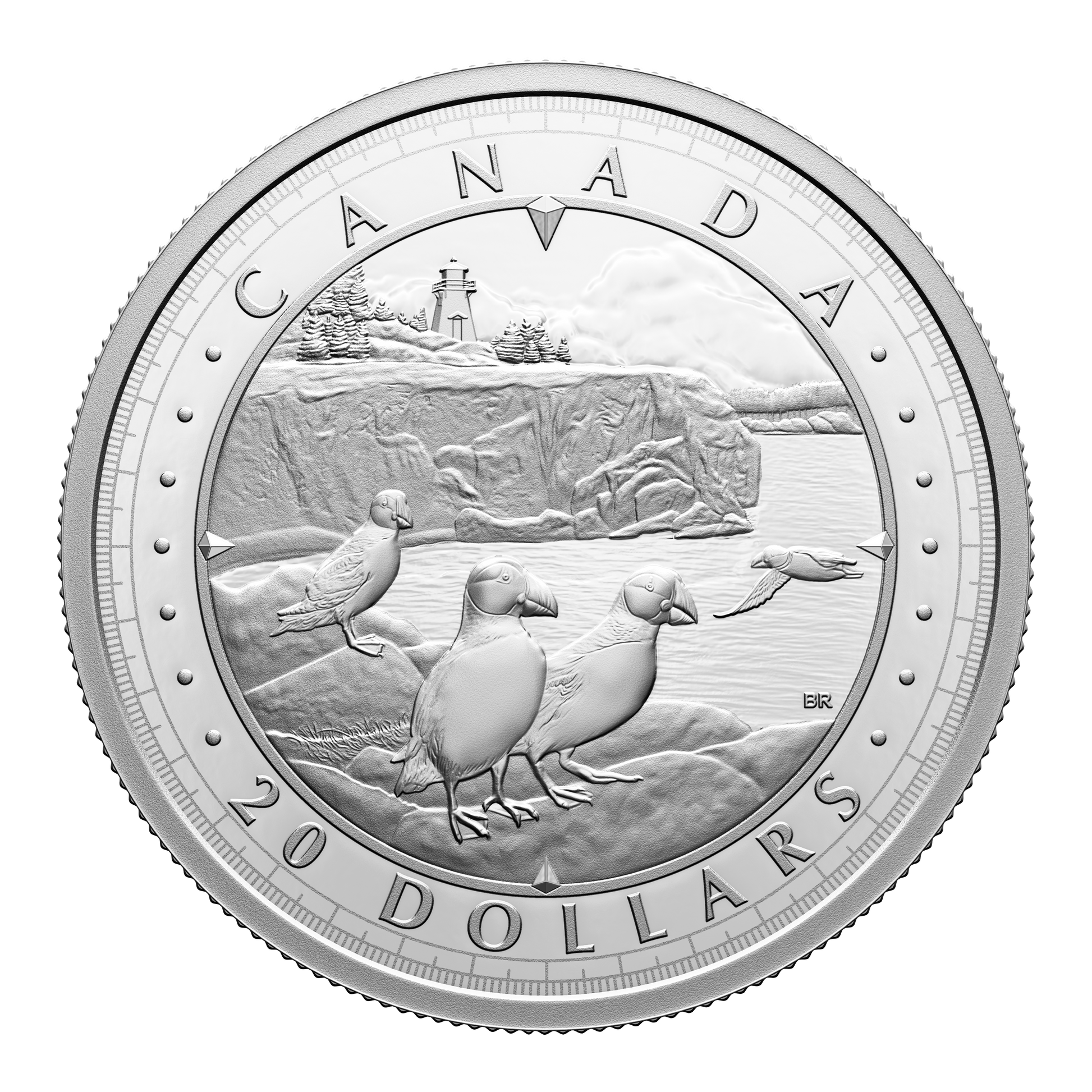 The coin’s reverse presents a cliffside view of Canada’s Atlantic coast. Designed by artist Bonnie Ross, the sweeping view features two Atlantic puffin (Fratercula arctica) pairs in the foreground, while in the background, a lighthouse—an icon of Atlantic Canada’s maritime history—is perched atop a rocky cliff and nestled among wind-blown trees. Compass elements form a frame that contains the word “CANADA” and a face value of “20 DOLLARS”. The obverse features the effigy of His Majesty King Charles III by Canadian artist Steven Rosati.
