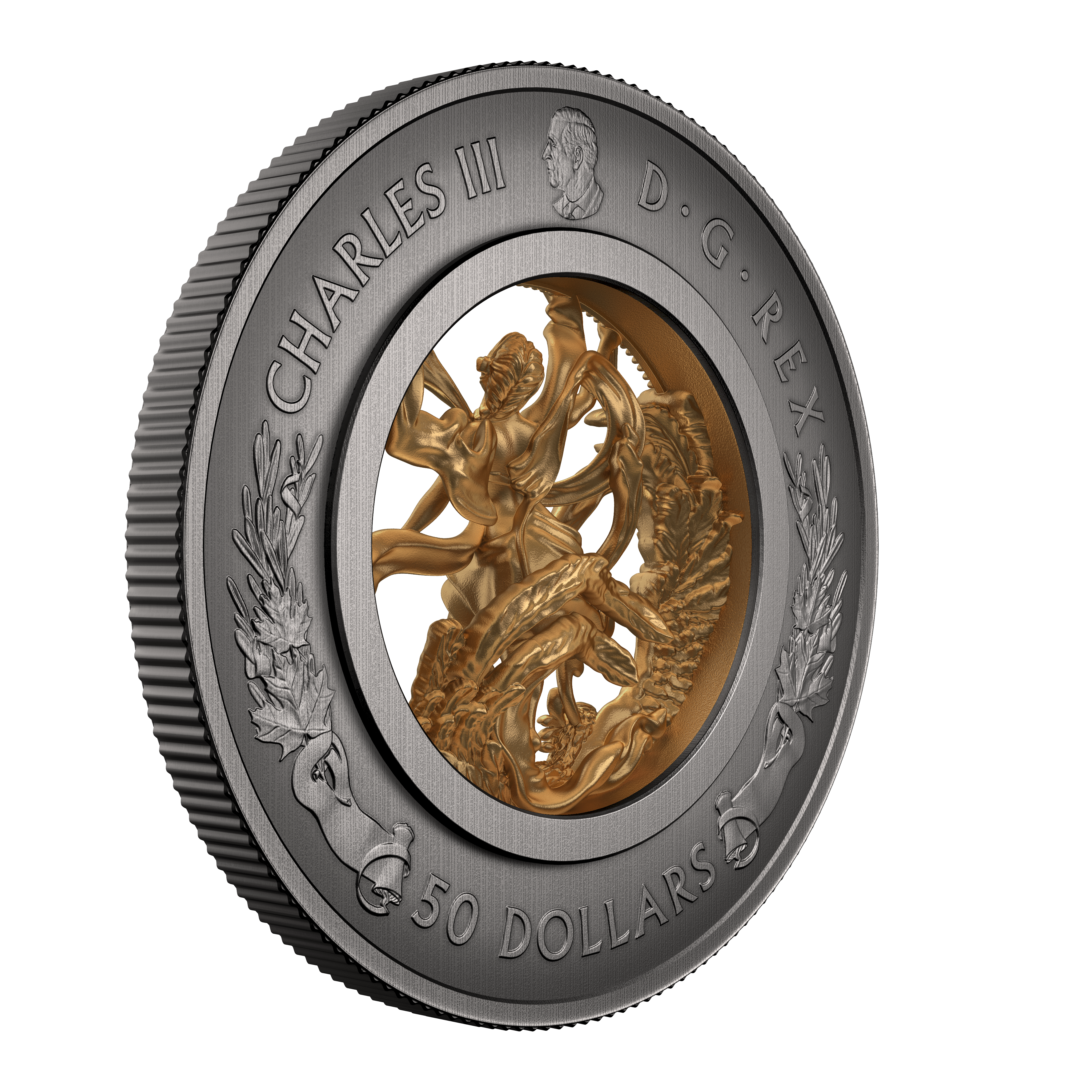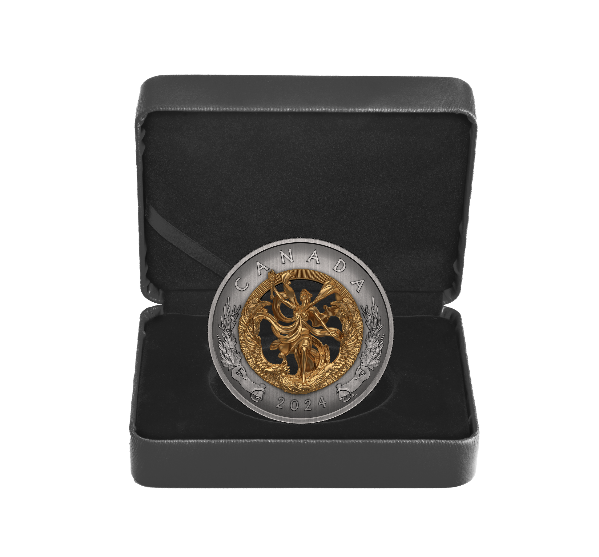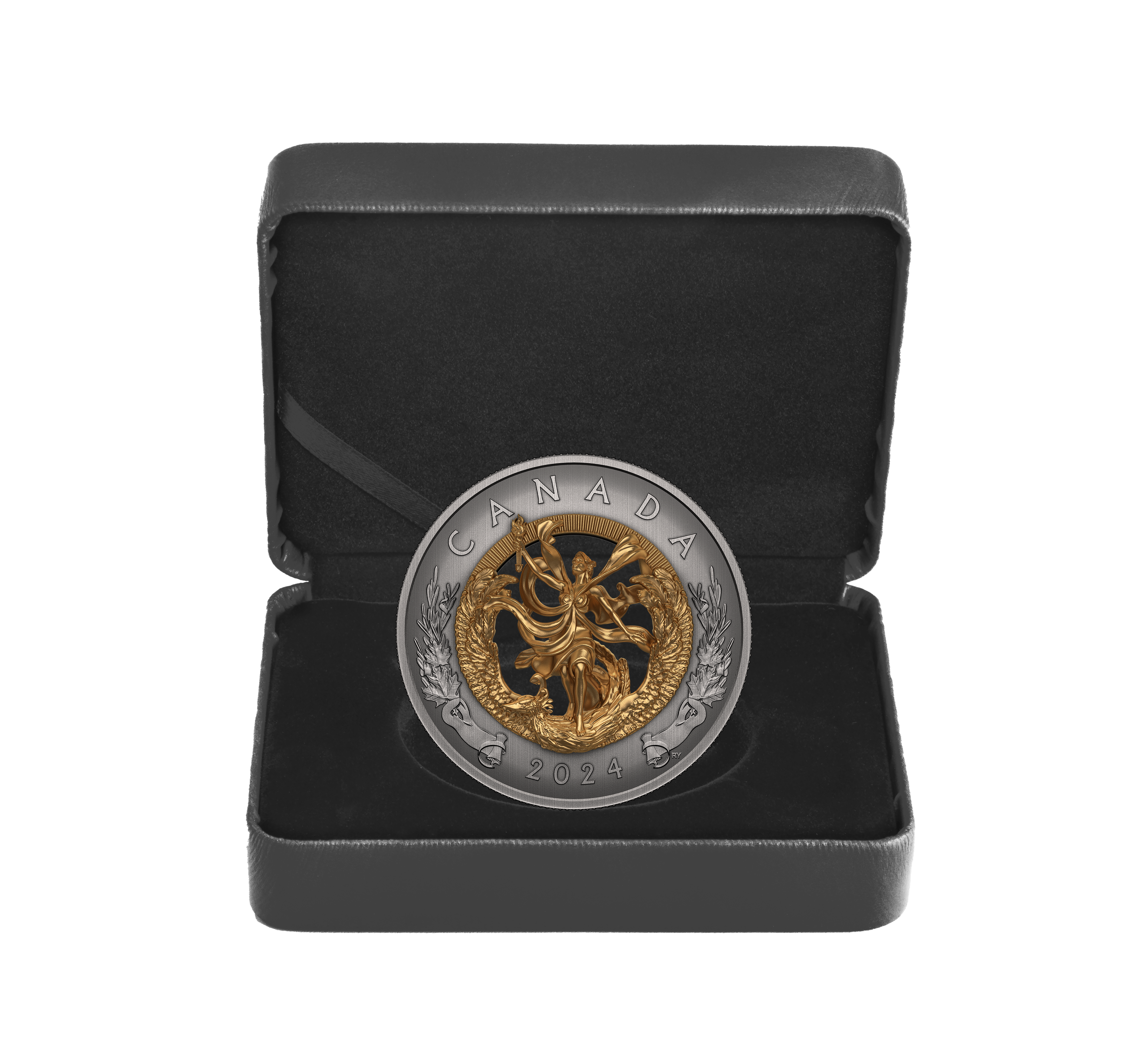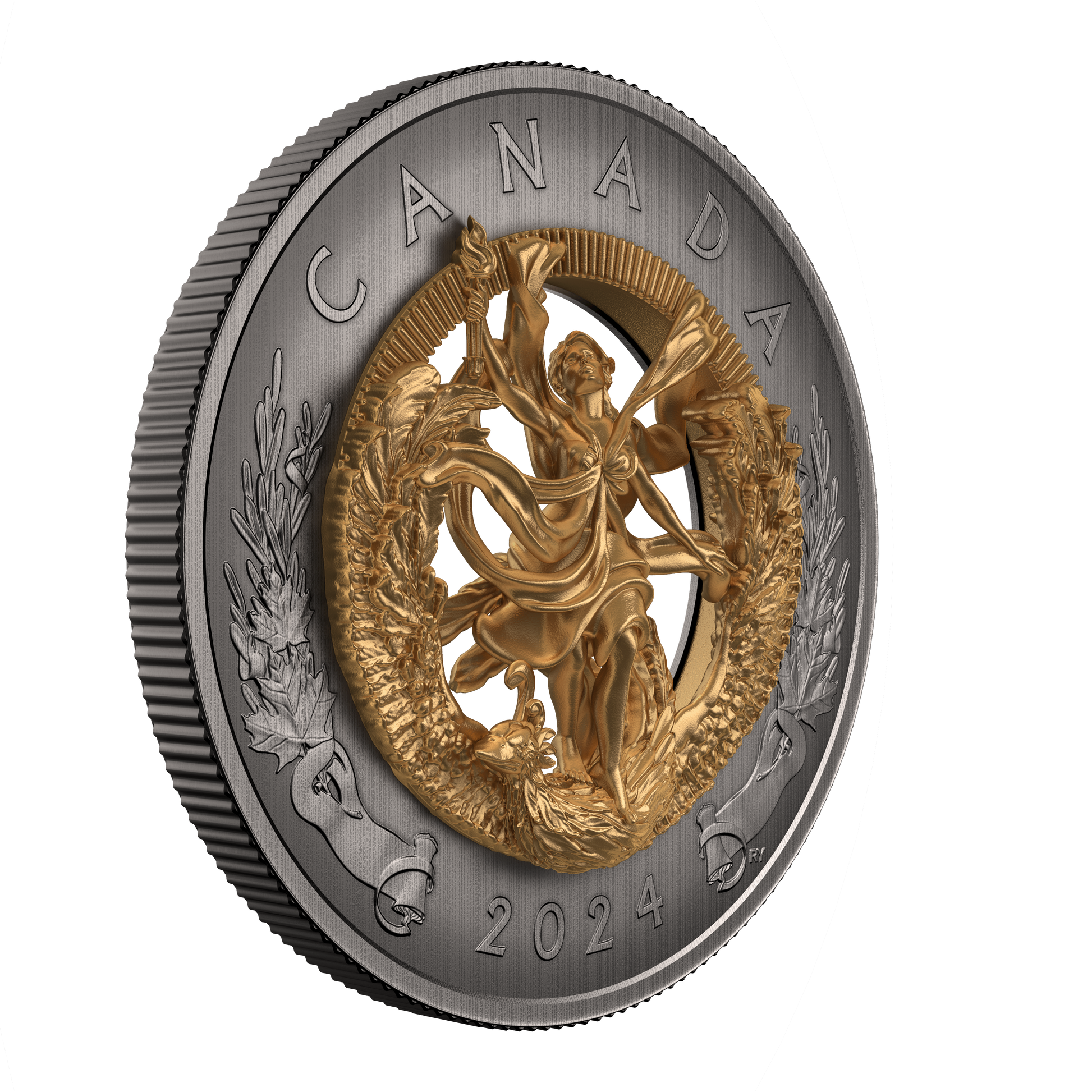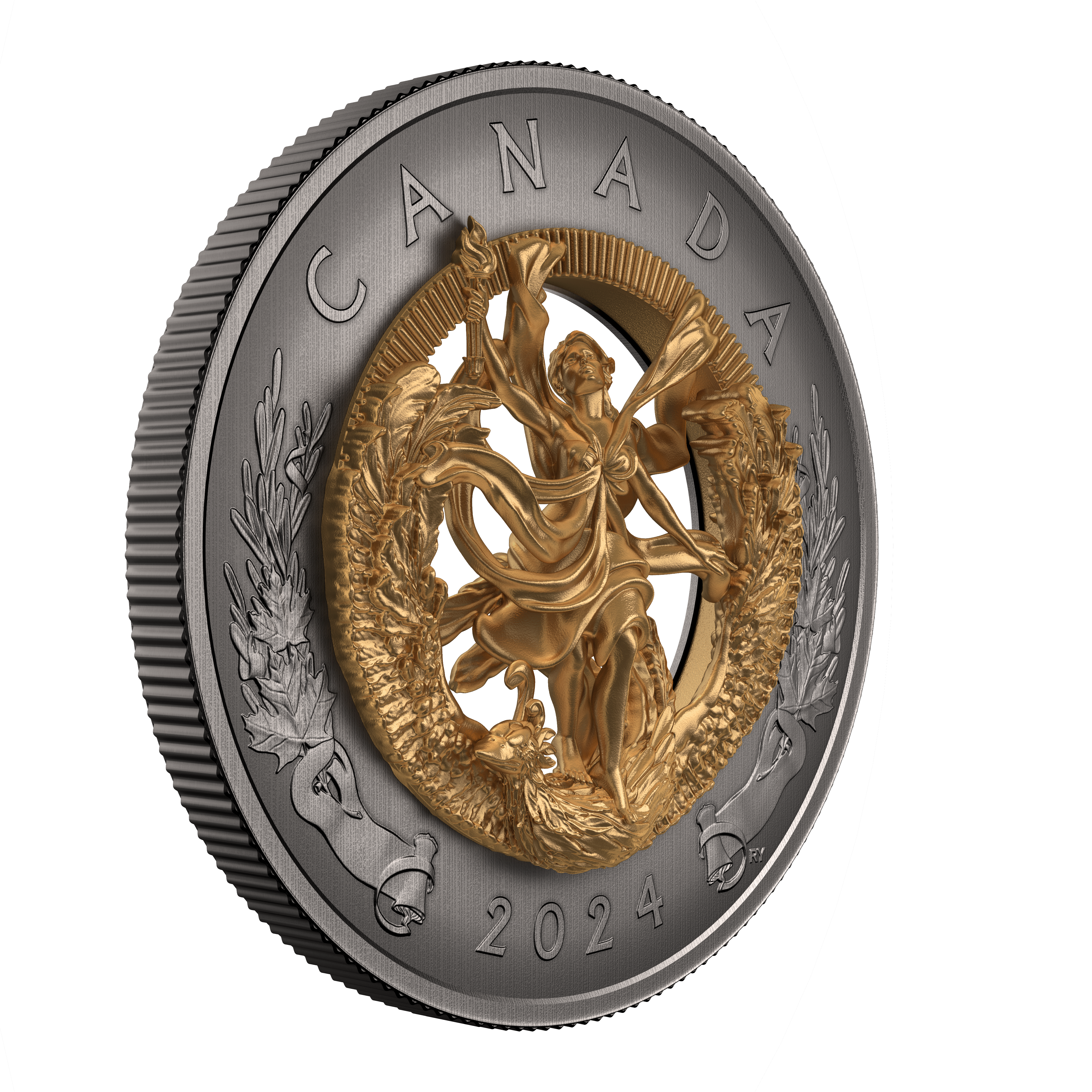 The National War Memorial in Ottawa serves as a striking expression of the hope and heroism exhibited by generations of Canadians who fought, and continue to fight, for the freedoms we hold so dear. Its representation of Freedom inspired this 2024 allegory, which serves as our latest R&D showcase of innovation. The follow-up to 2023’s Allegory of Peace, this coin with a double-sided 3D figure is now entirely cast in 99.99% pure silver—a higher purity level than the 2023 edition, whose allegory was cast in .999 fine silver. Visible on the coin’s obverse and reverse, the inspirational 3D figure is plated with gold to radiate hope and optimism, as Freedom holds up the torch that lights the way forward.