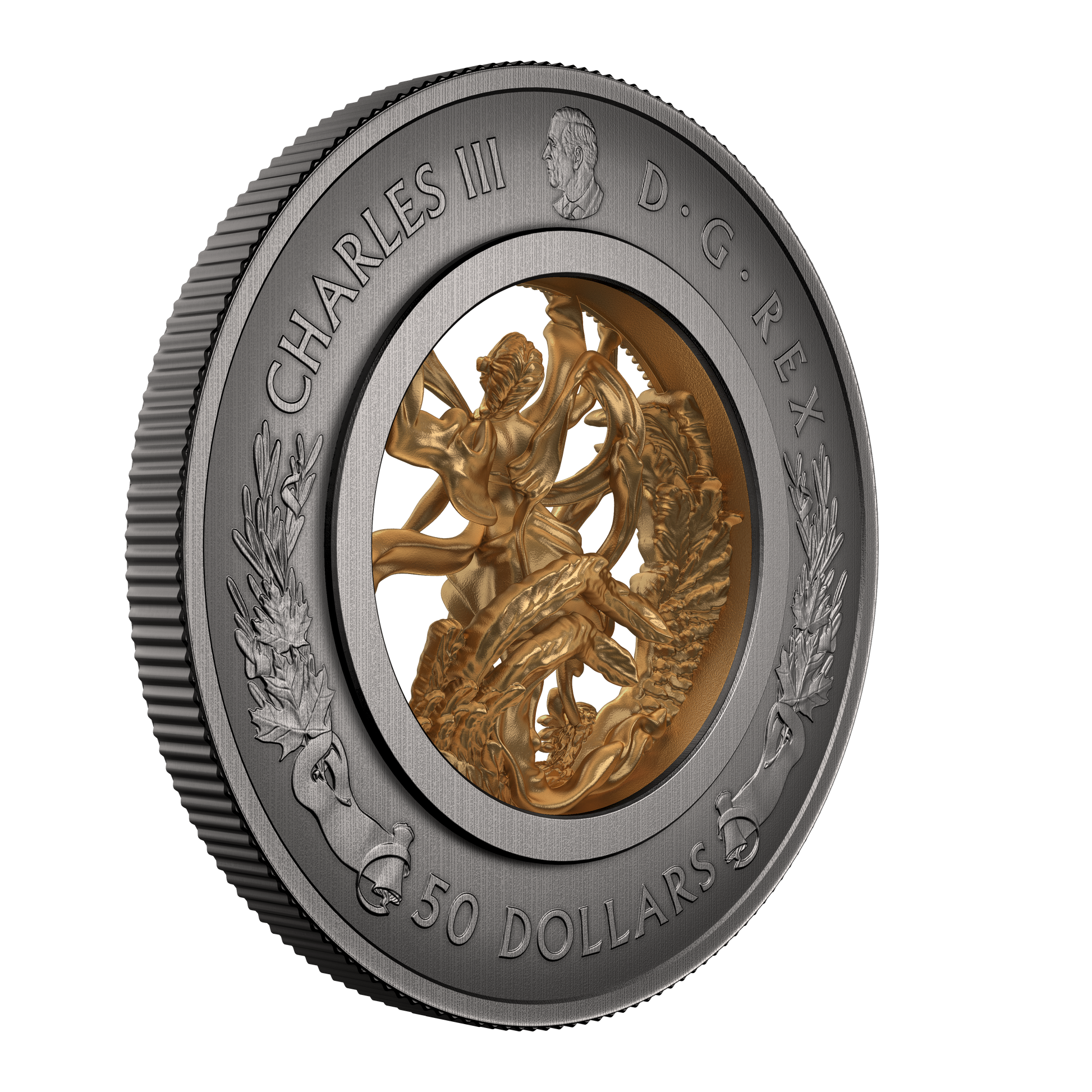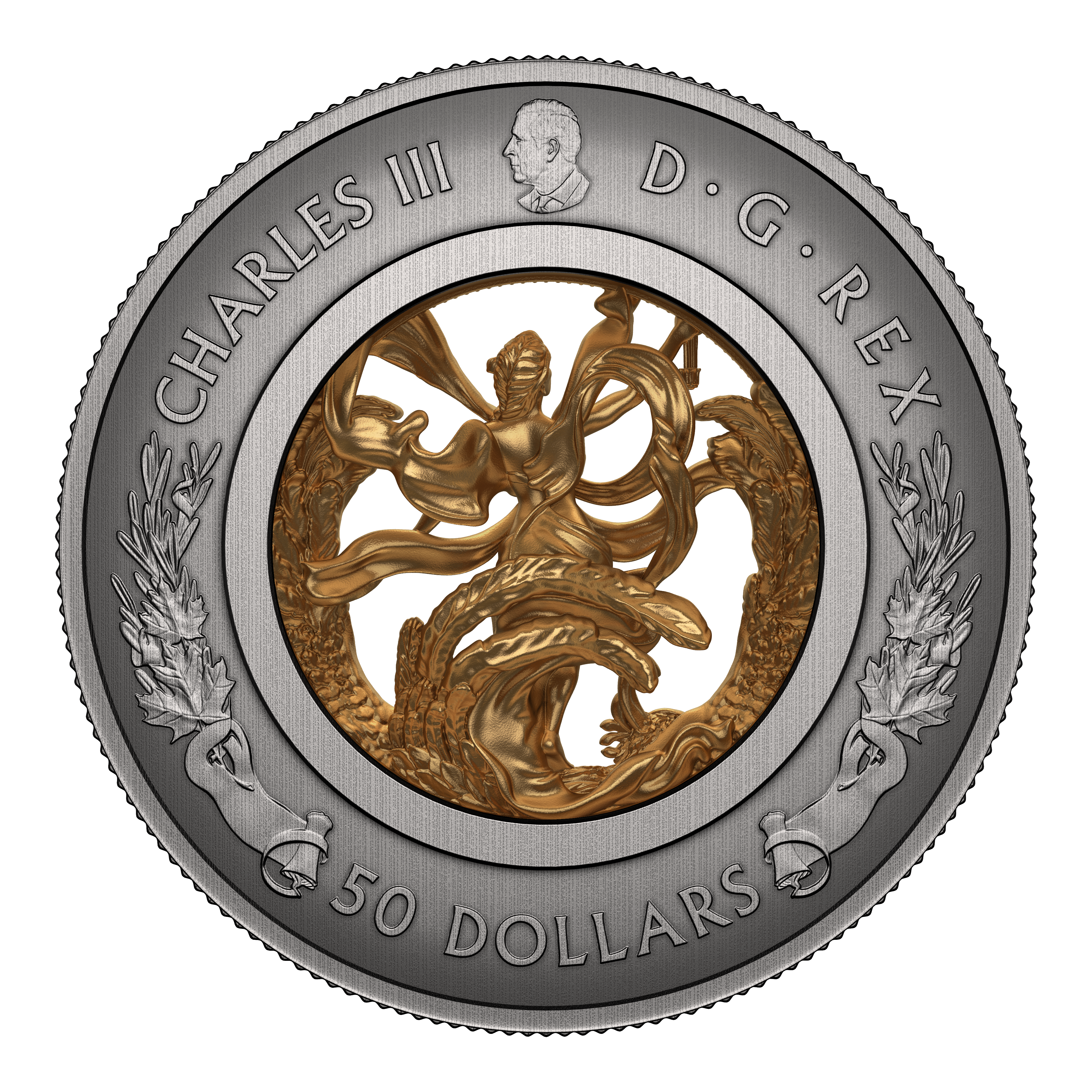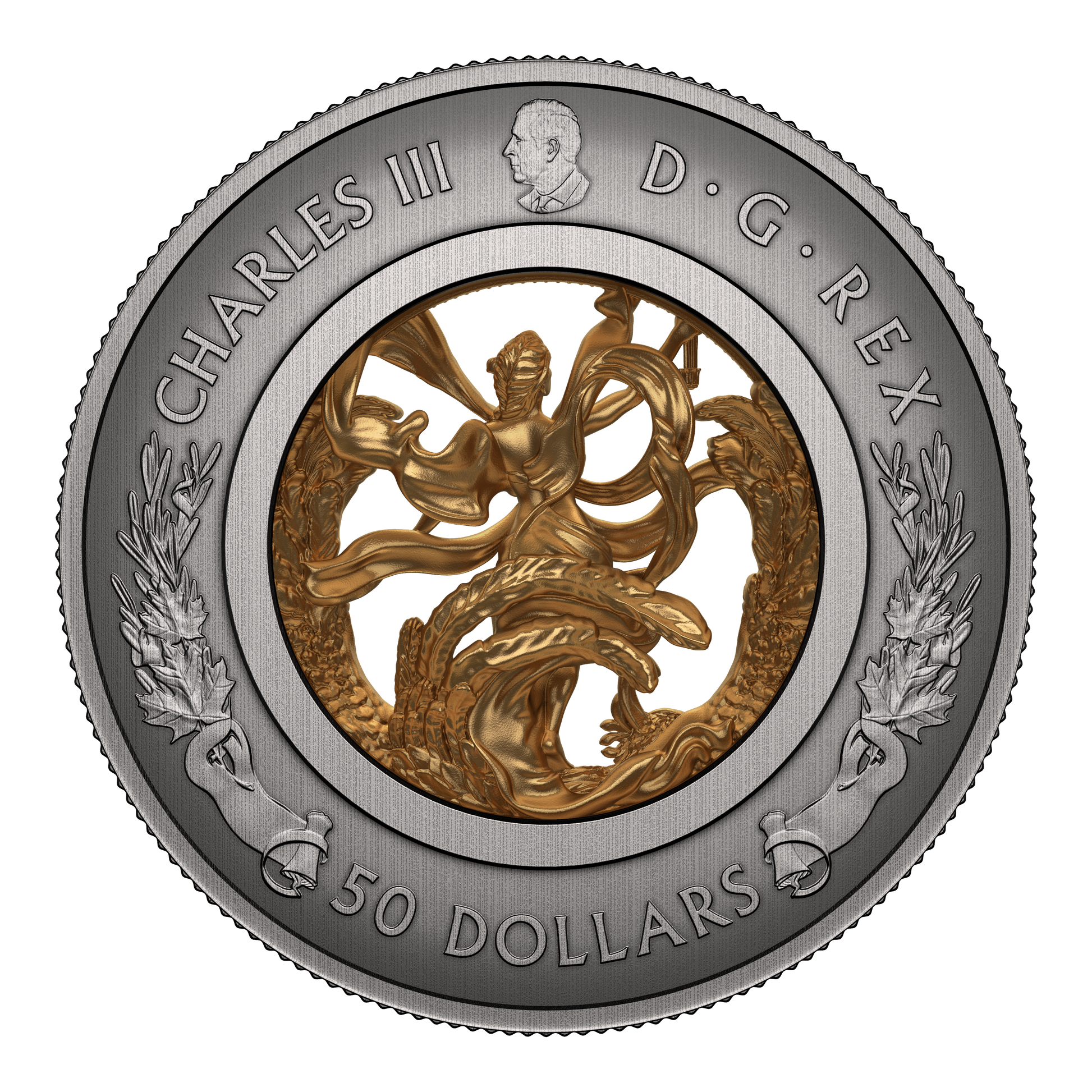 Inspired by the Liberty bronze figure on the National War Memorial in Ottawa, Ontario, the coin’s double-sided design by artist Rebecca Yanovskaya features a gold-plated 3D allegorical figure of Freedom cast in 99.99% pure silver. Riding on the back of a mythical bird that carries Freedom wherever she is needed, the figure holds a torch high to light the way forward. The allegory is set in the antiqued rim (also 99.99% silver), while on the coin’s outer rim, a scroll is paired with olive branches and maples leaves signifying Canada’s contributions to peace and freedom. The obverse features the effigy of His Majesty King Charles III by Canadian artist Steven Rosati.