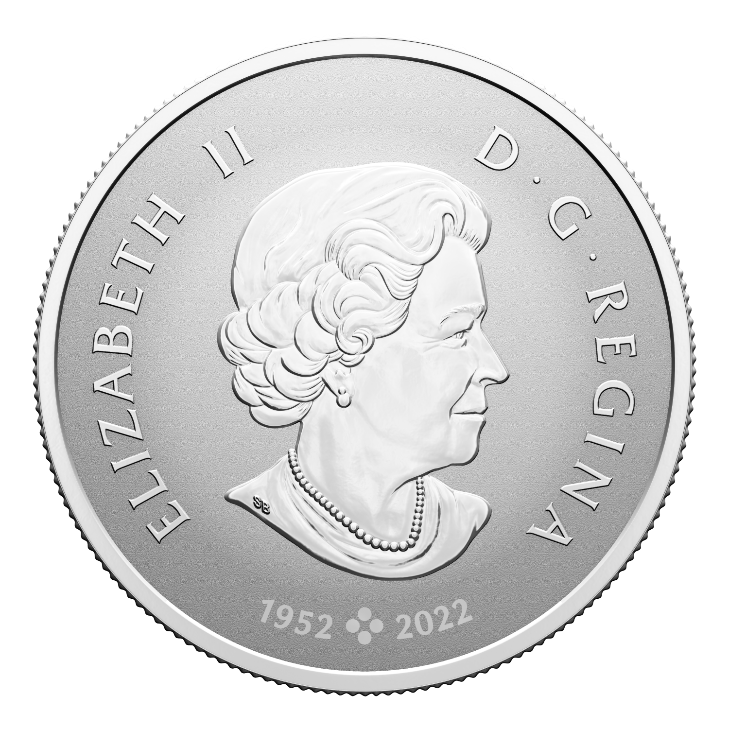 The obverse features the effigy of Queen Elizabeth II by Susanna Blunt. The obverse also bears a special marking that includes four pearls symbolizing the four effigies that have graced Canadian coins and the double date of her reign.