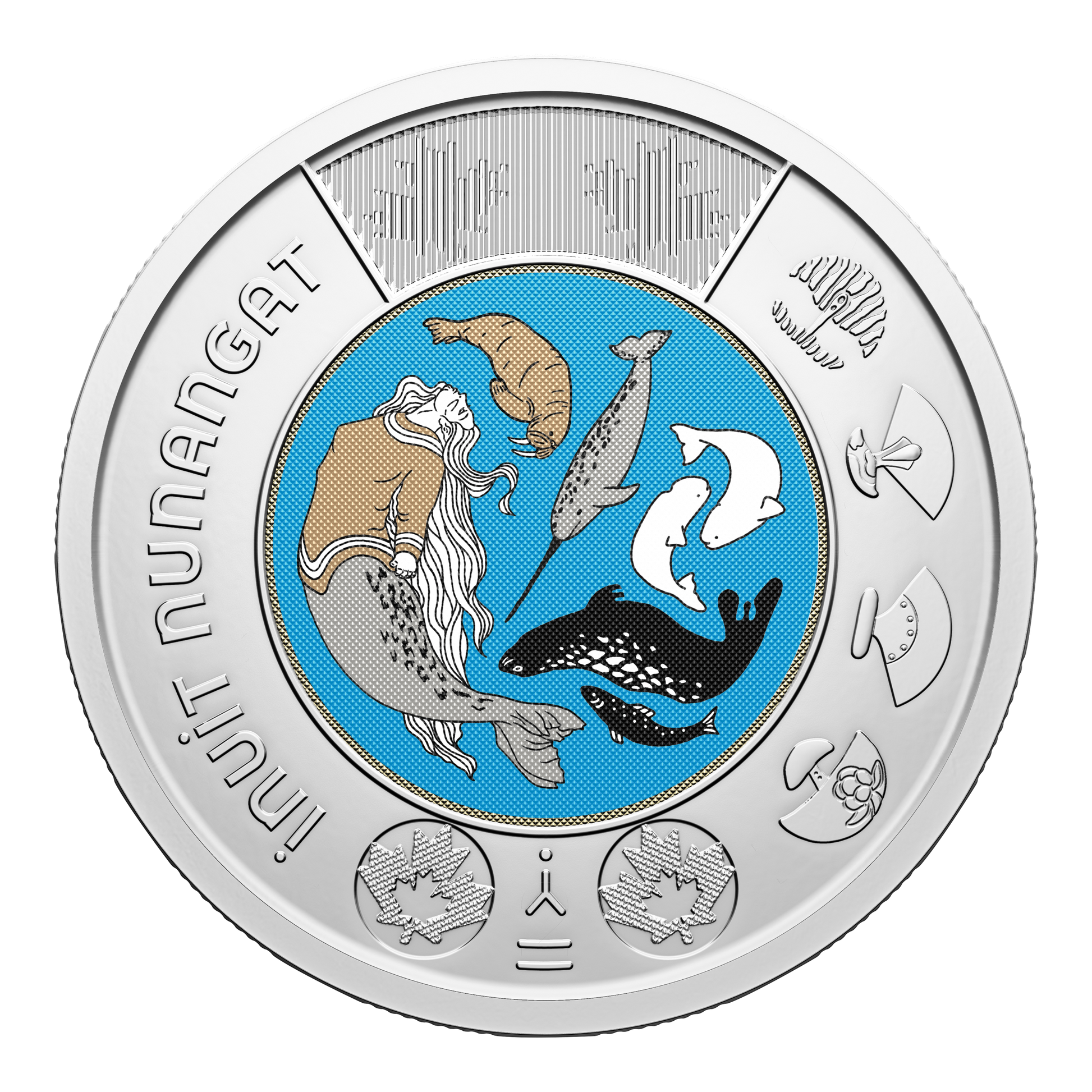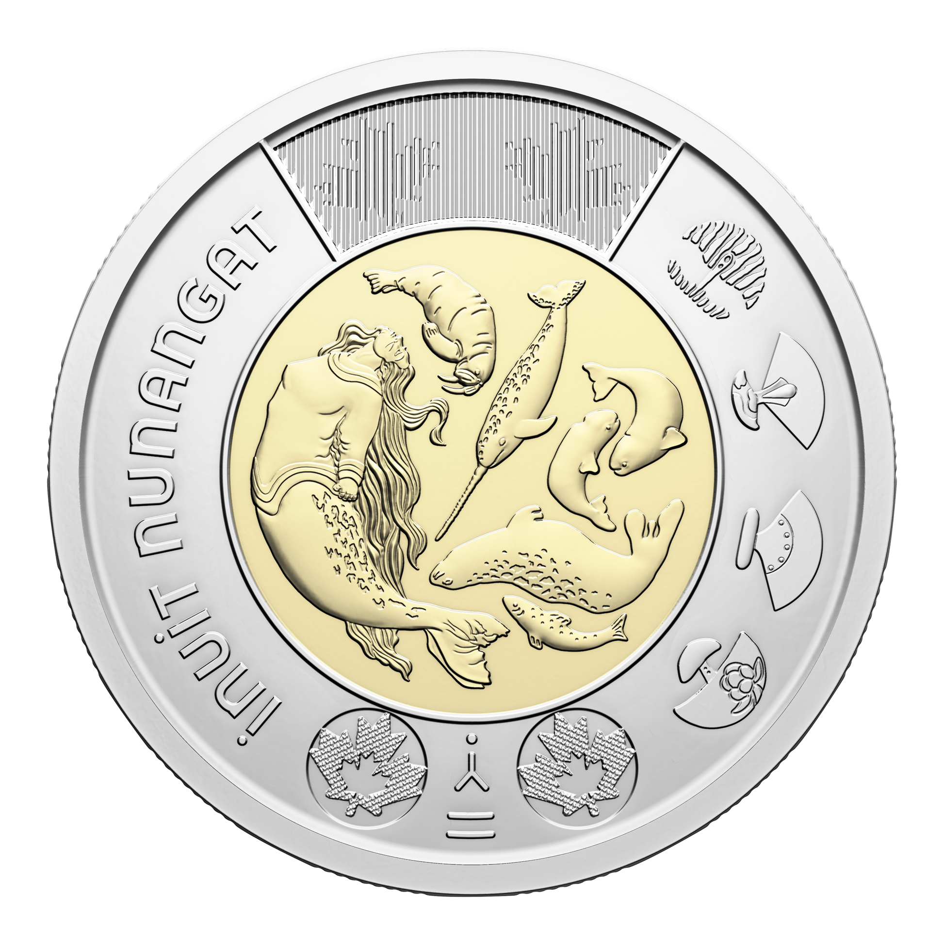 Representing a first for a Canadian circulation coin, the reverse design of the $2 Celebrating Inuit Nunangat commemorative circulation coin was created jointly by four Inuit artists, each representing one of the four treaty areas of Inuit Nunangat (ᐃᓄᐃᑦ ᓄᓇᖓᑦ): Nunatsiavut (ᓄᓇᑦᓯᐊᕗᑦ), Nunavik (ᓄᓇᕕᒃ), Nunavut (ᓄᓇᕗᑦ) and the Inuvialuit Settlement Region (ᐃᓄᕕᐊᓗᐃᑦ ᓄᓇᖓ).