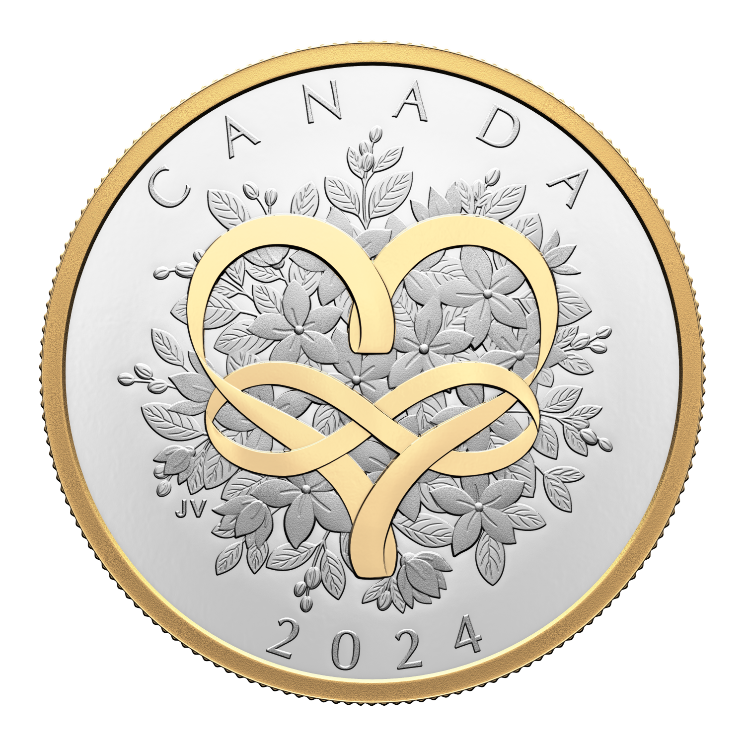 The reverse design by Canadian artist Jori van der Linde is an expression of love that transcends romance. The feelings and thoughts associated with love are represented by the bouquet of jasmine flowers, which are widely regarded as a precious symbol of beauty, love affection, purity or good luck. Enhanced with gold plating, a ribbon weaves its way through the flowers to form an intricate infinity heart that represents unity and an unending bond. The word “CANADA” and the year “2024” are also engraved on the reverse. The obverse features the gold-plated effigy of Queen Elizabeth II by Susanna Blunt. The obverse also bears a special marking that includes four pearls symbolizing the four effigies that have graced Canadian coins and the double date of her reign.