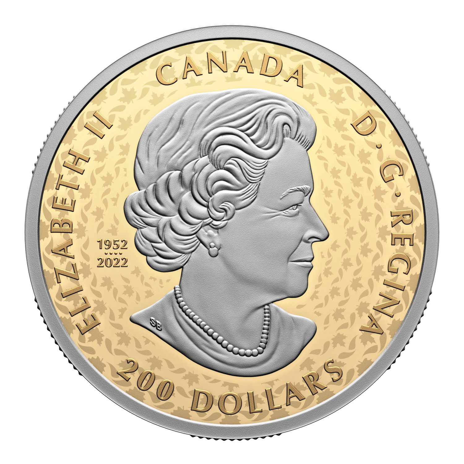 The gold Peace Dollar’s reverse features selective platinum plating and a new field pattern behind the allegorical image of peace designed by retired RCM Senior Engraver Susan Taylor. Struck in Ultra High Relief (UHR), Lady Peace is depicted in profile with her hair crowned in a wreath of olive branches and maple leaves, which inspired the field pattern. She is flanked by her name “PAX” (the Latin word for “Peace”) and the year “2024”, while Canada’s national motto, “A MARI USQUE AD MARE” (“From sea to sea”) appears overhead. The obverse features selective platinum plating and the effigy of Queen Elizabeth II by Susanna Blunt. The obverse also bears a special marking that includes four pearls symbolizing the four effigies that have graced Canadian coins and the double date of her reign.