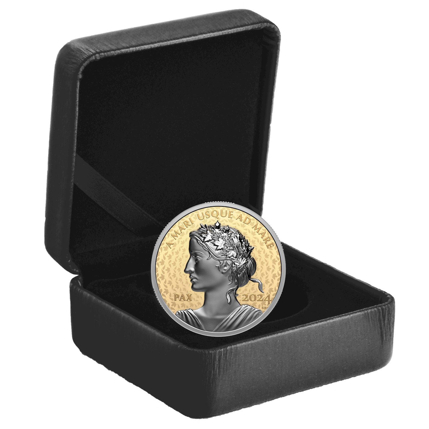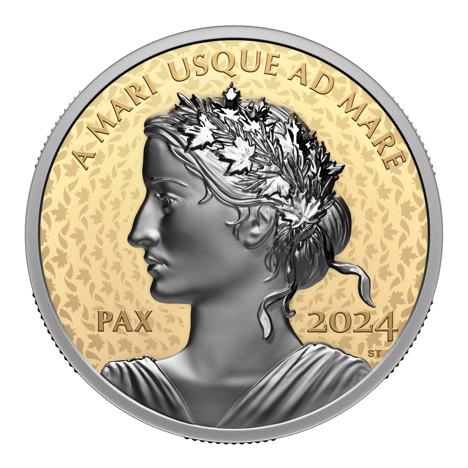 • The fifth Peace Dollar! Canada’s pure gold Peace Dollar is back for 2024! The coin’s reverse combines Ultra High Relief (UHR) with a custom field pattern, as well as platinum plating that elegantly enhances this Canadian portrait of peace (“PAX”).