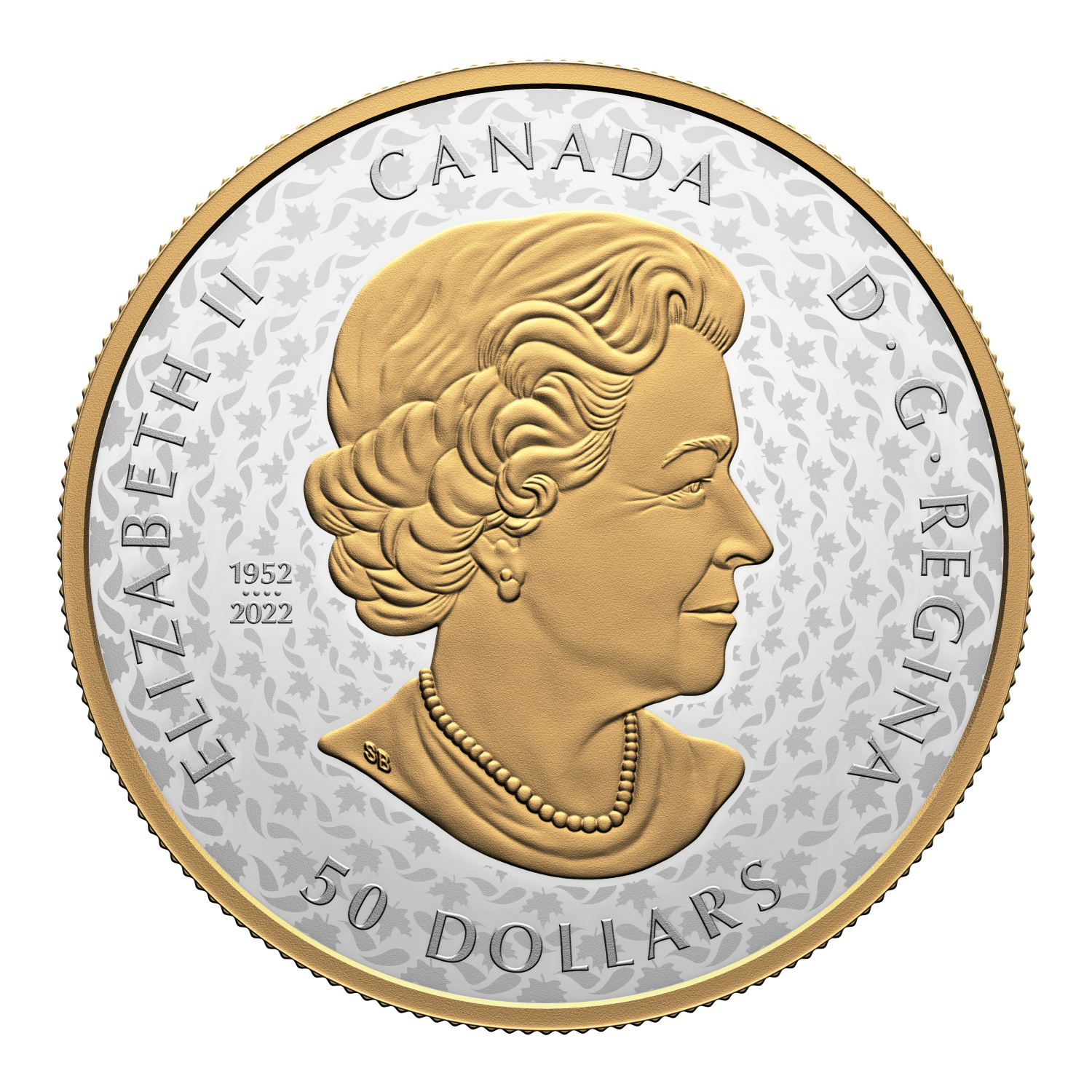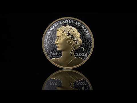 The Peace Dollar’s reverse features selective yellow gold plating and a new maple leaf with ribbon pattern behind the allegorical image of peace designed by retired RCM Senior Engraver Susan Taylor. Struck in Ultra High Relief (UHR), Lady Peace is depicted in profile with her hair crowned in a wreath of olive branches and maple leaves, which inspired the field pattern. She is flanked by her name “PAX” (the Latin word for “Peace”) and the year “2024”, while Canada’s national motto, “A MARI USQUE AD MARE” (“From sea to sea”) appears overhead. The obverse features selective yellow gold plating and the effigy of Queen Elizabeth II by Susanna Blunt. The obverse also bears a special marking that includes four pearls symbolizing the four effigies that have graced Canadian coins and the double date of her reign.