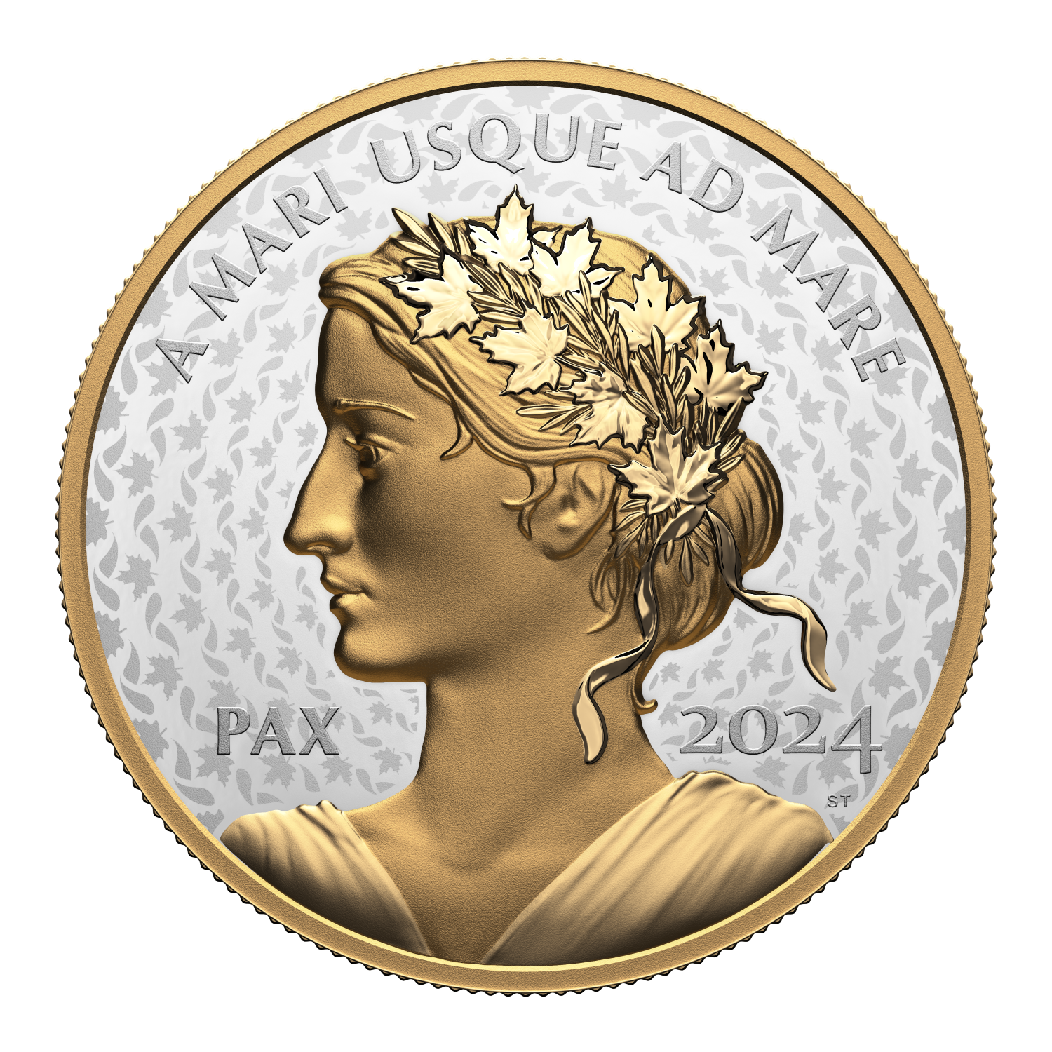 • The fifth Peace Dollar! Canada’s 5 oz. Peace Dollar is back for 2024! The coin’s reverse combines Ultra High Relief (UHR) with a custom field pattern, as well as yellow gold plating that elegantly enhances this Canadian portrait of peace (“PAX”).