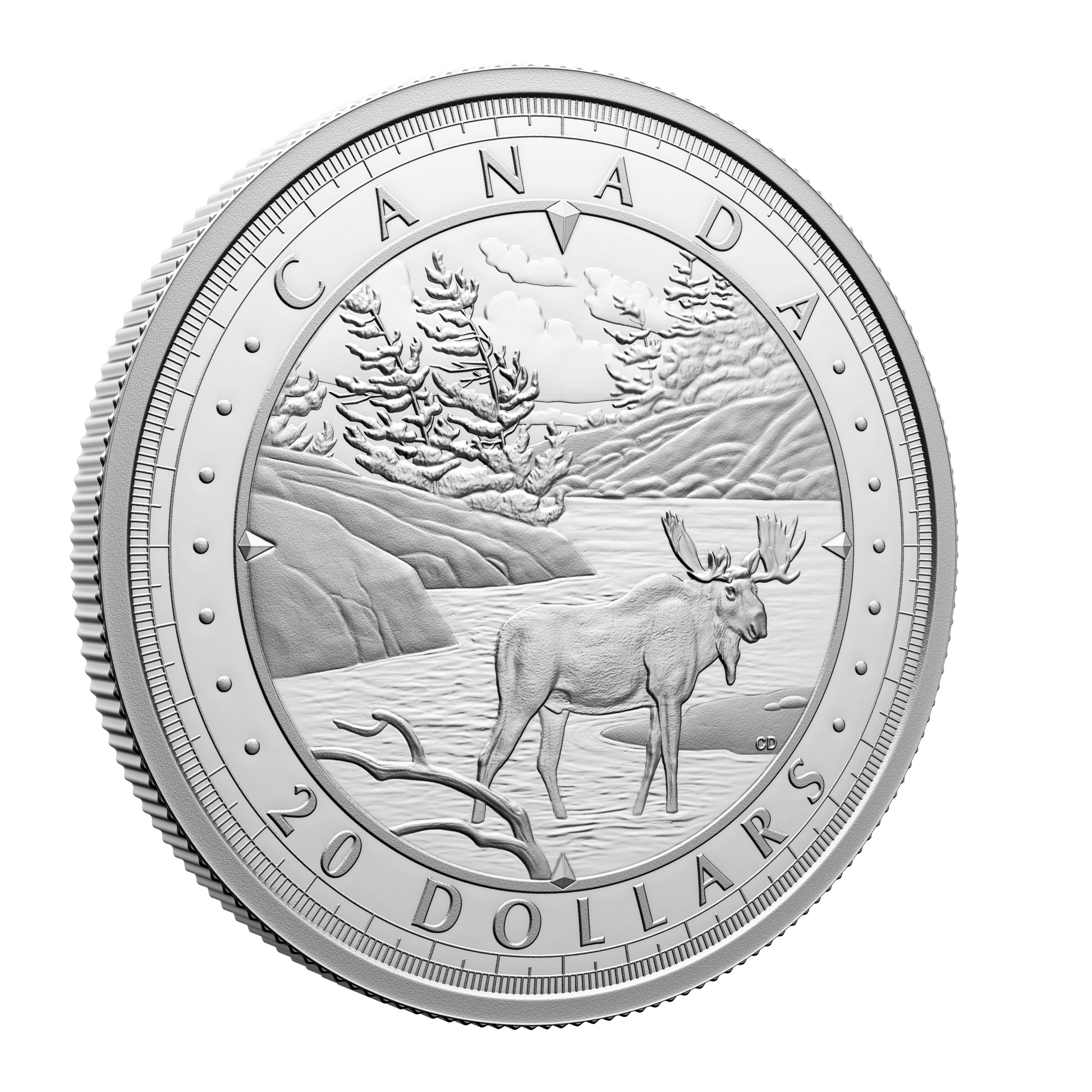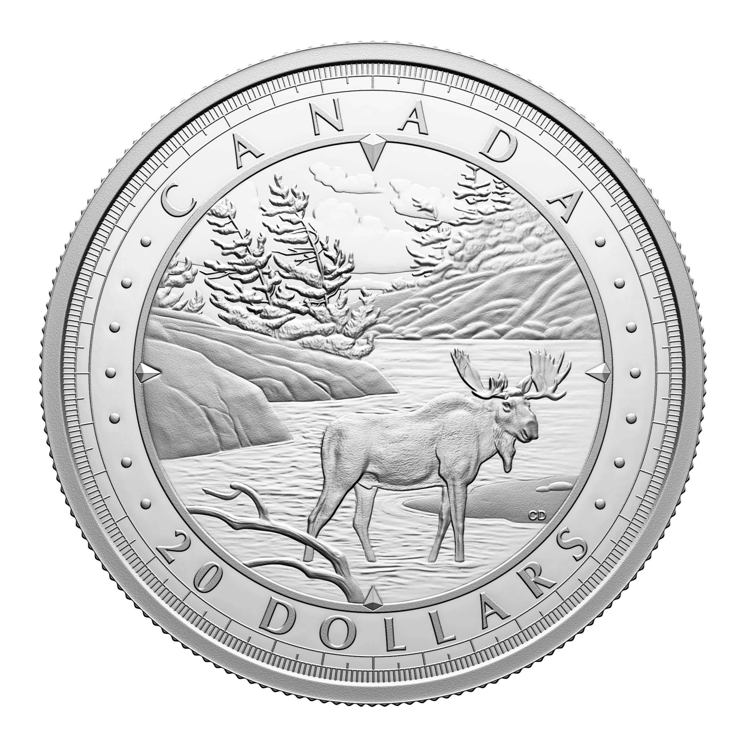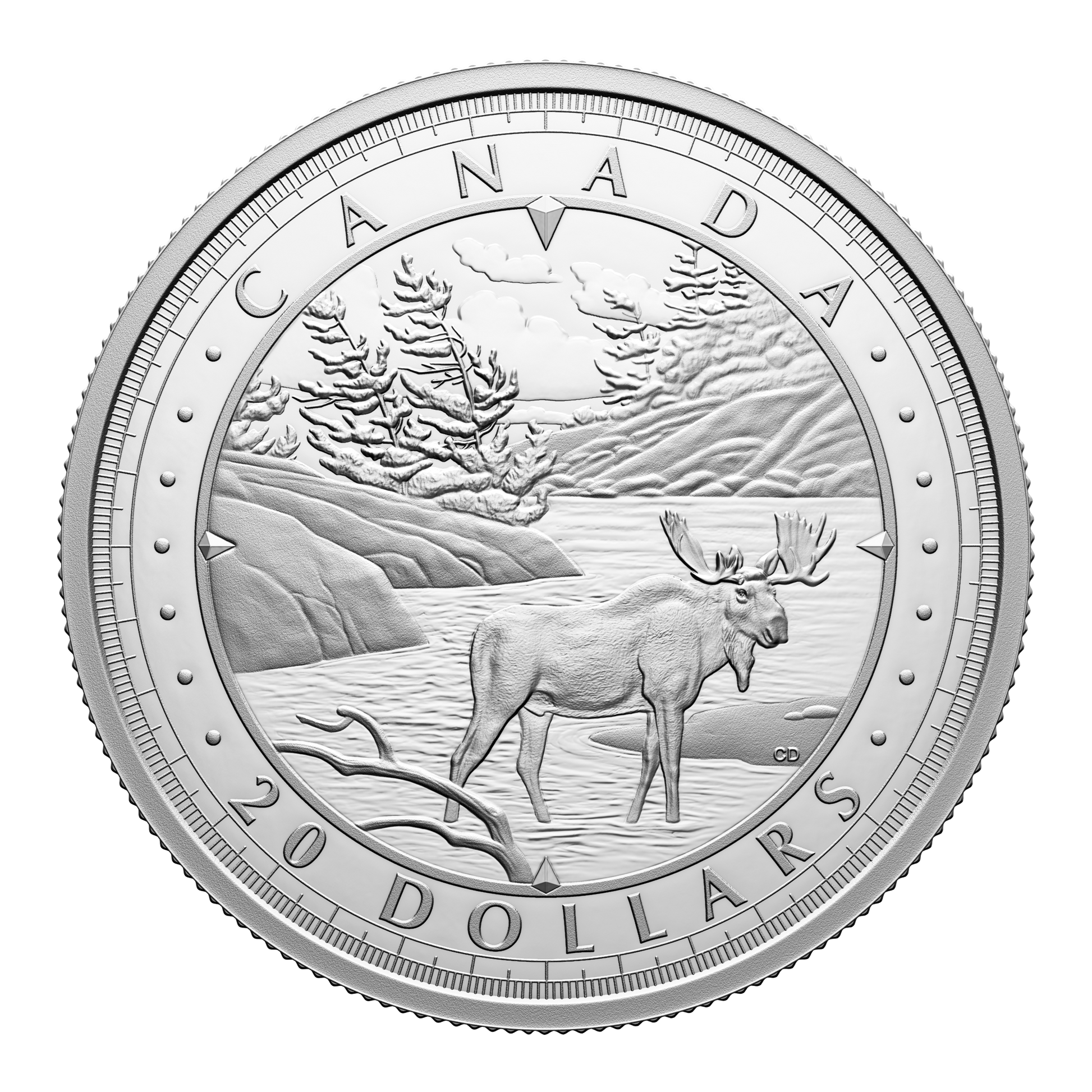 The coin’s reverse captures the iconic beauty of the landscapes and vistas of the Great Lakes. Designed by Claudio D’Angelo, the idyllic setting was inspired by the rugged shoreline of Georgian Bay, and the scene features a moose (Alces alces) standing in water between rocky islands topped with windswept pines. Compass elements form a frame that contains the word “CANADA” and a face value of “20 DOLLARS”. The obverse features the effigy of His Majesty King Charles III by Canadian artist Steven Rosati.