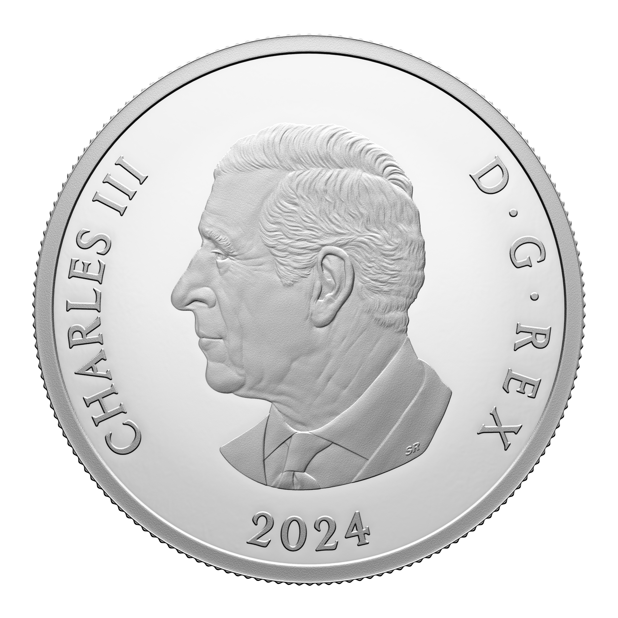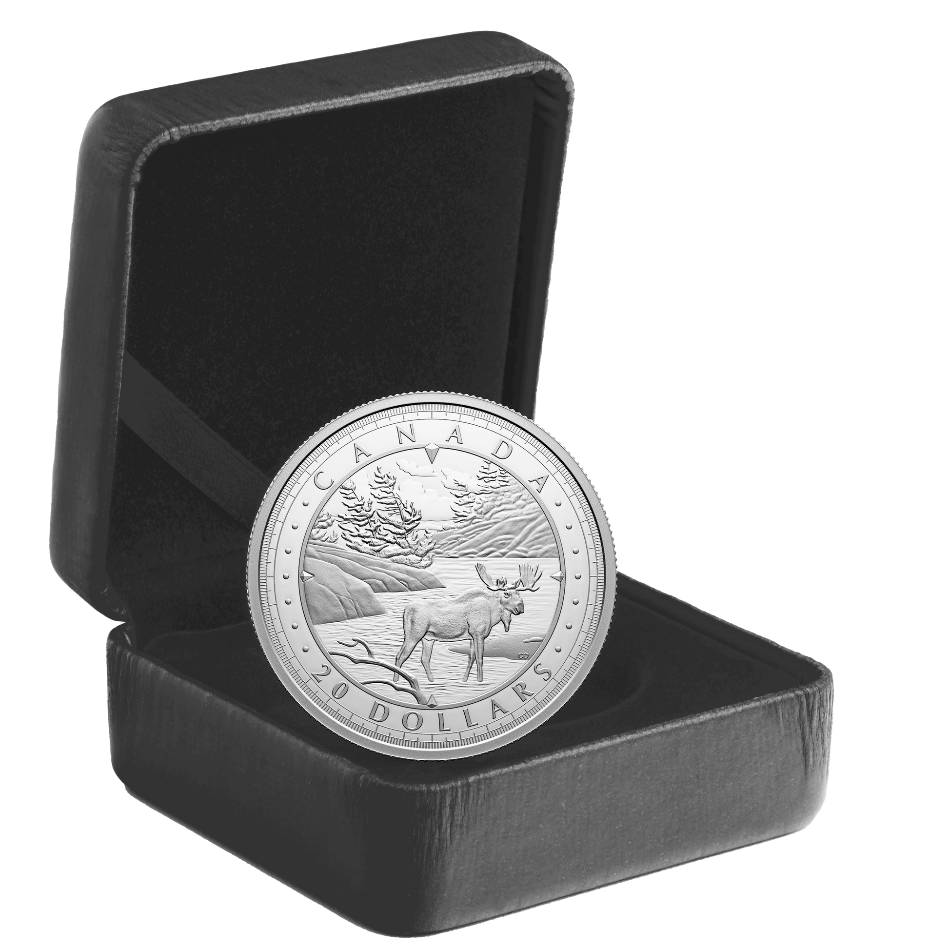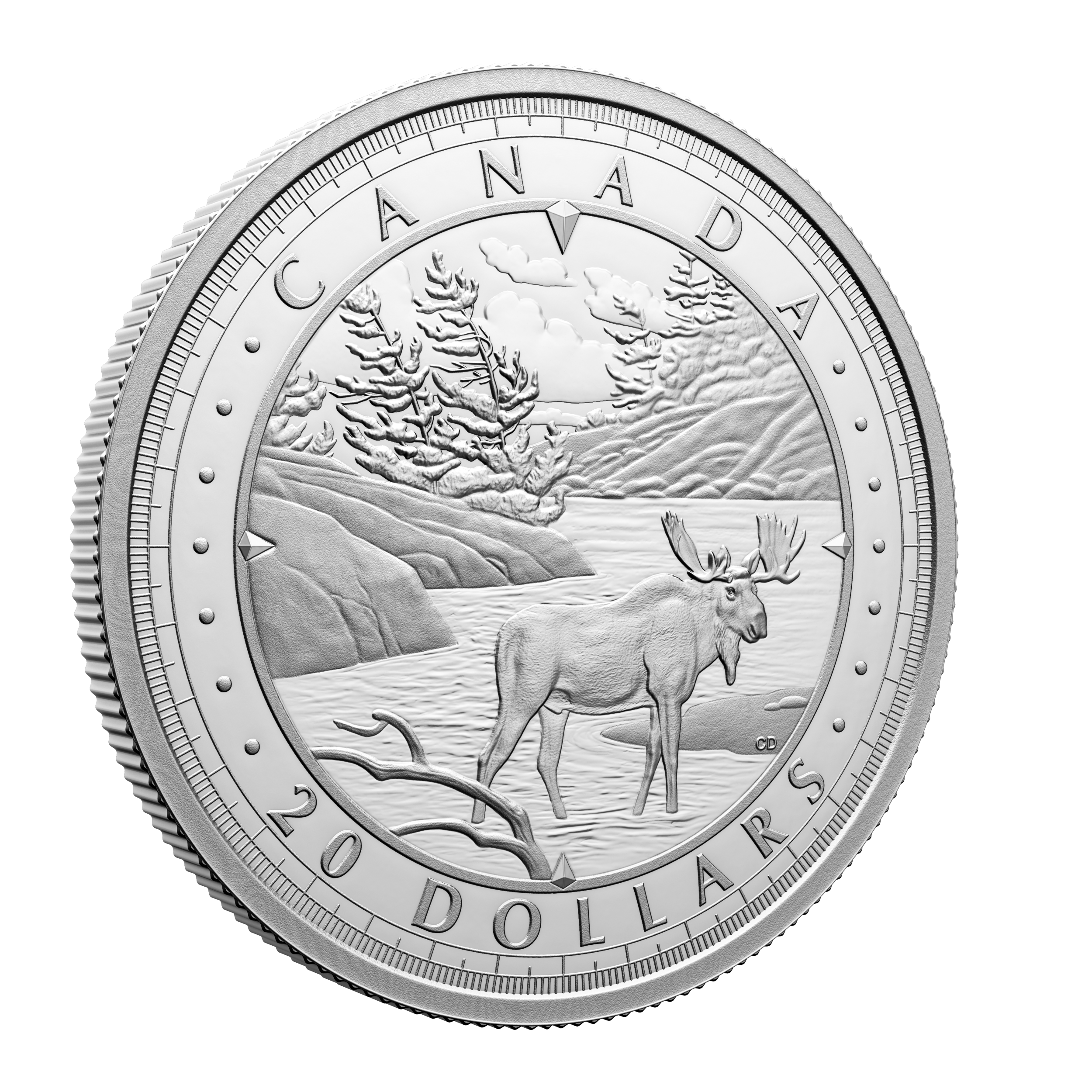 The coin’s reverse captures the iconic beauty of the landscapes and vistas of the Great Lakes. Designed by Claudio D’Angelo, the idyllic setting was inspired by the rugged shoreline of Georgian Bay, and the scene features a moose (Alces alces) standing in water between rocky islands topped with windswept pines. Compass elements form a frame that contains the word “CANADA” and a face value of “20 DOLLARS”. The obverse features the effigy of His Majesty King Charles III by Canadian artist Steven Rosati.