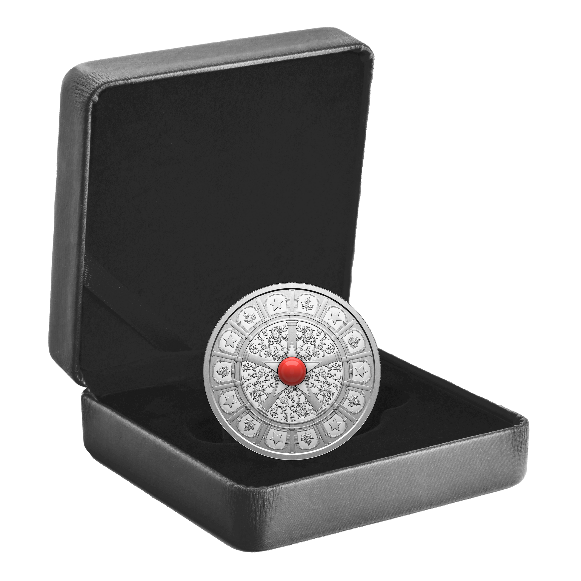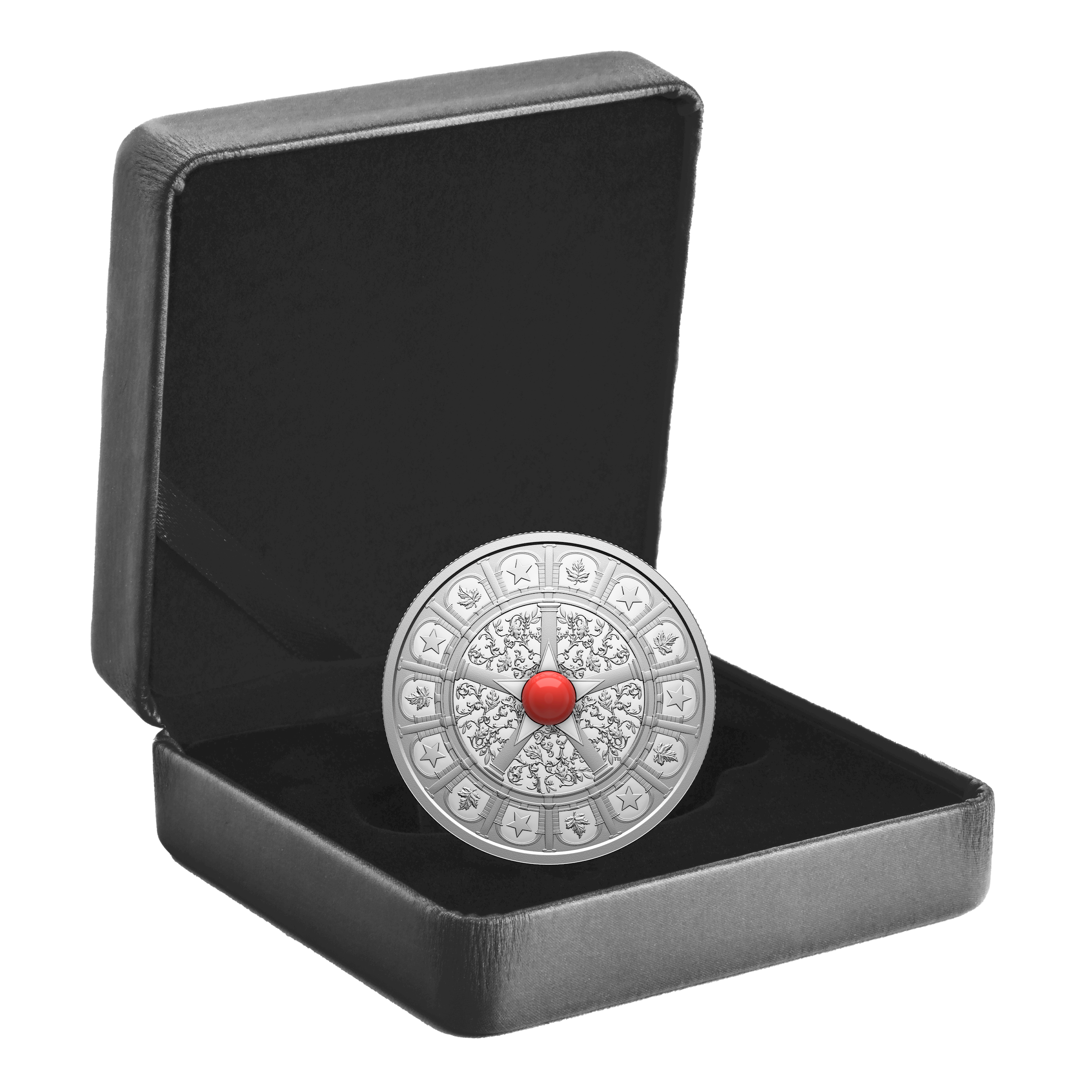 This 99.99% pure silver coin features a circular arrangement of elements that form a symbolic representation of the Italian-Canadian community. Framed by repeating emblems representing two cultures coming together, the five-pointed Stella d’Italia is adorned with simulated Italian red coral and positioned at the centre, similar to how it appears in the emblem of the Italian Republic. The emblem also inspired the Renaissance-style pattern appearing on both the reverse and obverse, where olive branches represent peace and abundance, and oak leaves symbolize strength.