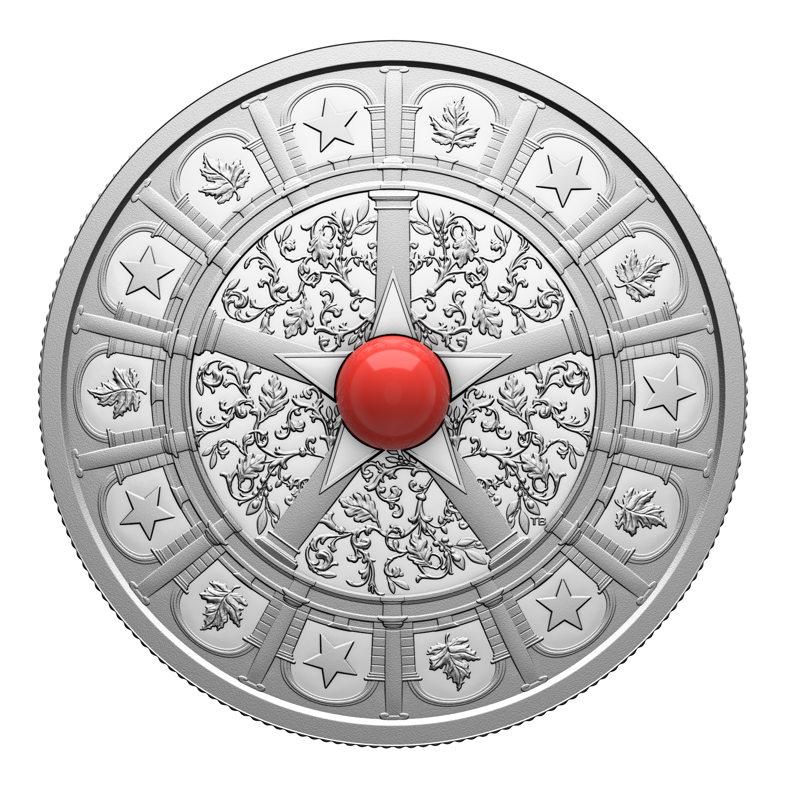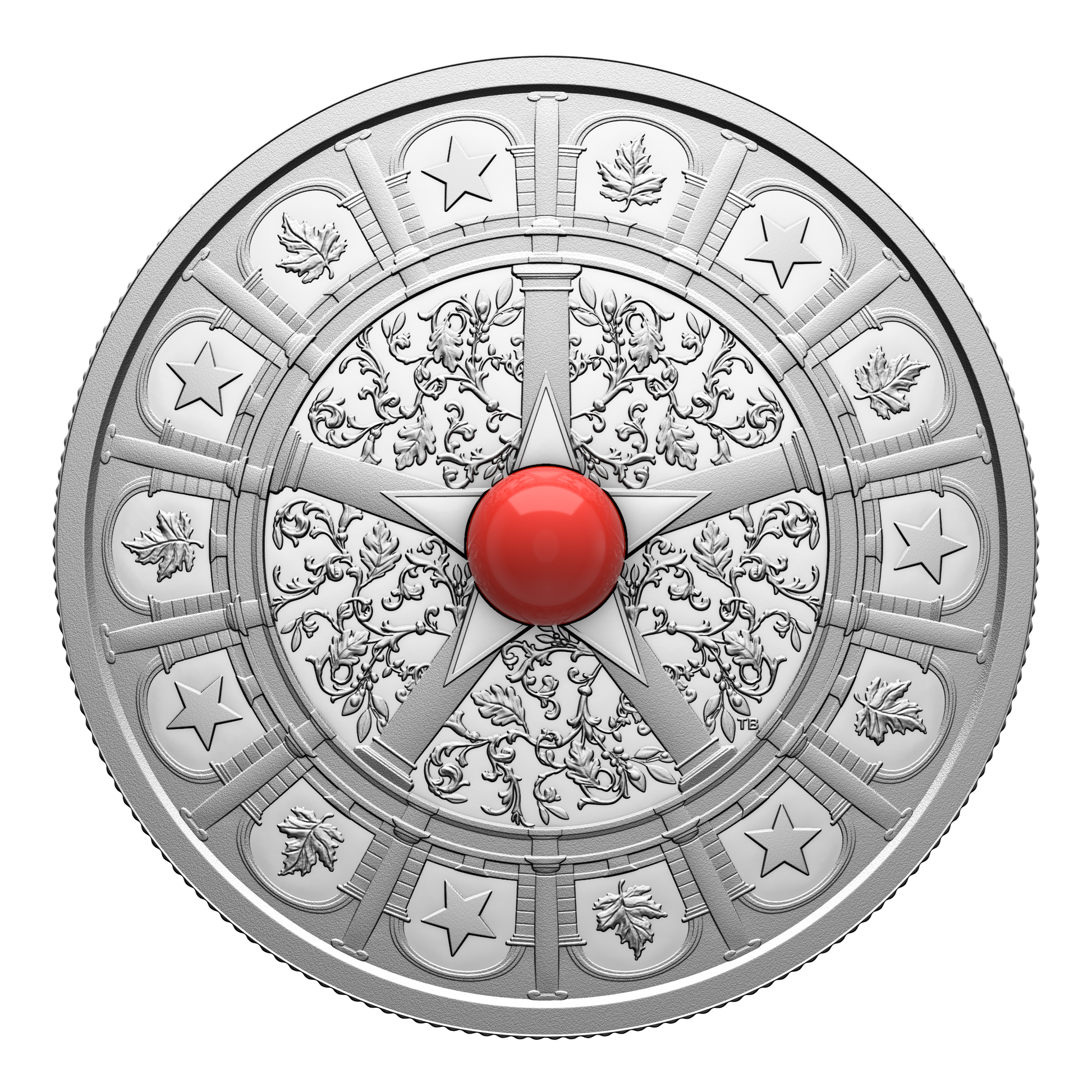 The reverse design by Canadian artist Tony Bianco combines design elements drawn from Italian heritage to form a symbolic representation of the Italian-Canadian community. It centres on the five-pointed symbol of Italy, the Stella d’Italia, which is topped with simulated Italian red coral. Between the Roman columns emanating from the star points, a Renaissance-style pattern includes two elements inspired by the emblem of the Italian Republic: the oak leaf that symbolizes strength, and the olive branch representing peace and abundance. The five columns support a row of arches that form the outer edge; inspired by the Roman Colosseum, these arches frame the repeating Stella d’Italia and the Canadian maple leaf that represent two cultures coming together. The obverse features the effigy of His Majesty King Charles III by Canadian artist Steven Rosati.