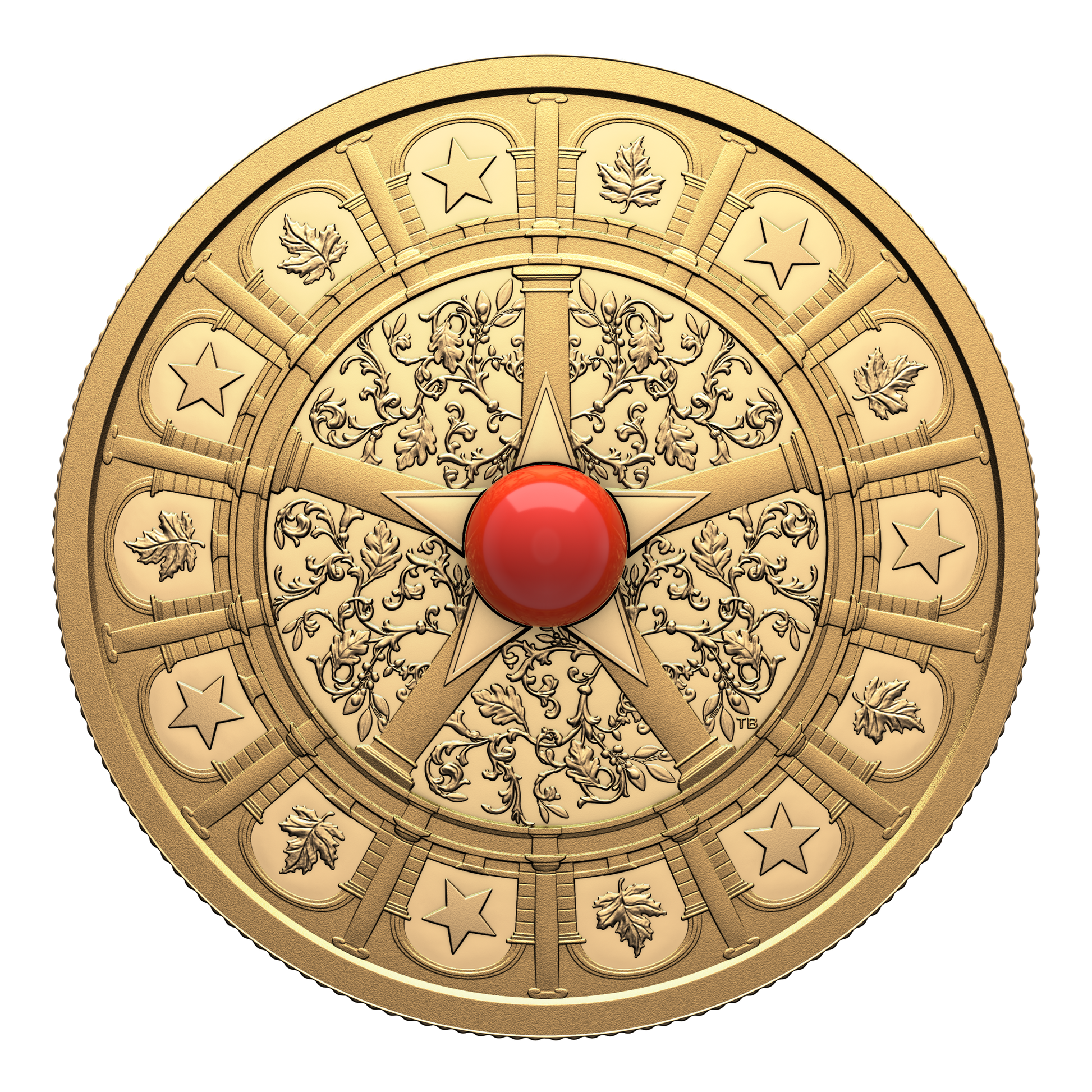 The reverse design by artist Tony Bianco combines design elements drawn from Italian heritage to form a symbolic representation of the Italian-Canadian community. It centres on the five-pointed symbol of Italy, the Stella d’Italia, which is topped with genuine Italian red coral. Between the Roman columns emanating from the star points, a Renaissance-style pattern includes two elements inspired by the emblem of the Italian Republic: the oak leaf that symbolizes strength, and the olive branch representing peace and abundance. The five columns support a row of arches that form the outer edge; inspired by the Roman Colosseum, these arches frame the repeating Stella d’Italia and the Canadian maple leaf that represent two cultures coming together. The obverse features the effigy of His Majesty King Charles III by Canadian artist Steven Rosati.