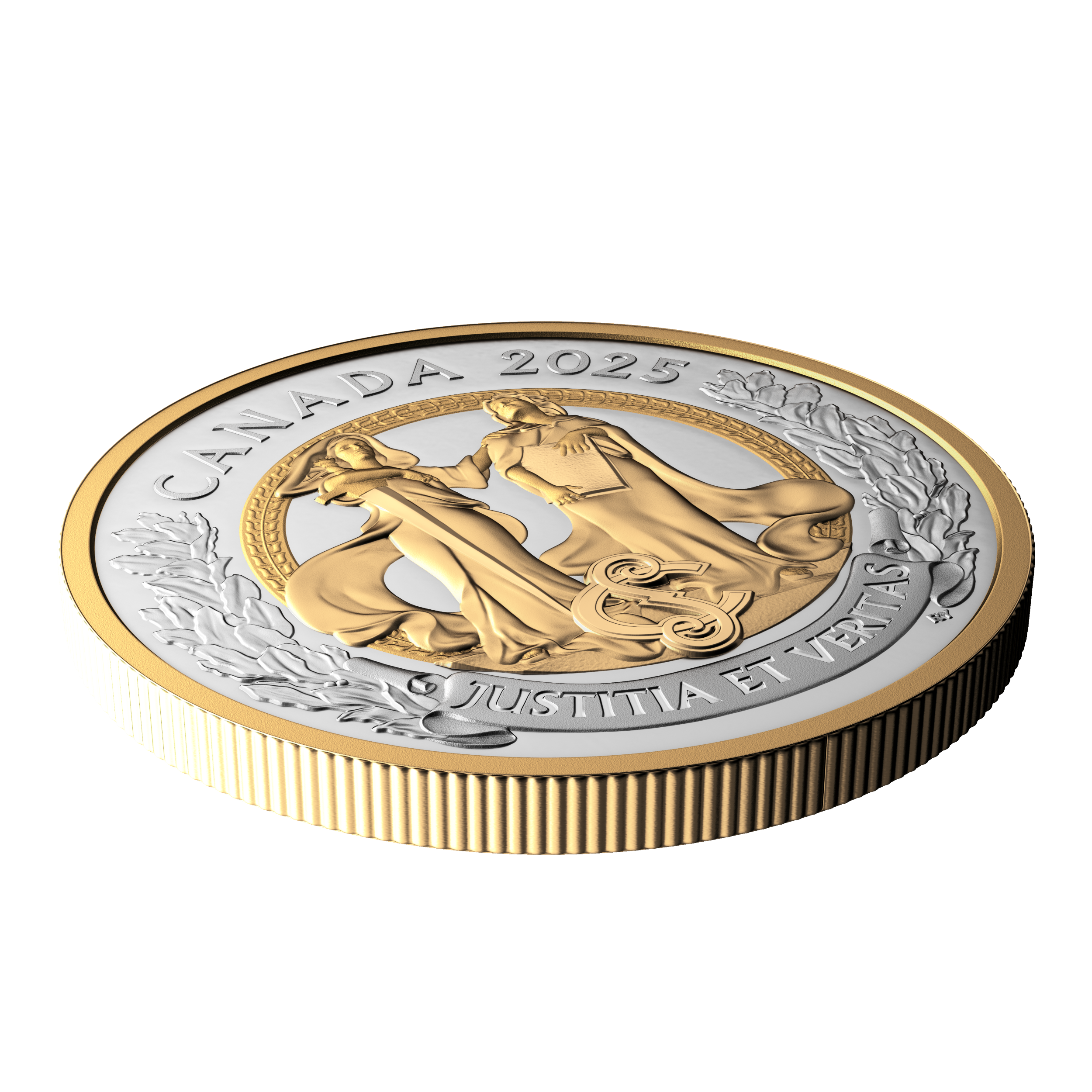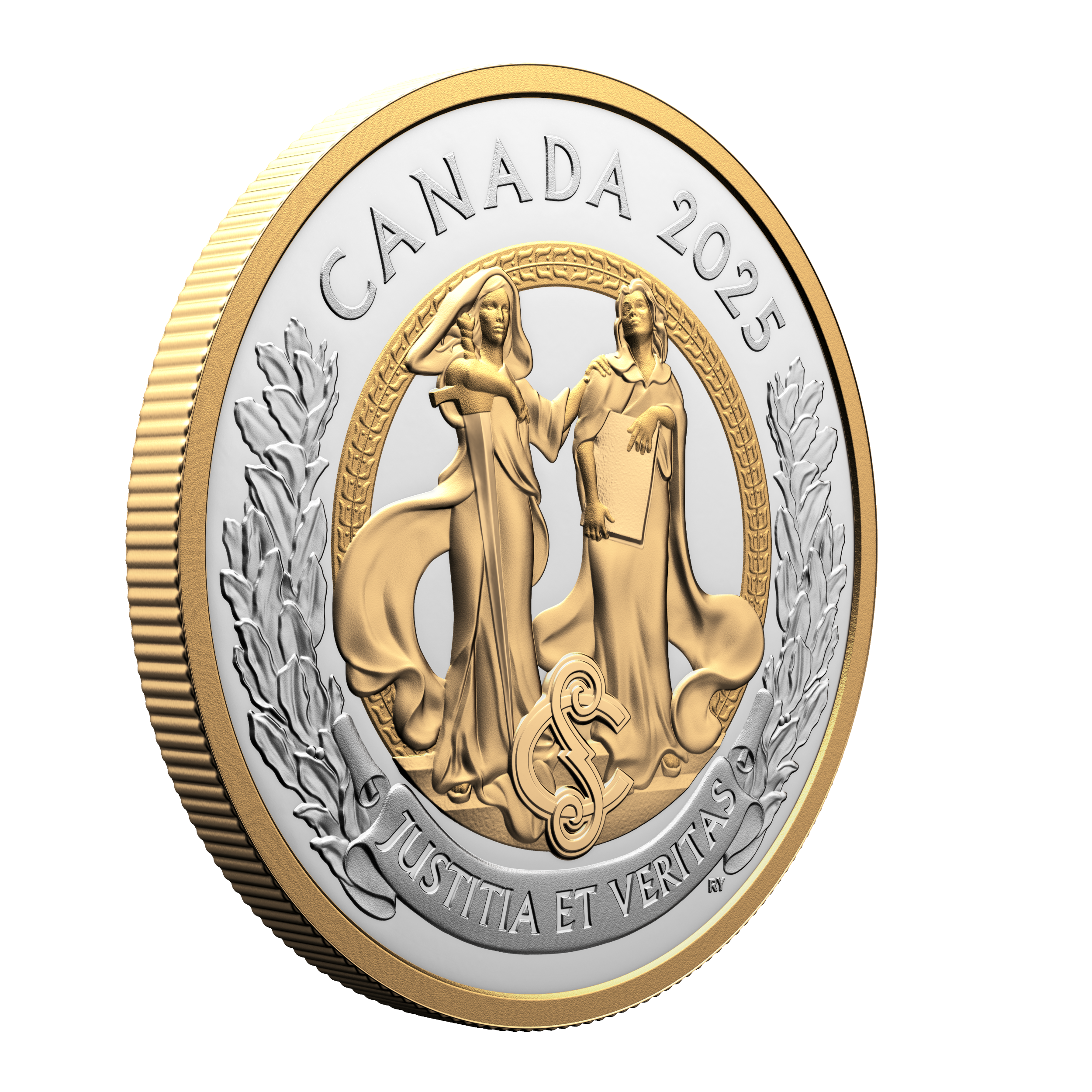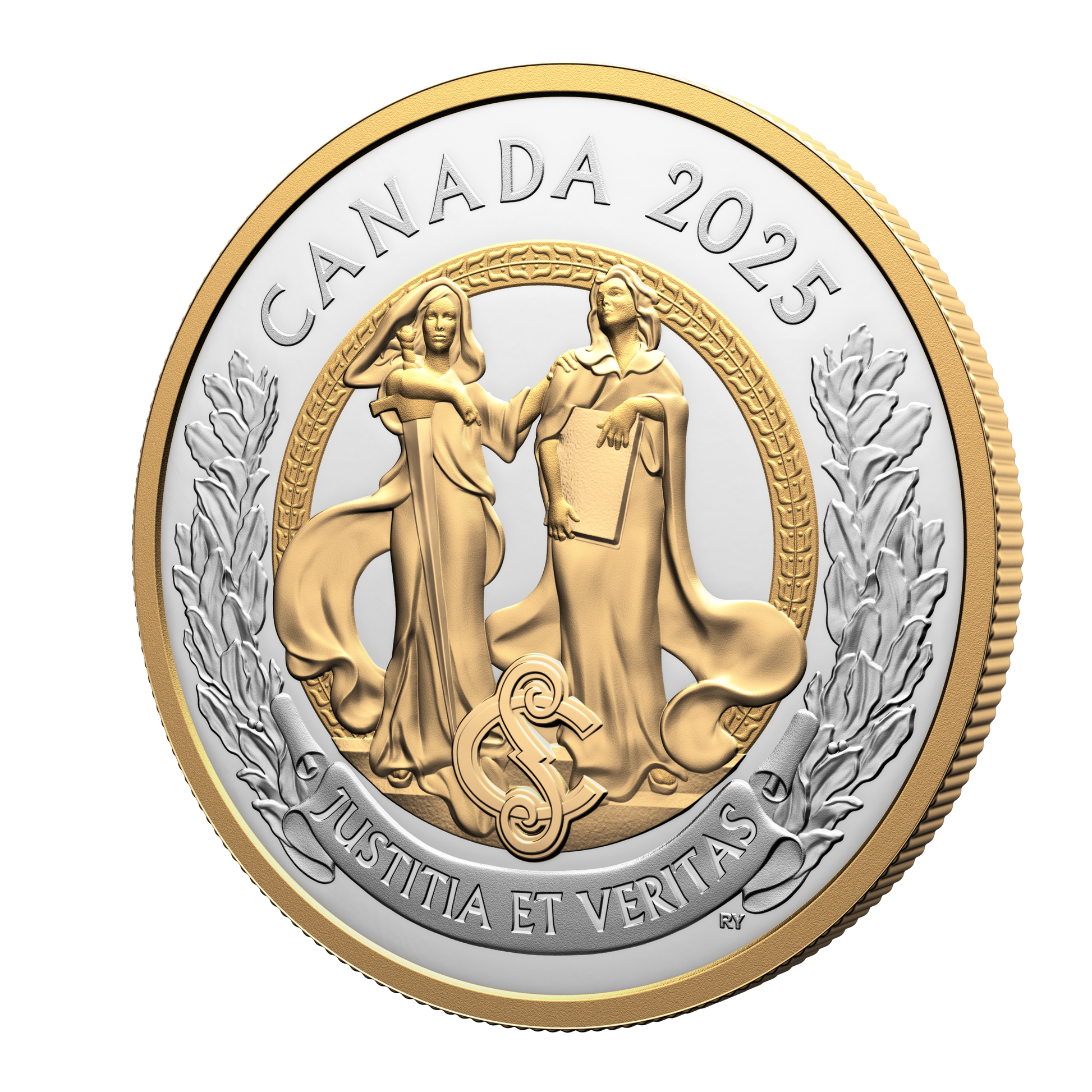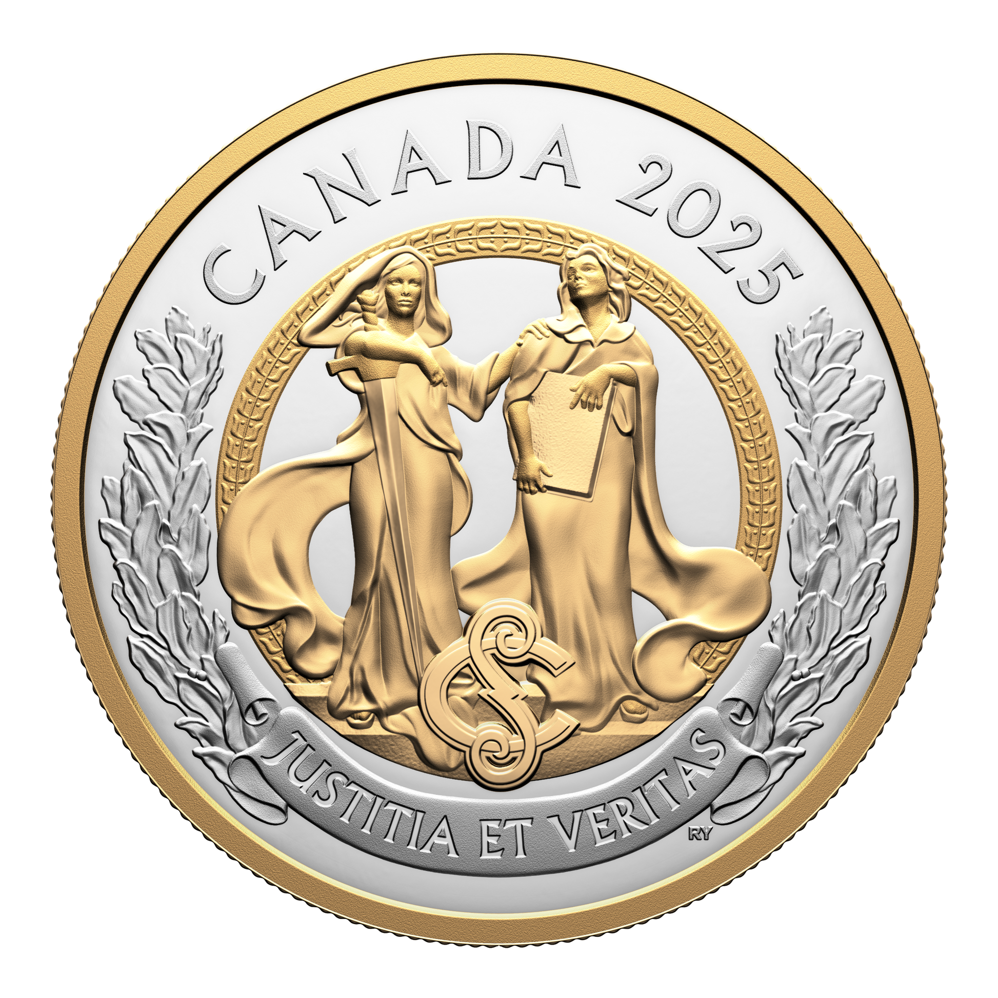 The coin’s reverse is an engraved version of the 3D allegorical representations of Justice and Truth featured on the 2025 $50 Allegories of Justice and Truth coin designed by Canadian artist Rebecca Yanovskaya. Inspired by Walter S. Allward’s statues Ivstitia (Justice) and Veritas (Truth) located in front of the Supreme Court of Canada building in Ottawa, the gold-plated figures of Justice and Truth are surrounded by a laurel wreath while standing on a podium marked with the letters “SC” (for “Supreme Court”)—a nod to the Cormier Emblem, the Supreme Court’s historic badge, on the institution’s 150th anniversary. The emblem also inspired the laurel wreath that encircles Justice and Truth, who has extended her arm to support Truth while holding forth the Sword of Justice. On the outer ring, laurel branches unfurl around the figures, protecting and emboldening them to fulfill their purpose, while a scroll banner bears the words “JUSTITIA ET VERITAS”—the name of the allegories, but also the Court’s motto. The obverse features the gold-plated effigy of His Majesty King Charles III by Canadian artist Steven Rosati.