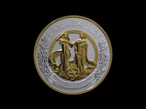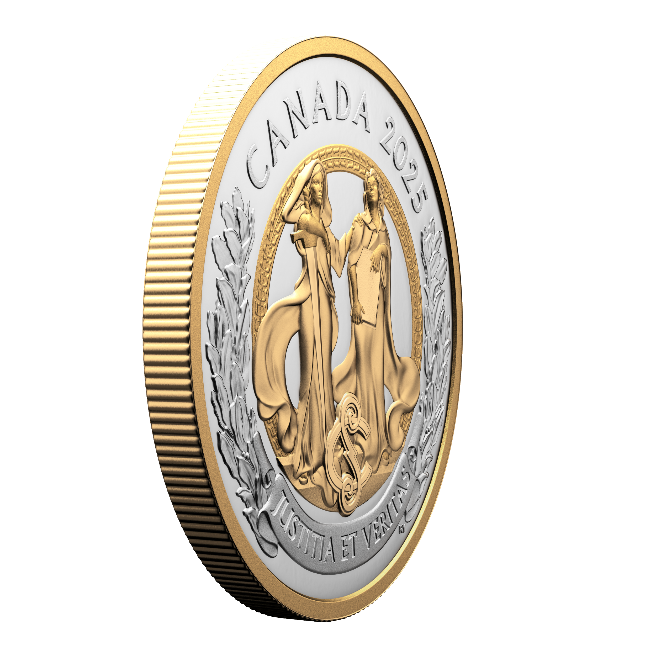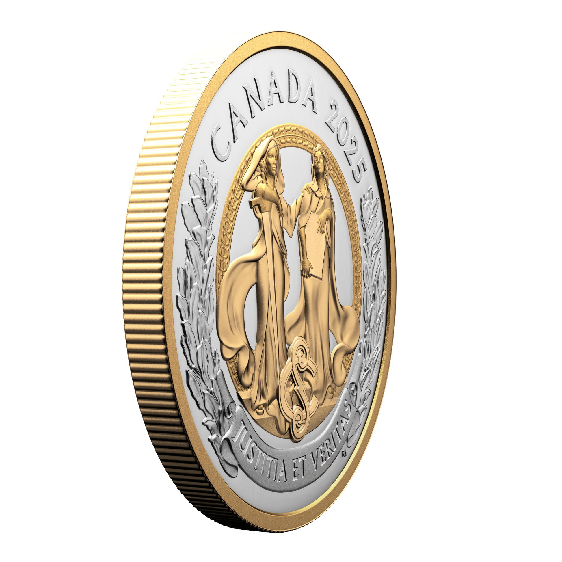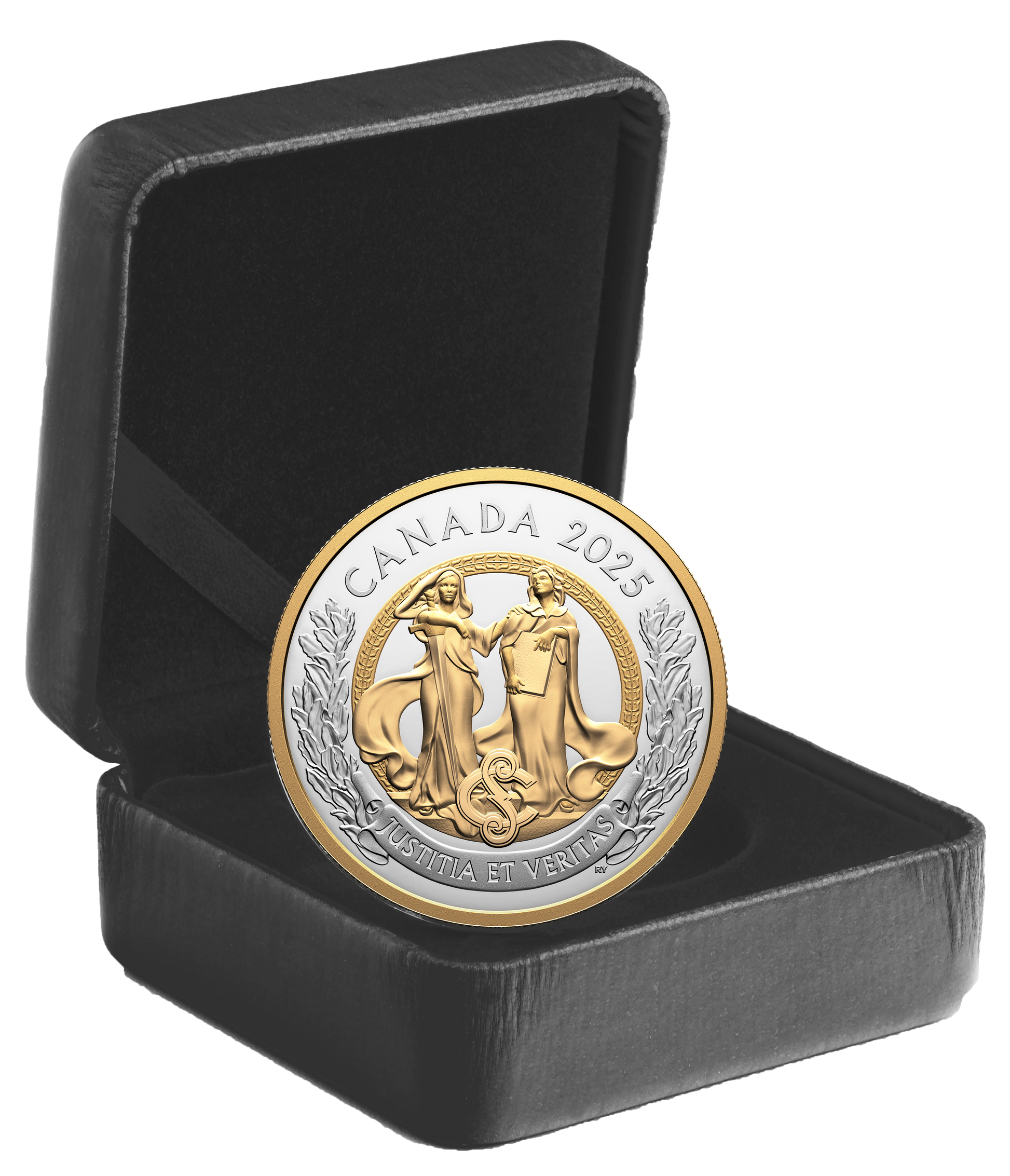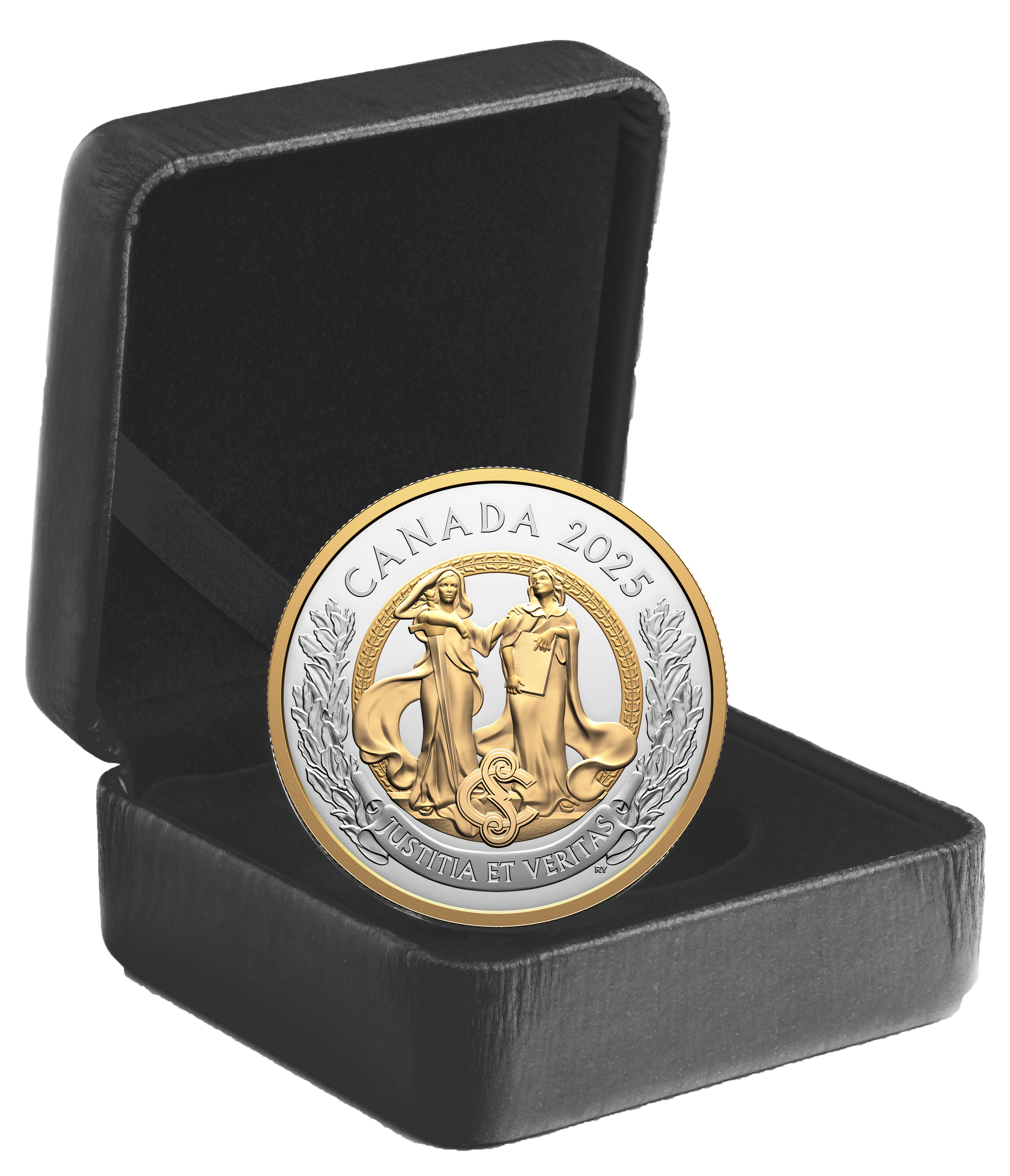 The coin’s reverse is an engraved version of the 3D allegorical representations of Justice and Truth featured on the 2025 $50 Allegories of Justice and Truth coin designed by Canadian artist Rebecca Yanovskaya. Inspired by Walter S. Allward’s statues Ivstitia (Justice) and Veritas (Truth) located in front of the Supreme Court of Canada building in Ottawa, the gold-plated figures of Justice and Truth are surrounded by a laurel wreath while standing on a podium marked with the letters “SC” (for “Supreme Court”)—a nod to the Cormier Emblem, the Supreme Court’s historic badge, on the institution’s 150th anniversary. The emblem also inspired the laurel wreath that encircles Justice and Truth, who has extended her arm to support Truth while holding forth the Sword of Justice. On the outer ring, laurel branches unfurl around the figures, protecting and emboldening them to fulfill their purpose, while a scroll banner bears the words “JUSTITIA ET VERITAS”—the name of the allegories, but also the Court’s motto. The obverse features the gold-plated effigy of His Majesty King Charles III by Canadian artist Steven Rosati.