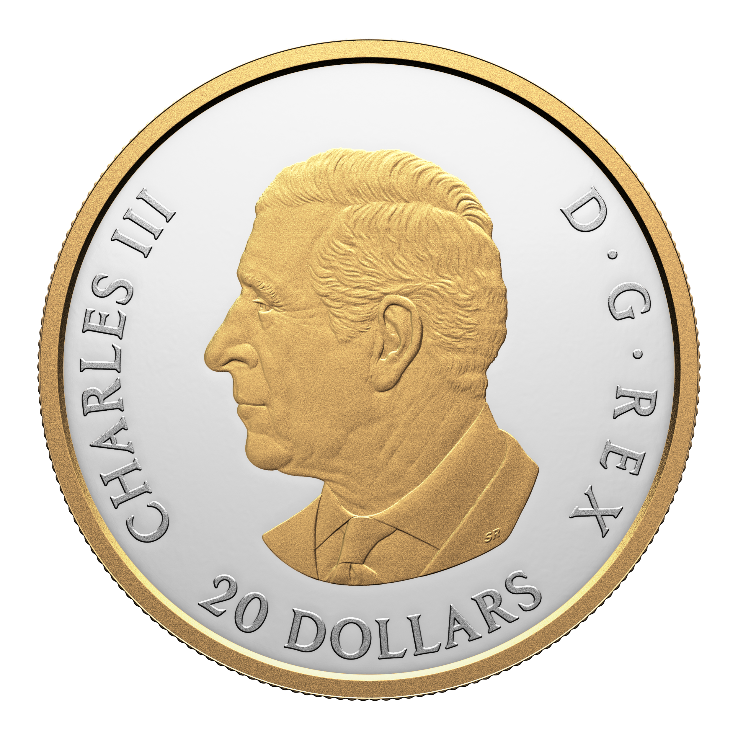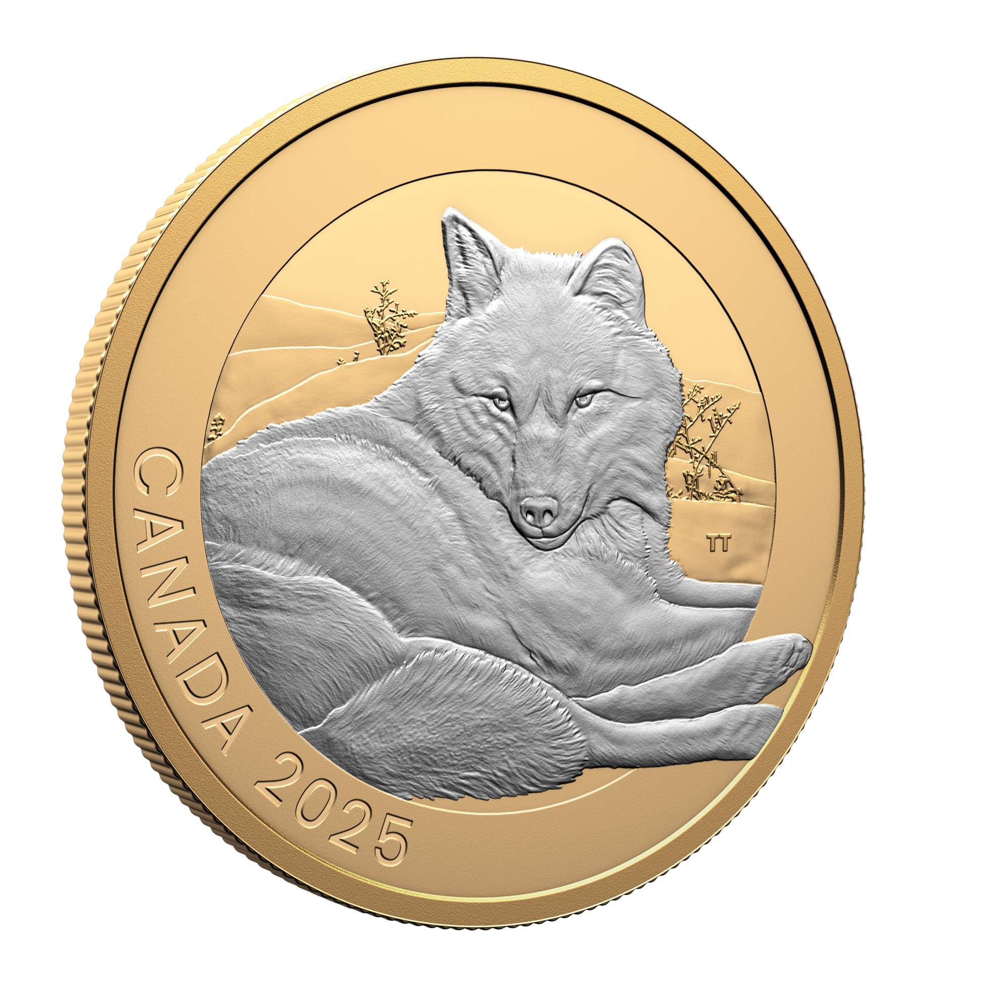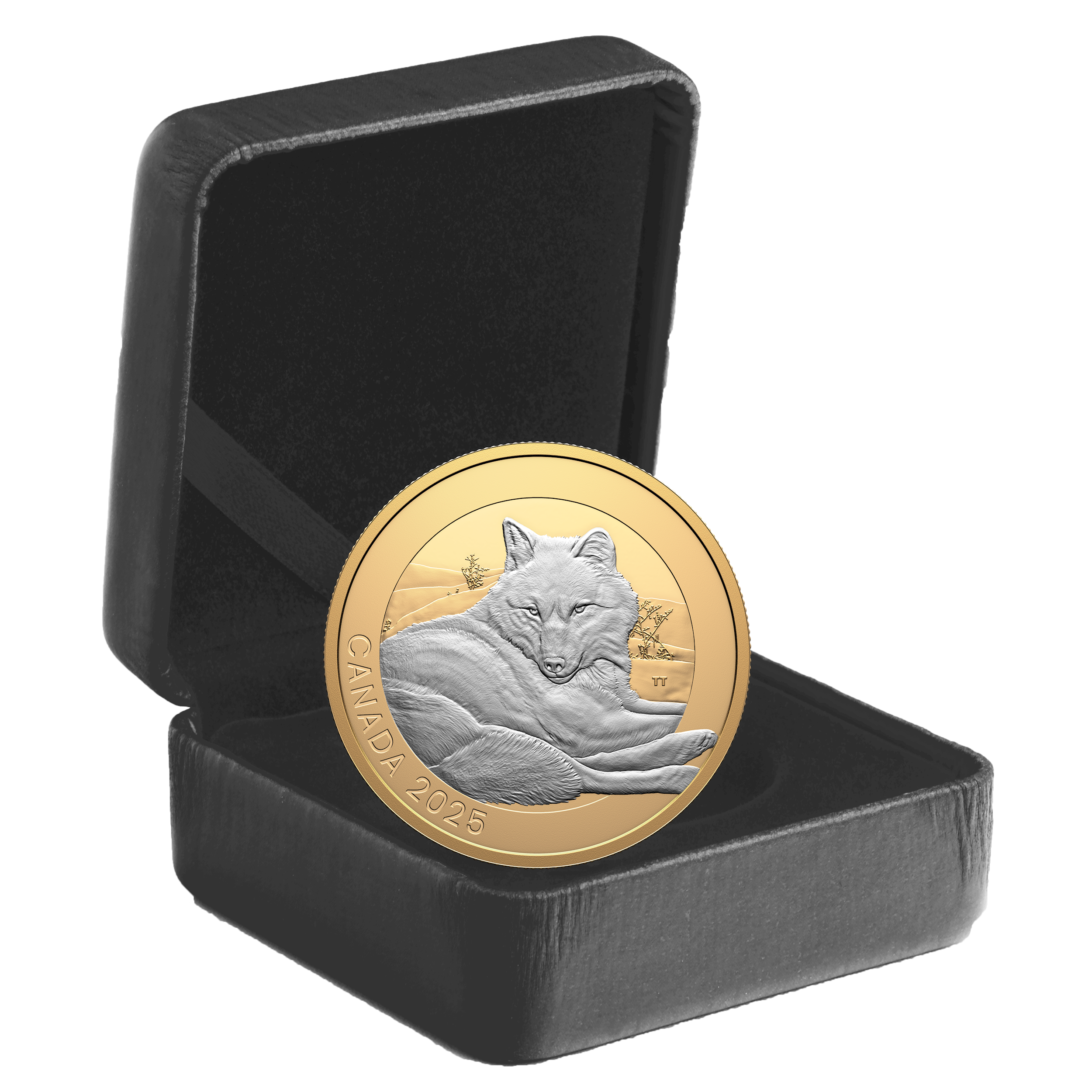 The reverse design by artist Trevor Tennant features the grey wolf (Canis lupus) presented in a tranquil, subdued pose. Resting in a wintry Ontario landscape and surrounded by yellow gold plating, the wolf extends its forepaws onto the outer portion where “CANADA” and “2025” are engraved. The obverse features the gold-plated effigy of His Majesty King Charles III by Canadian artist Steven Rosati.