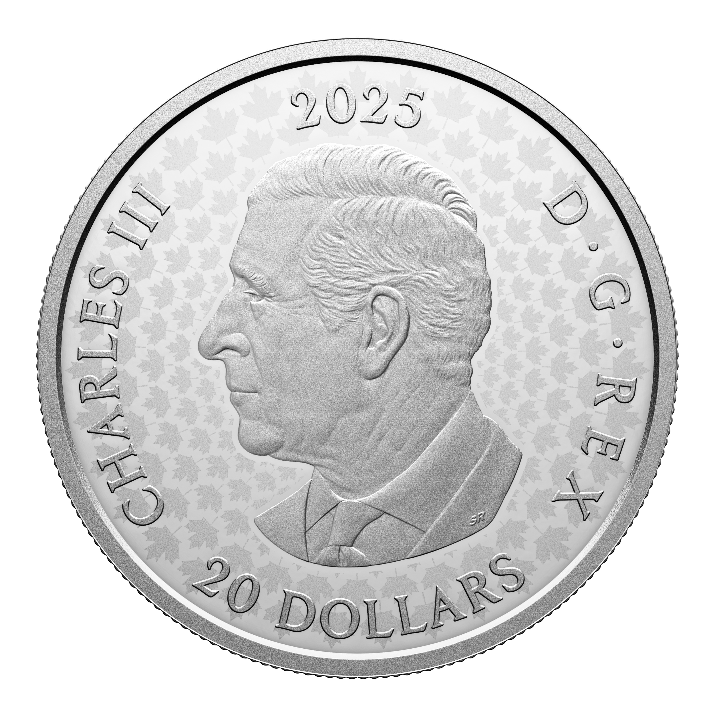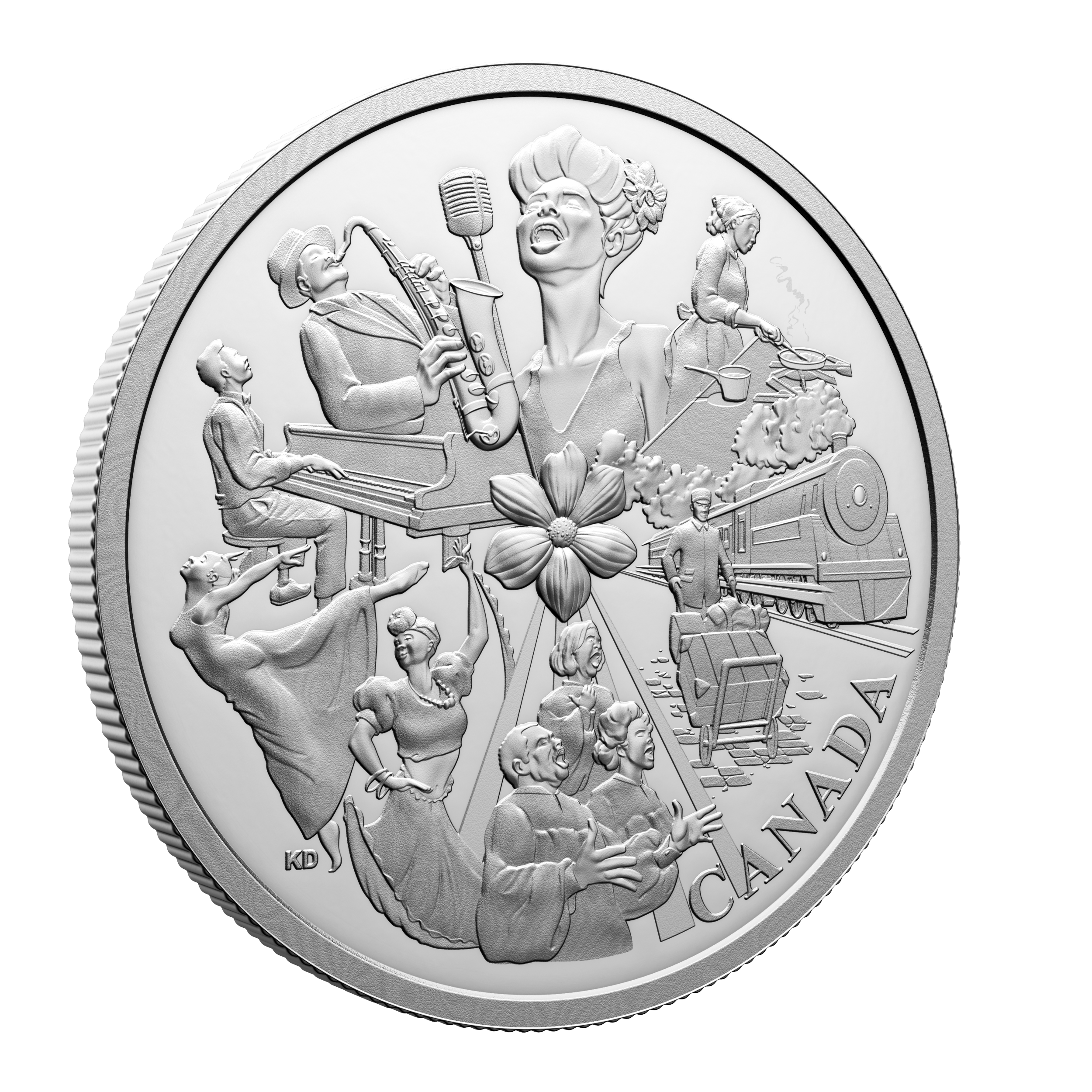 The reverse design by Canadian artist Kwame Delfish represents the spirit of Hogan’s Alley, Vancouver’s first Black community and a once-thriving cultural hub during the 20th century. While British Columbia’s provincial flower, the Pacific Dogwood (Cornus nuttallii), lies at the centre, the surrounding images reflect the character and vibrancy of the neighbourhood (starting at the one o’clock position and moving clockwise): a cook at one of the women-owned chicken house restaurants; a Black railway sleeping car porter; a choir representing the African Methodist Episcopal (AME) Fountain Chapel, Vancouver’s first Black church; and two different types of dancers, as well as a pianist, saxophonist and singer, all representing the incredible talent that was regularly on display in the community’s nightclubs and speakeasies. The obverse features a maple leaf pattern and the effigy of His Majesty King Charles III by Canadian artist Steven Rosati.
