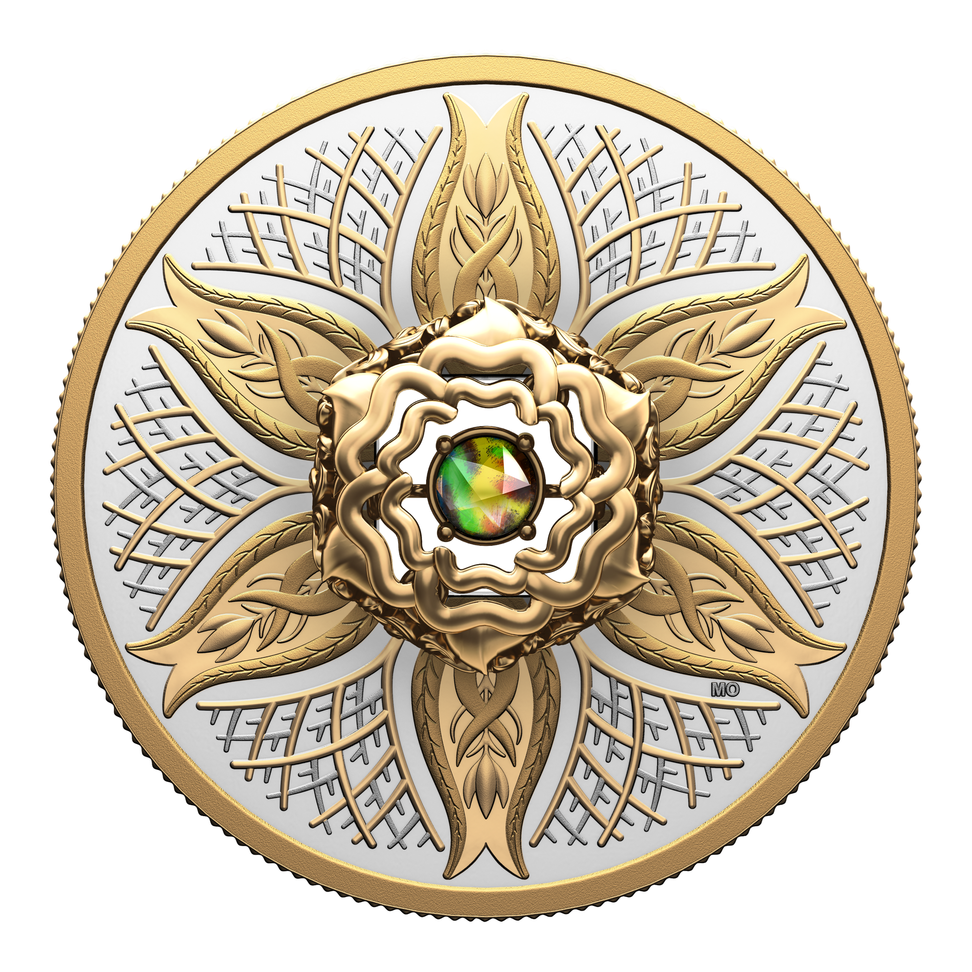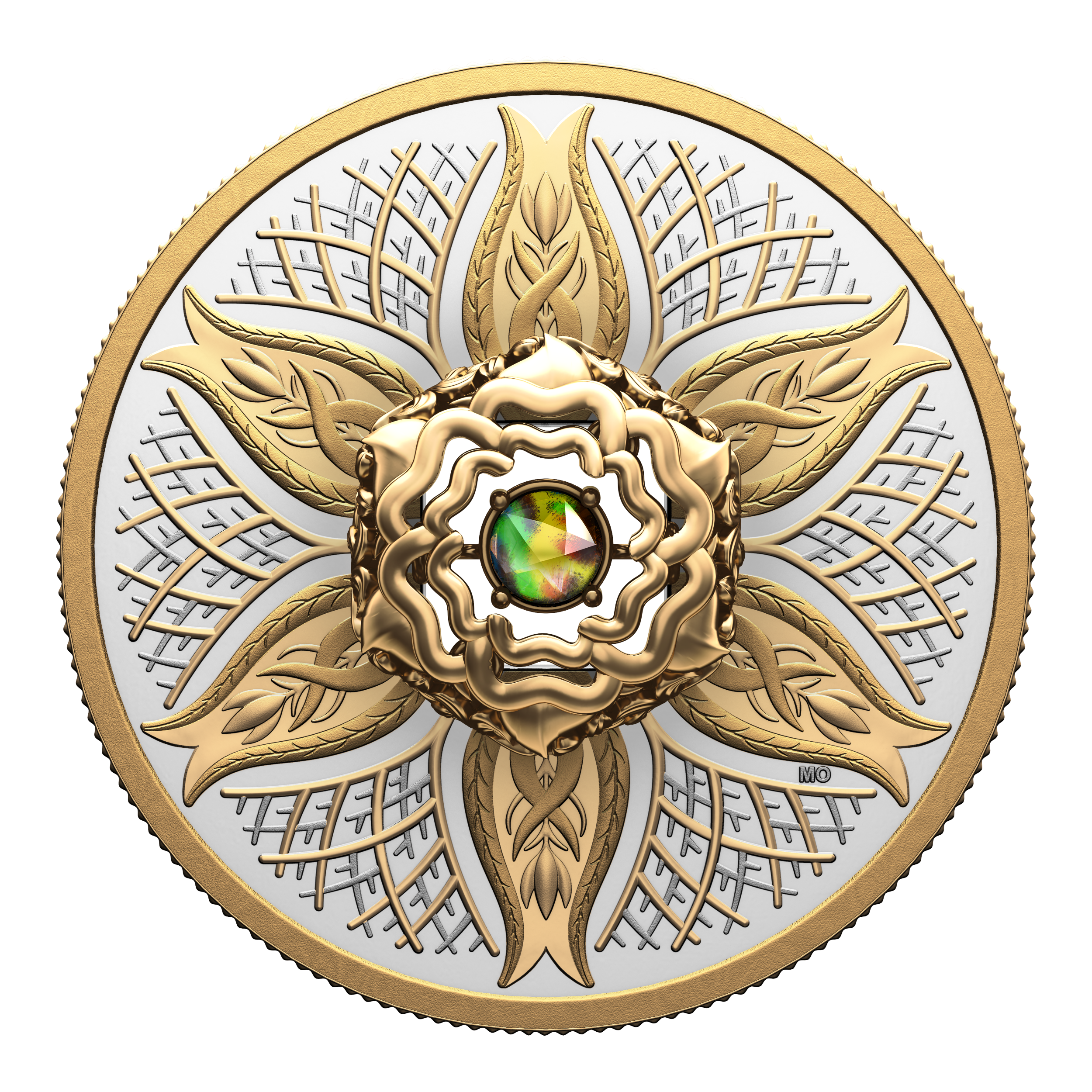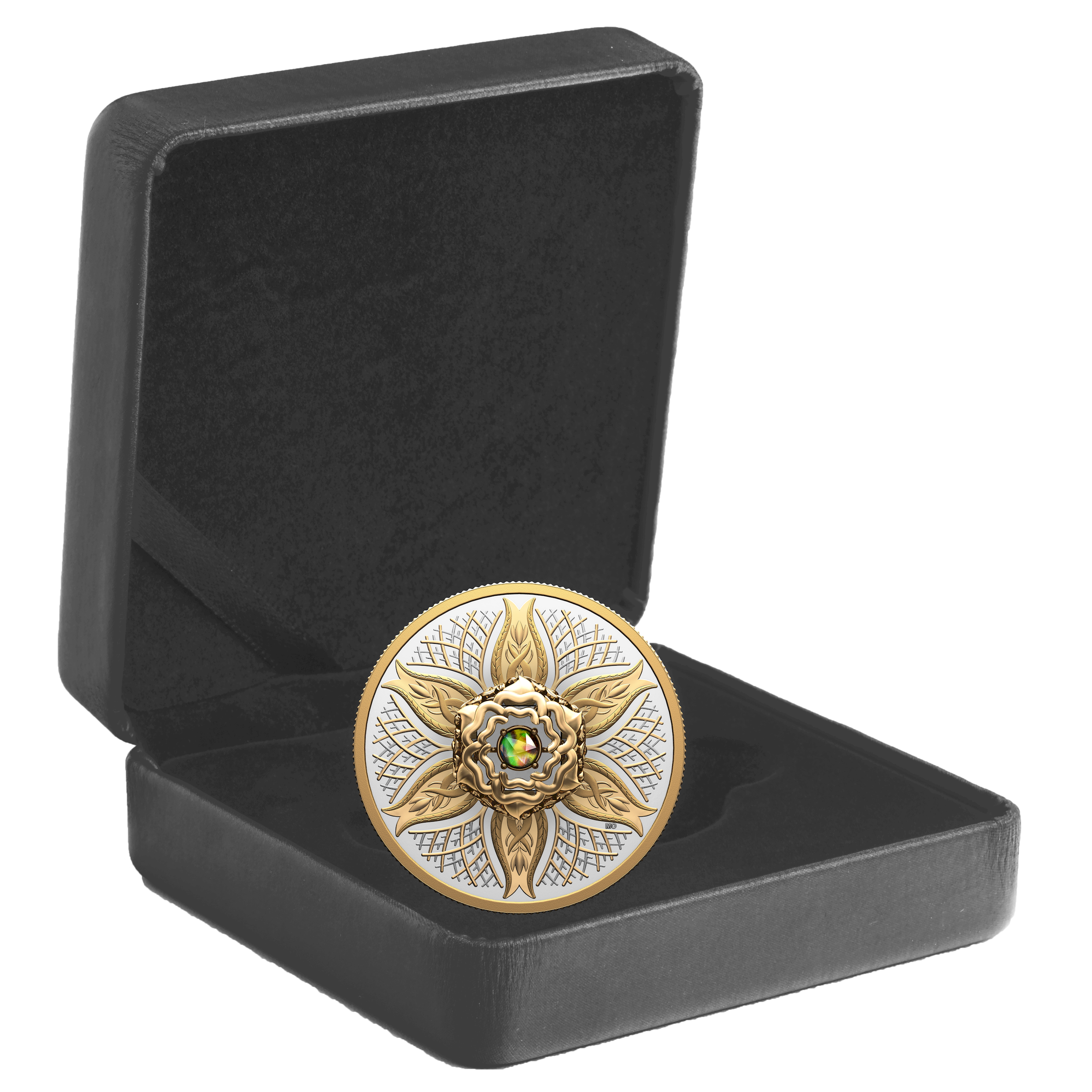 From the Royal Canadian Mint, the second Dancing Ammolite coin continues the series’ celebration of nature’s most fundamental elements by focusing on the one that grounds and nourishes us all: Earth. The life-sustaining element that lies beneath our feet is beautifully represented here by the blossoming motif that evokes nature’s cyclical rebirth and renewal, and by the branches and roots that are symbolic of steadfast, enduring growth. Selectively plated with yellow gold on the coin’s reverse, these engraved elements surround the ammolite mounted at the centre, where the rare Canadian gemstone embodies the rhythm of life, bouncing and flashing its lively colours with every movement.