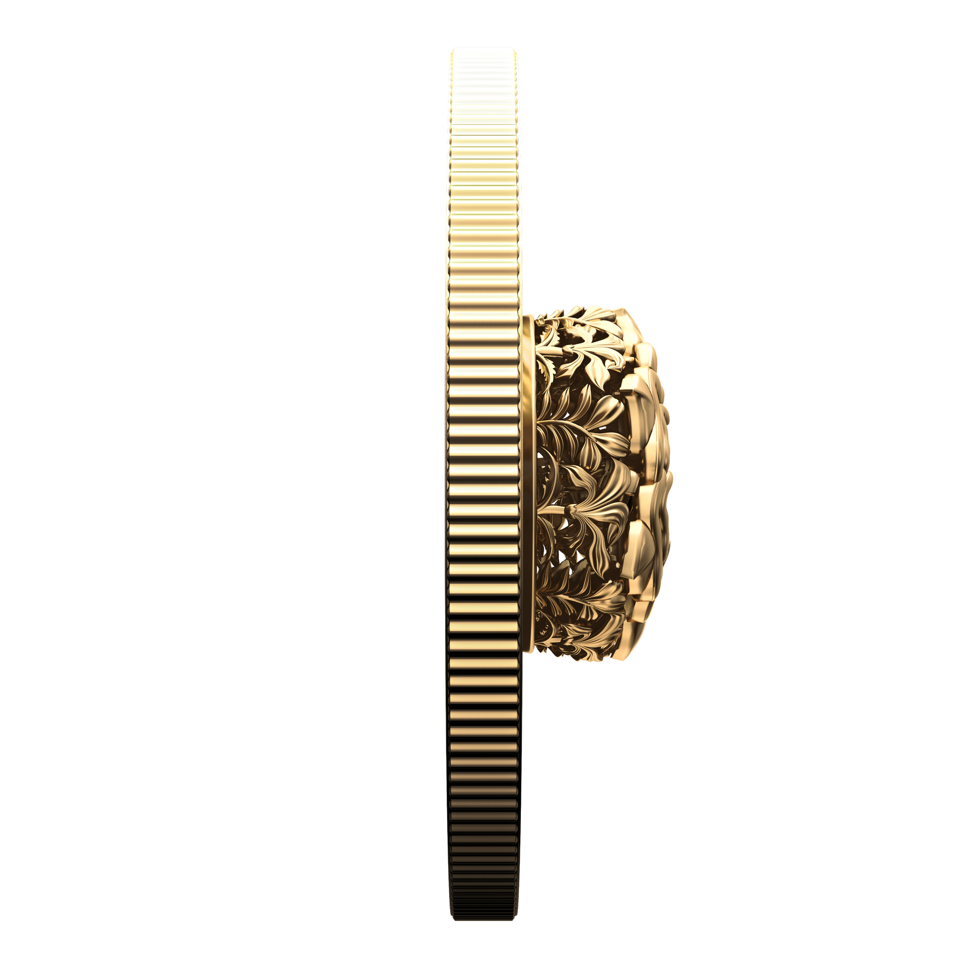 - Earth as a grounding force and a vital source of sustenance is also represented in the engraved flora-themed design.