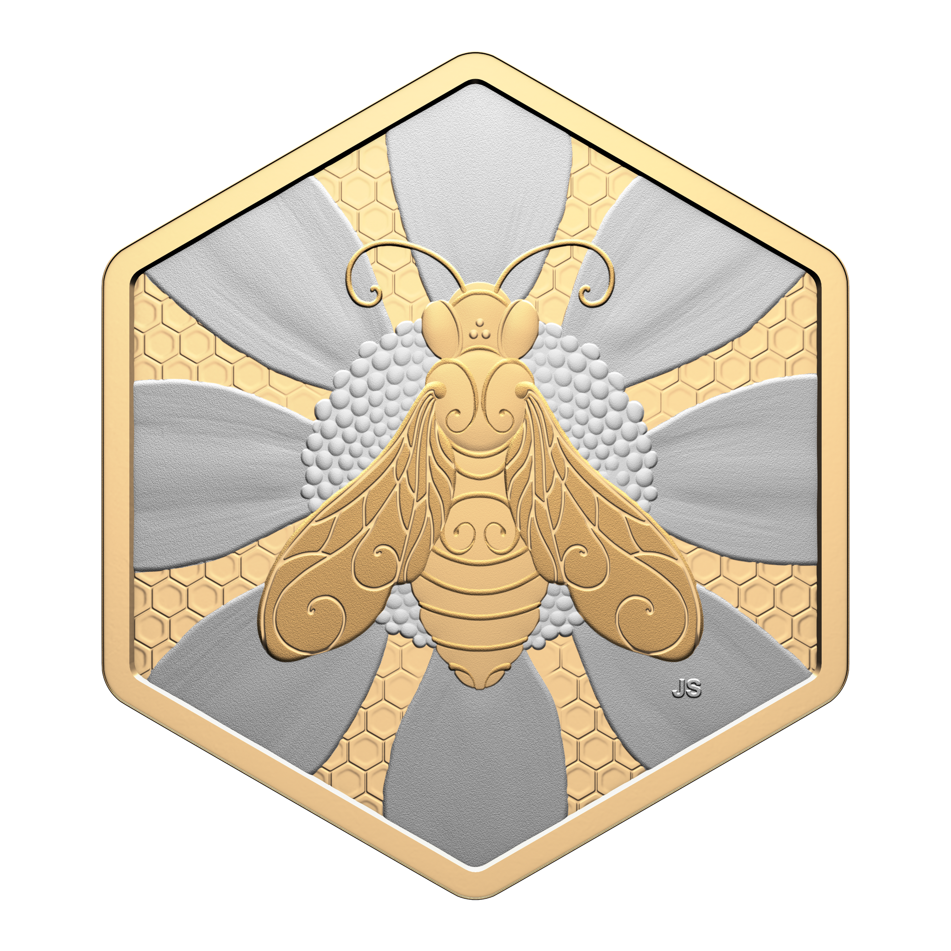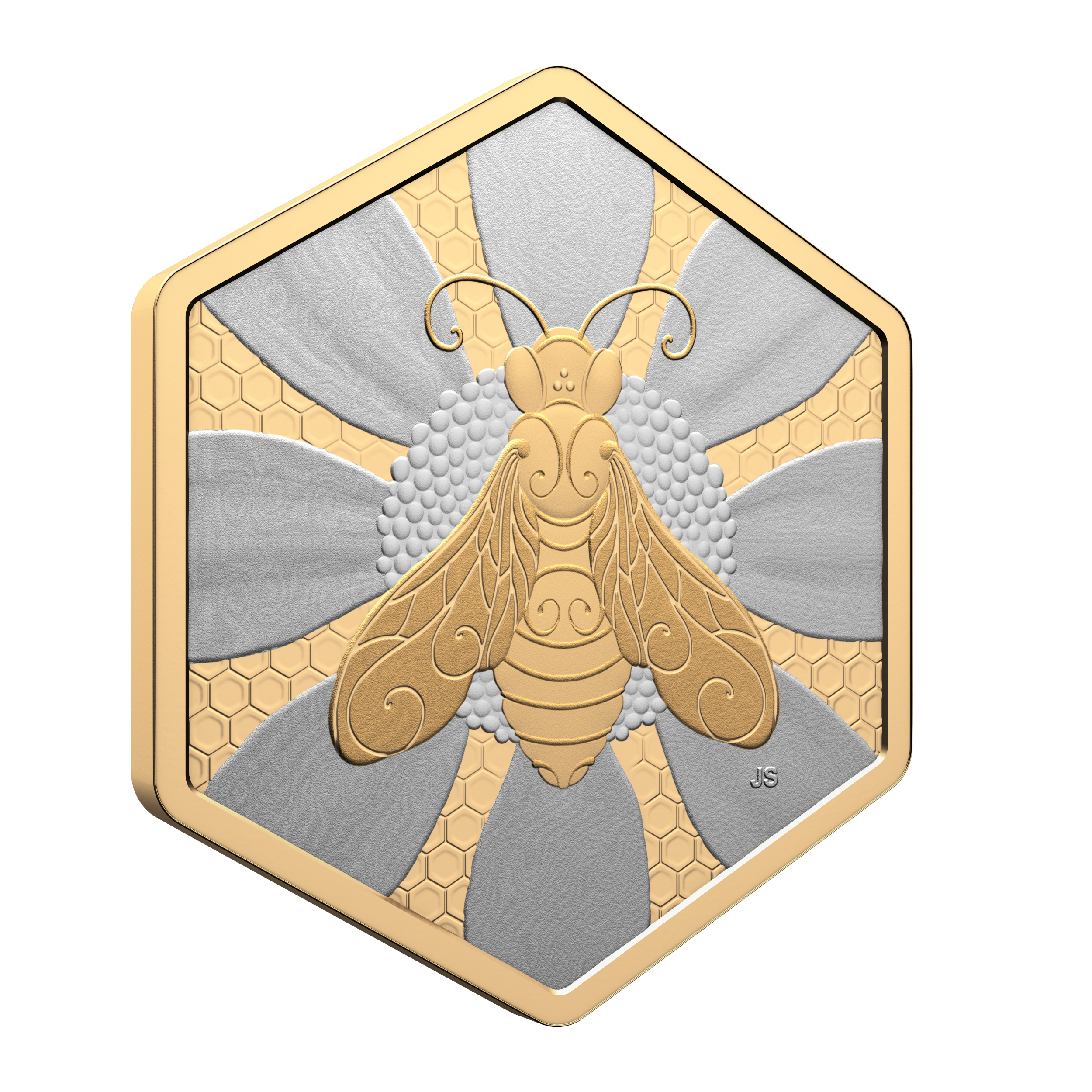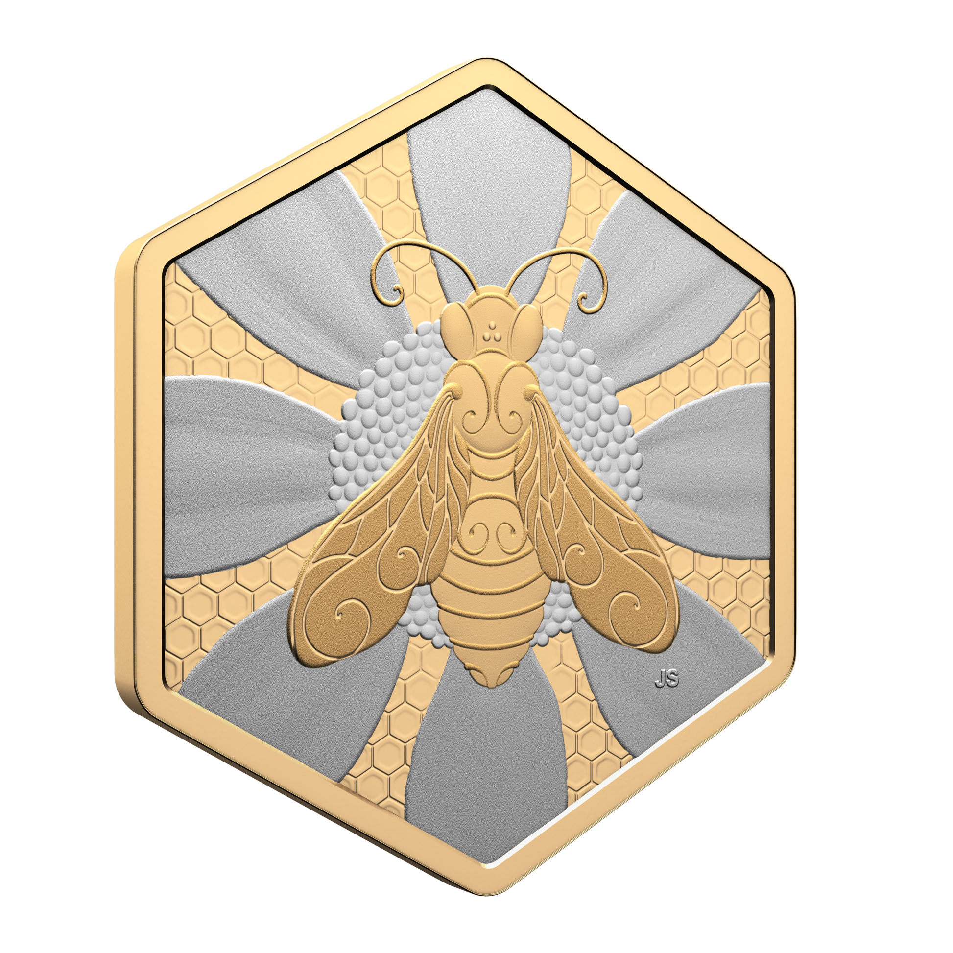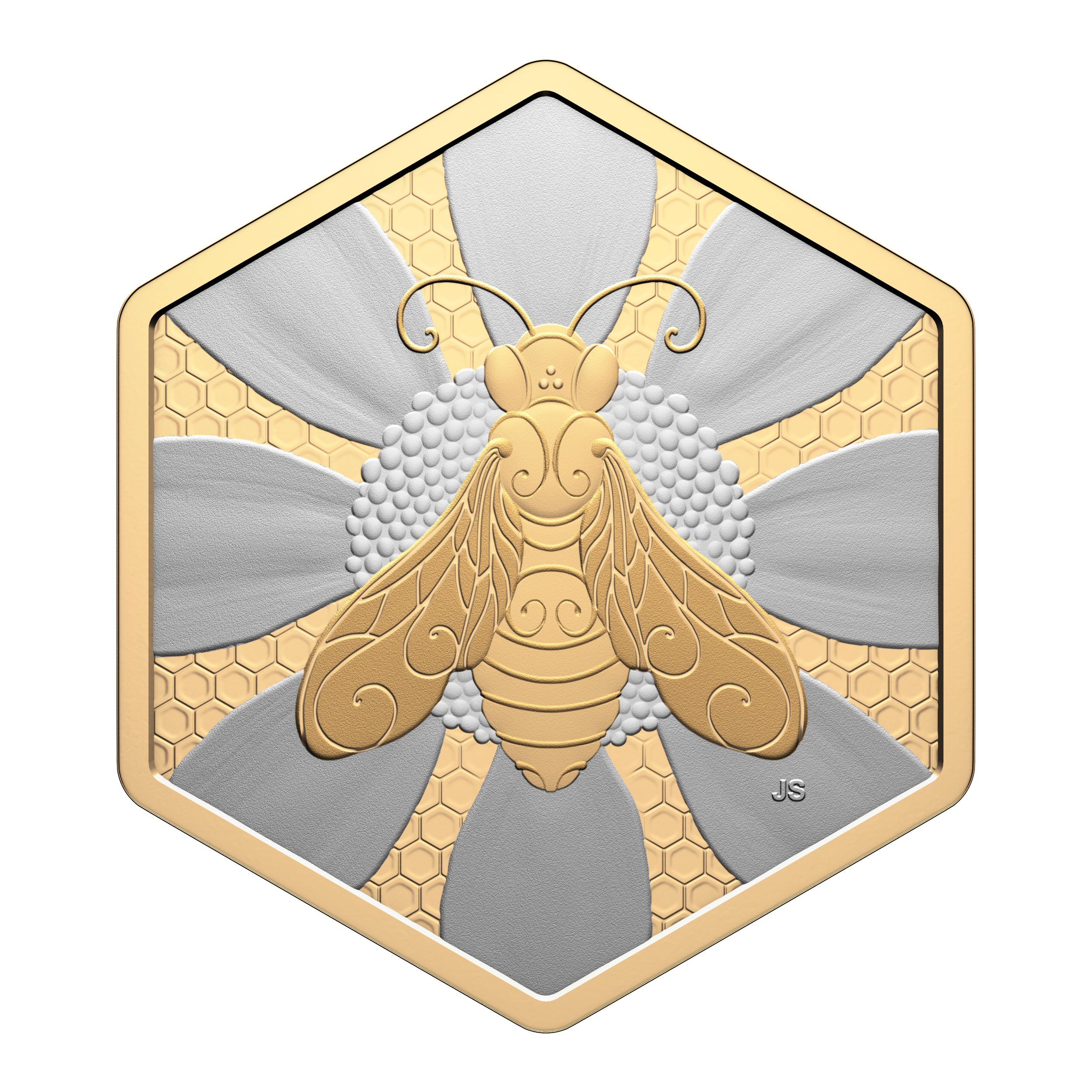- BEEautiful design. Venerated for its industrious nature, the honey bee takes centre stage on this hexagonal coin’s reverse, where the layered design artfully connects the pollinator with its pollen source and its honeycomb.
