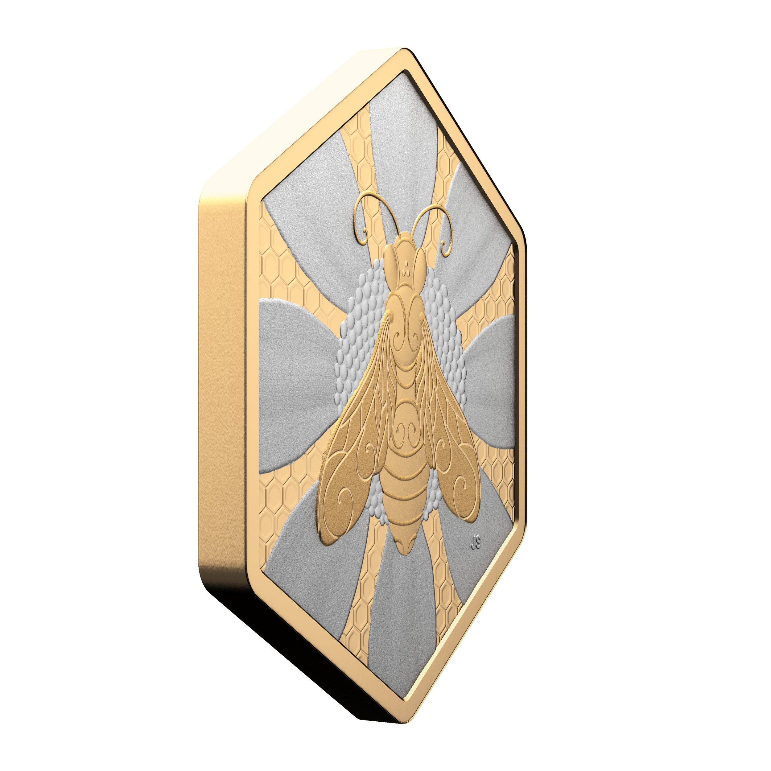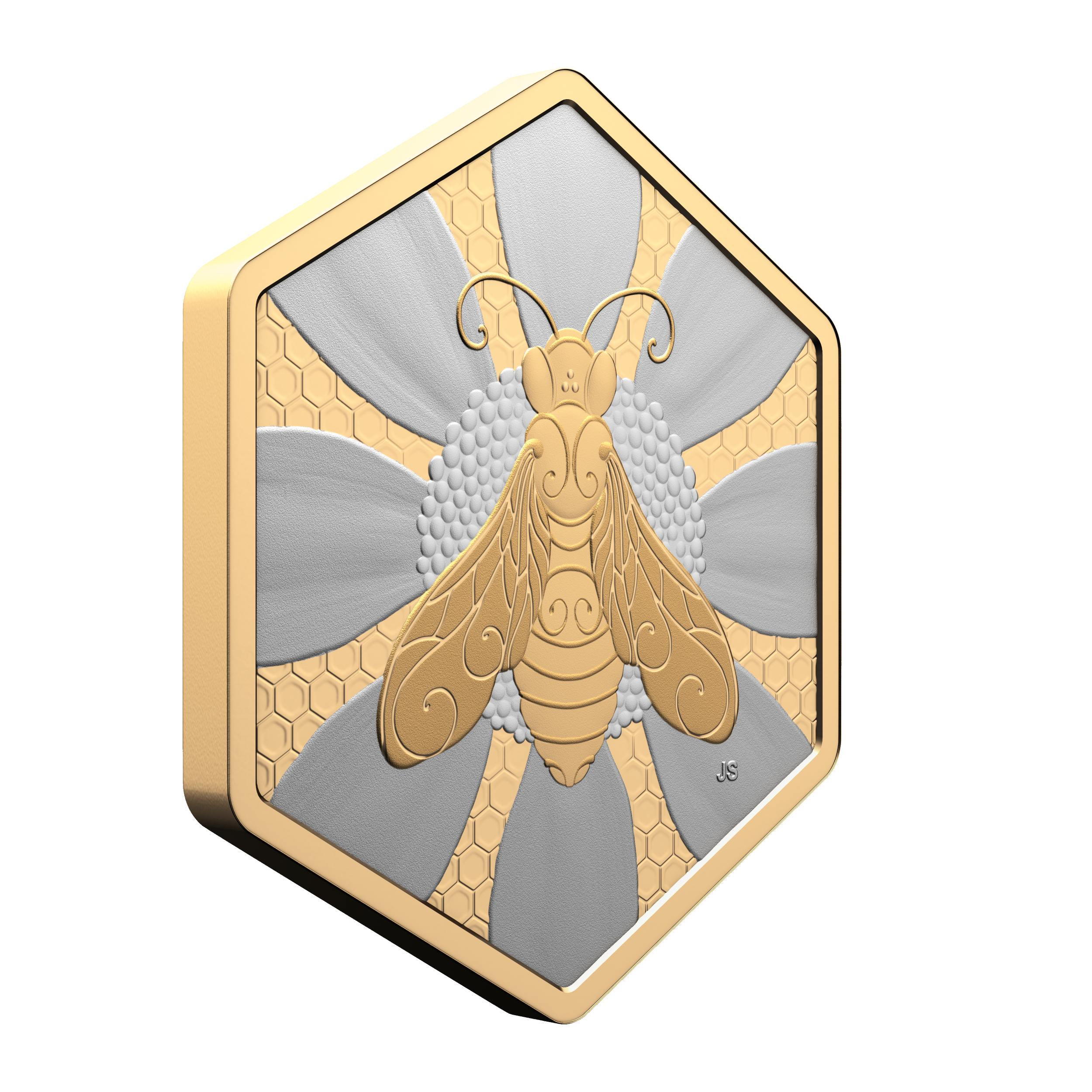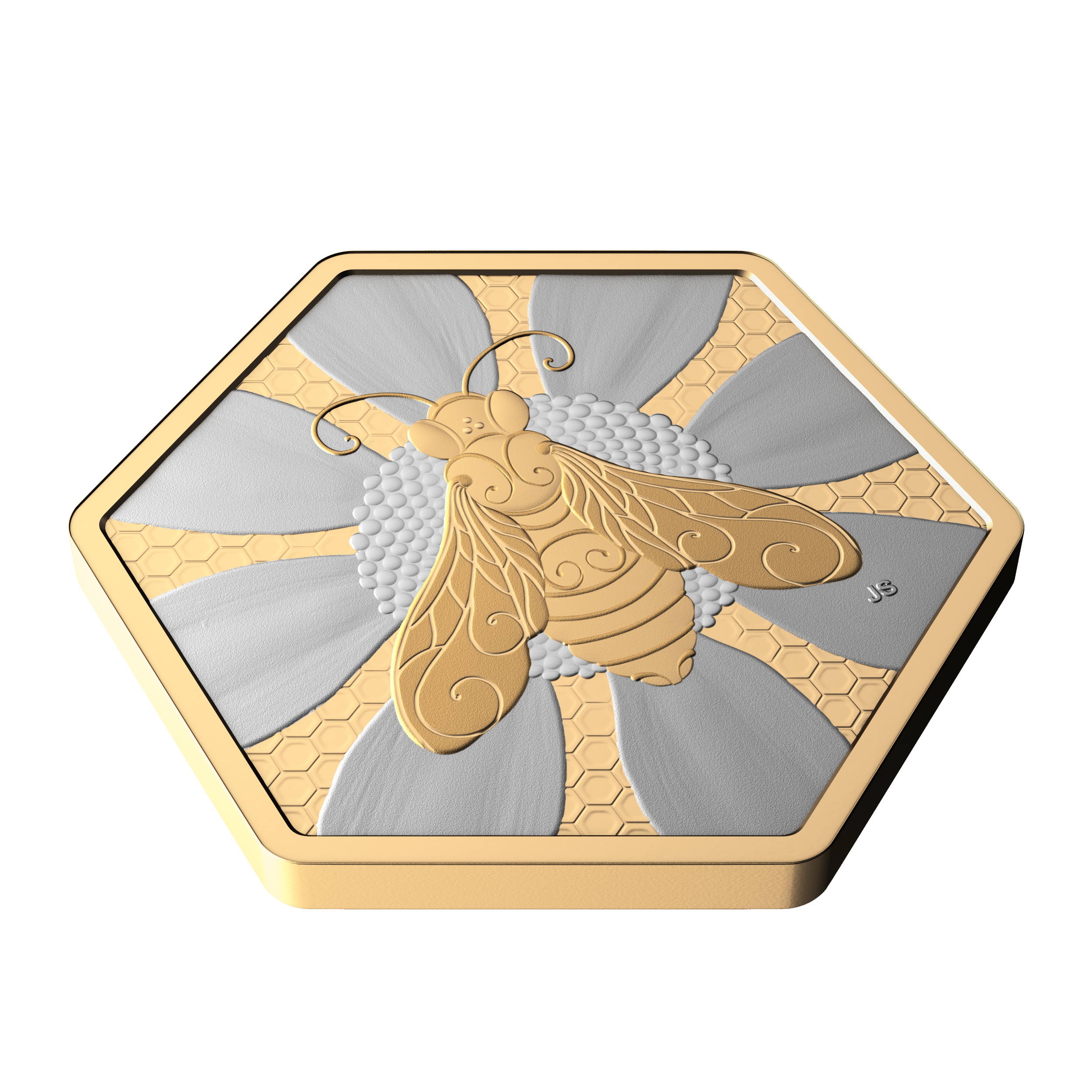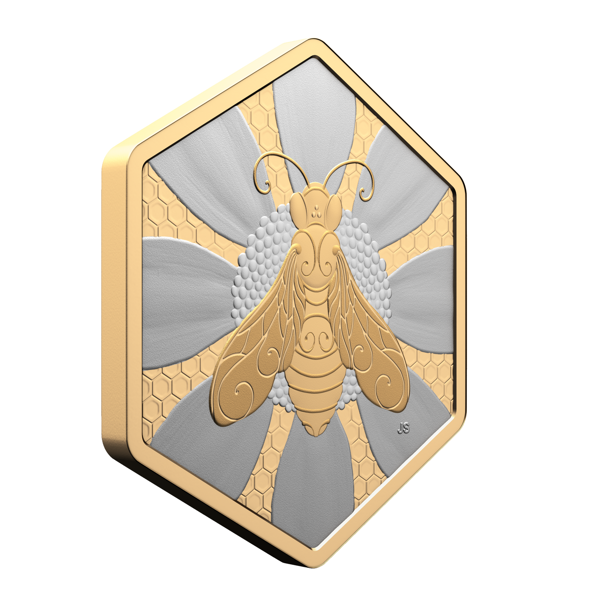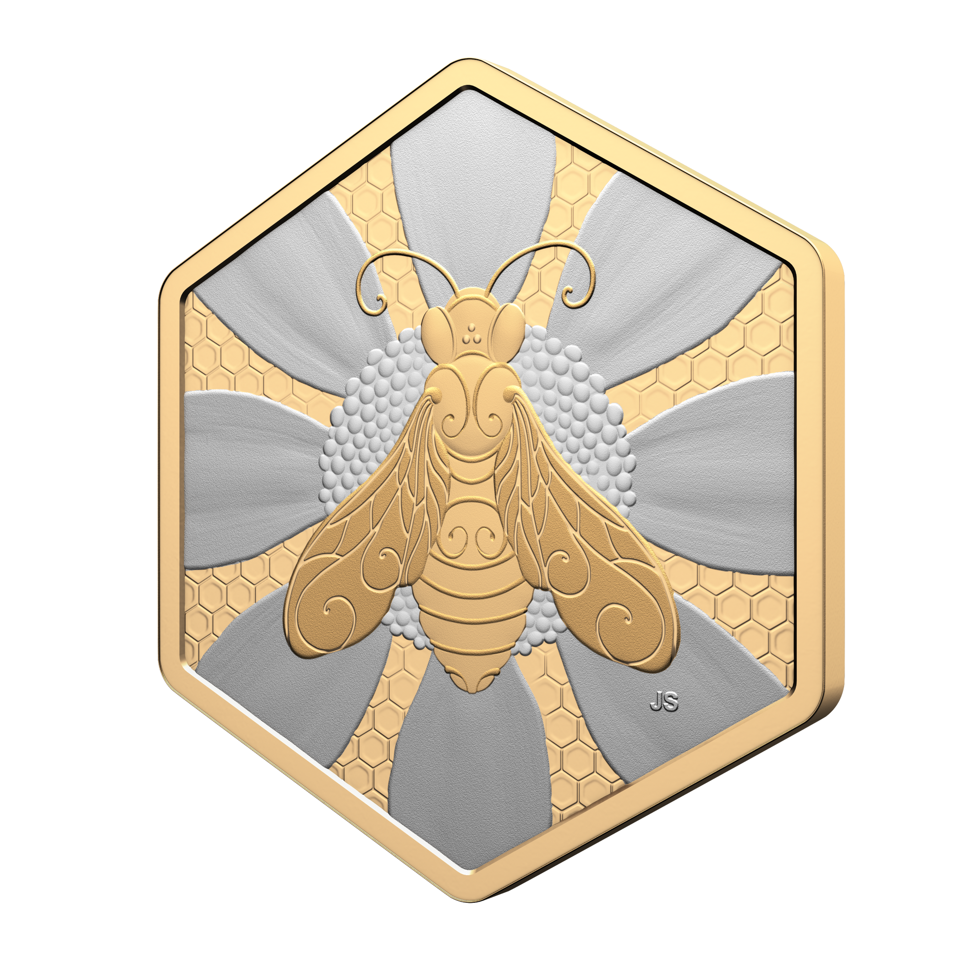 - BEEautiful design. Venerated for its industrious nature, the honey bee takes centre stage on this hexagonal coin’s reverse, where the layered design artfully connects the pollinator with its pollen source and its honeycomb.