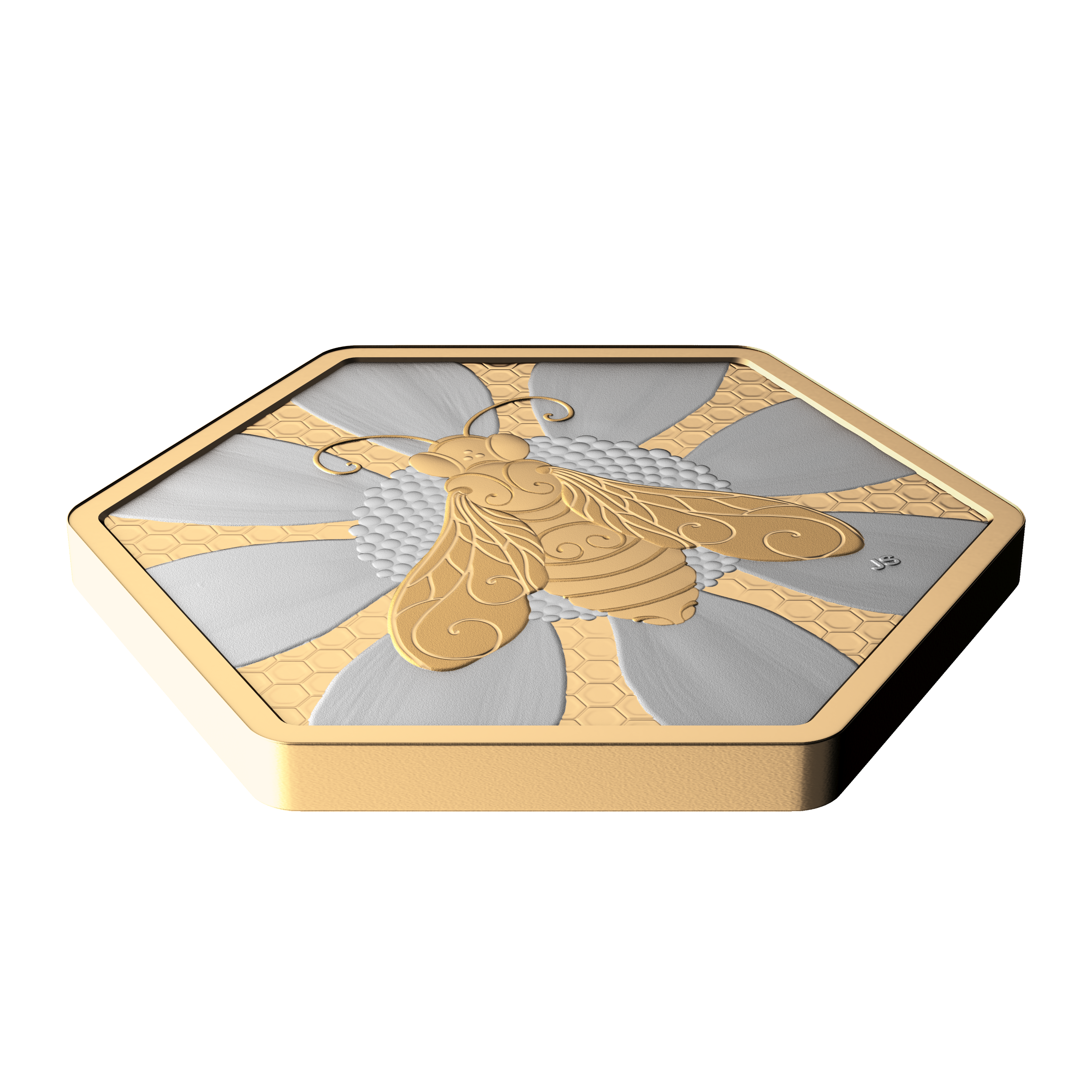 Known to be efficient both in instinct and design, the honeybee and its comb are beautifully adorned with yellow gold plating on this 99.99% pure silver coin, which, fittingly, features the popular hexagon coin shape that mimics the natural design of a honeycomb cell, widely considered to be nature’s perfect structure.