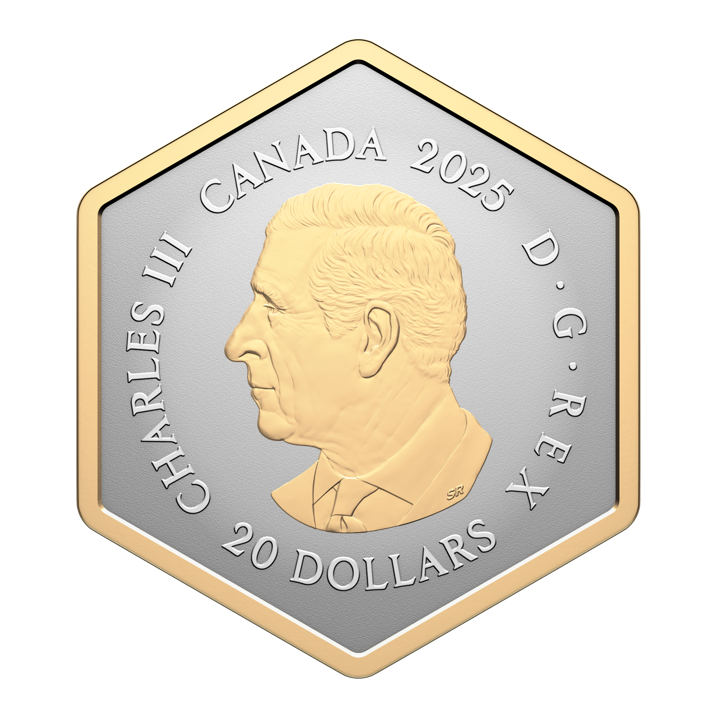 Inspired by daisies and black-eyed Susans, the centre of a stylized flower serves as a landing pad for a busy honey bee (Apis mellifera) in this reverse design by Canadian artist June Steube. The bee’s central position reflects its importance as a pollinator, while the overhead view allows for a more stylized representation of its wing pattern. The honeycomb in the background is visible between the flower petals, its hexagonal cells mirroring the coin’s six-sided shape. Both the bee and the honeycomb, as well as the rim on both sides, are plated with yellow gold. The obverse features the gold-plated effigy of His Majesty King Charles III by Canadian artist Steven Rosati.
