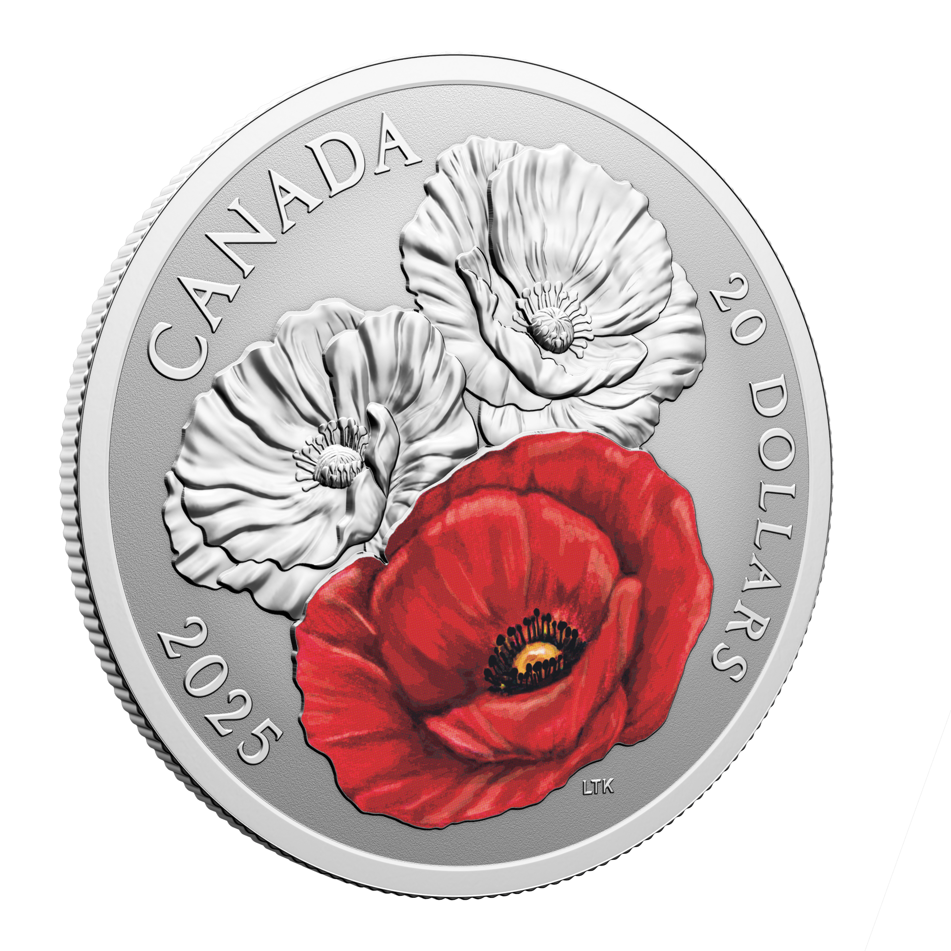 The red poppy carries a deep and powerful meaning that inspires reverence and gratitude – it is the embodiment of our everlasting esteem for those who died in defence of freedom. The 2025 Remembrance Day coin honours them through its reverse design, which features a realistic rendering of poppies – including one bright-red standout – resembling those that inspired the immortal poem of Remembrance, In Flanders Fields, written by Canadian John McCrae 110 years ago.