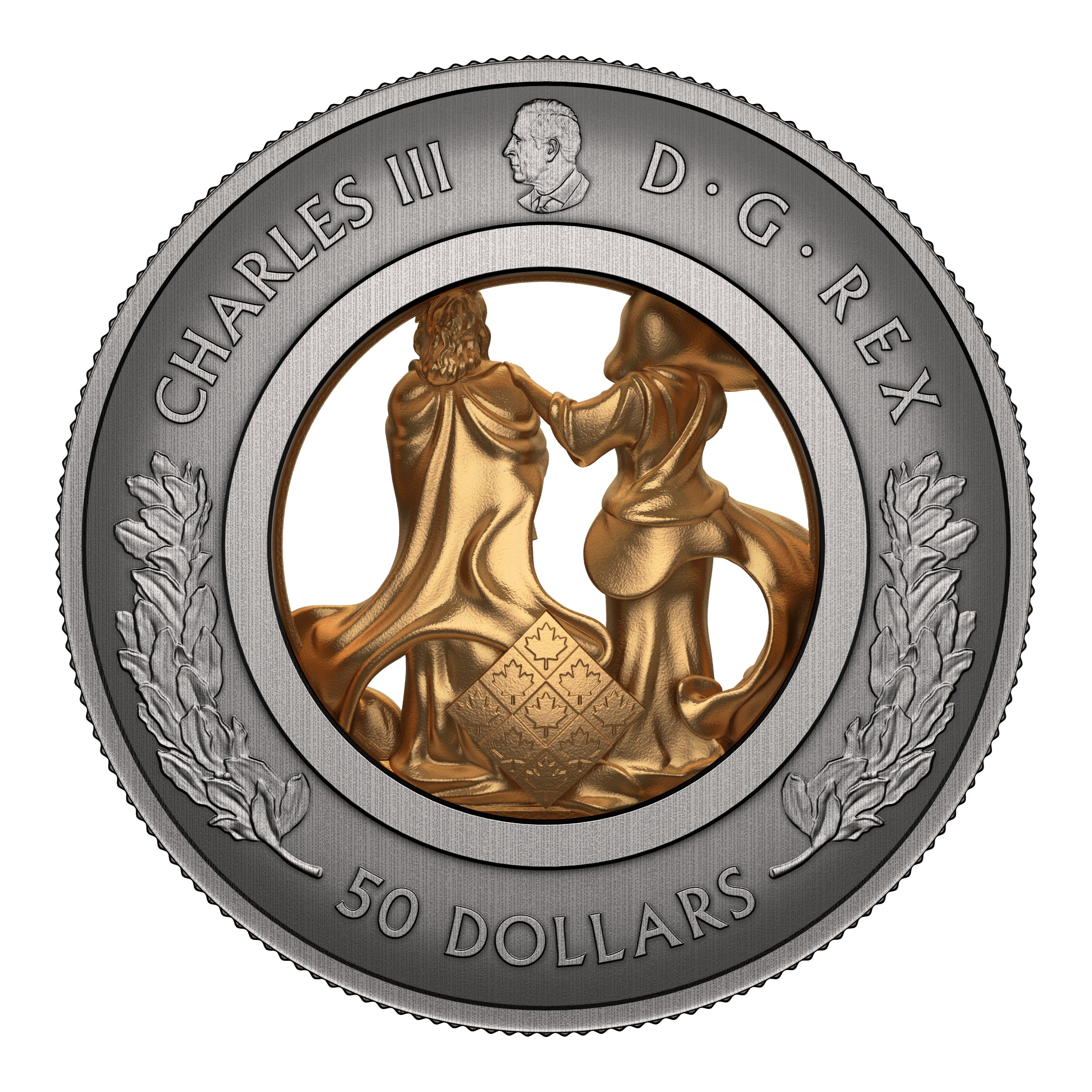 Inspired by Walter S. Allward’s statues Ivstitia (Justice) and Veritas (Truth) that stand vigil over the front steps of the Supreme Court of Canada building in Ottawa, this coin design by Canadian artist Rebecca Yanovskaya features 3D allegorical personifications of Justice and Truth standing on a podium with the letters “SC” (for “Supreme Court”)—a nod to the Cormier Emblem, the Supreme Court’s historic badge, on the institution’s 150th anniversary. The emblem also inspired the laurel wreath along the inner ring that encircles Truth and Justice, with Justice extending her arm to support Truth while holding forth the Sword of Justice. On the outer ring, laurel branches unfurl around the figures, protecting and emboldening them to fulfill their purpose. A scroll banner bears the words “JUSTITIA ET VERITAS”—the Court’s motto and the name of the allegories, which are also visible on the obverse, where the diamond shape formed by nine lozenges (each bearing a maple leaf) represents the Court of nine judges, and is inspired by the Court’s badge. The obverse also features laurel branches and the effigy of His Majesty King Charles III by Canadian artist Steven Rosati.