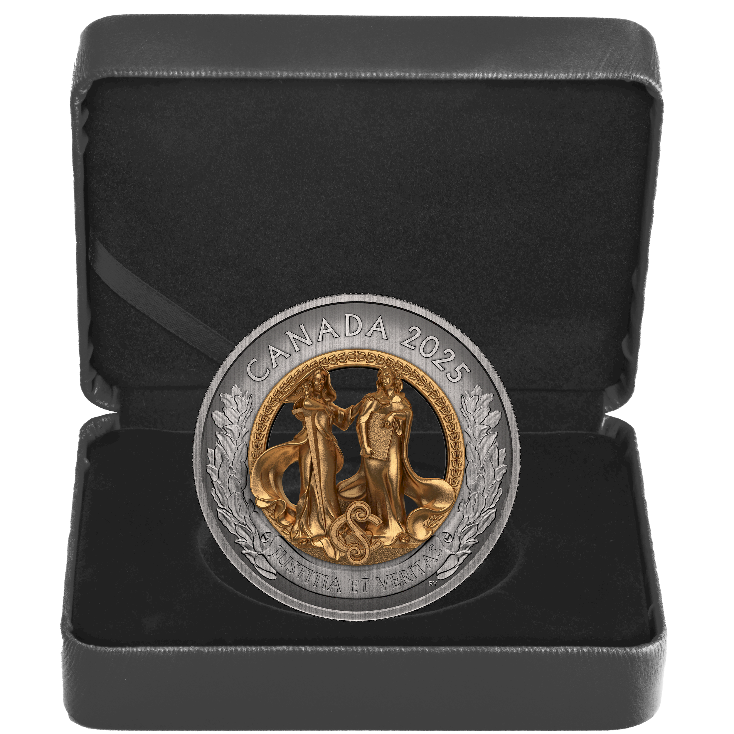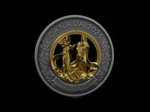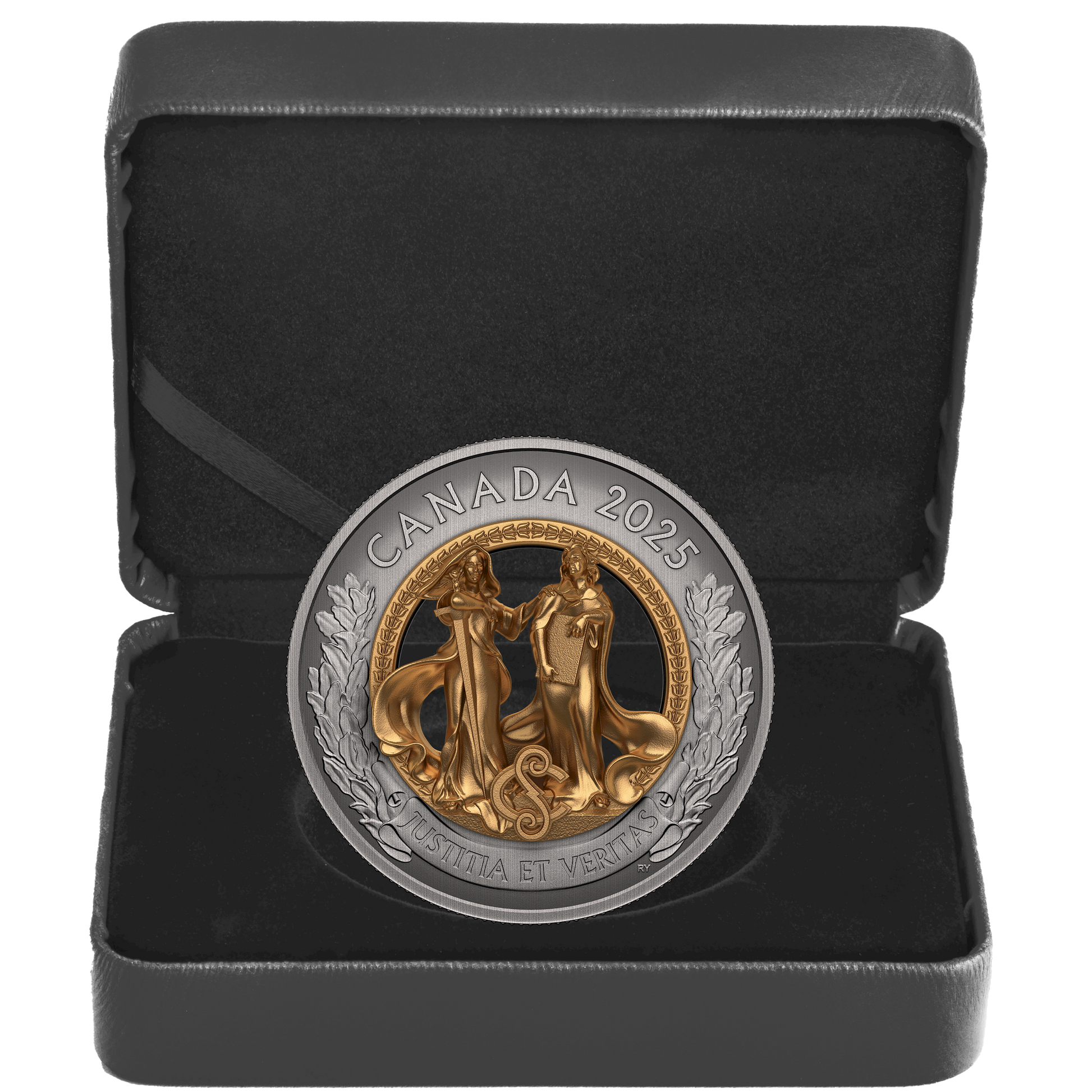For 150 years, the Supreme Court of Canada has upheld the rule of law and fostered public trust through its role as the highest court in Canada. For 2025, this dual-sided allegory design is a celebration of the institution’s rich history and its deep commitment to Justitia et Veritas, Justice and Truth, both of which are personified on this piece inspired by the statues that stand vigil outside the Court’s building in Ottawa. Cast in 99.99% pure silver and plated with yellow gold, Justice stands beside Truth, who provides stabilizing support, as they work together to ensure a fair and safe environment for all.