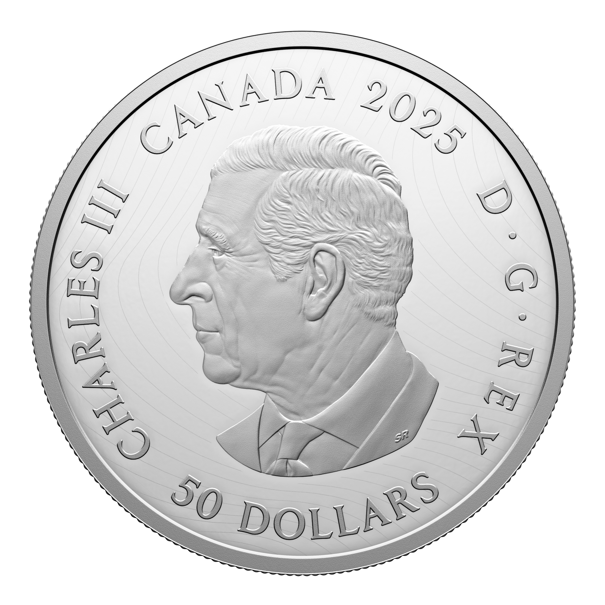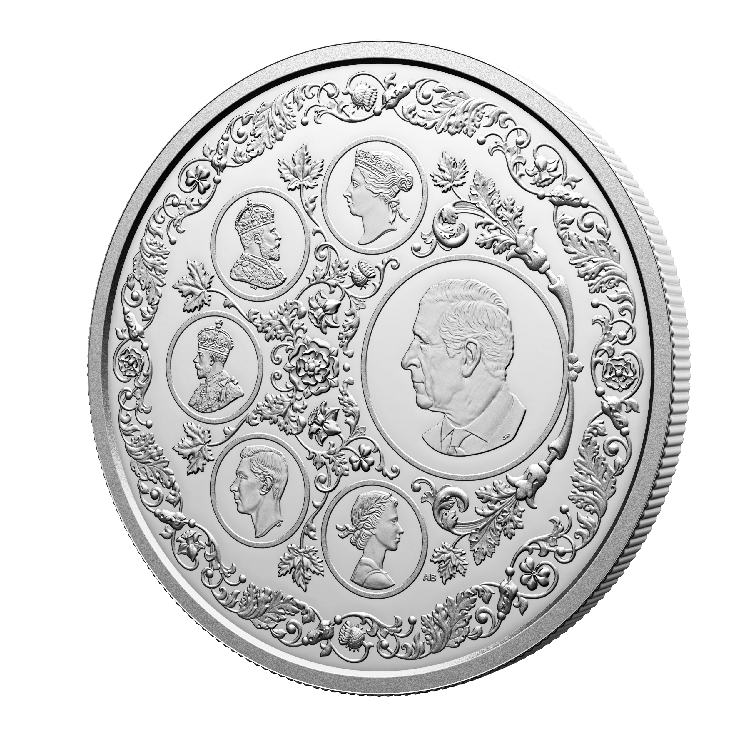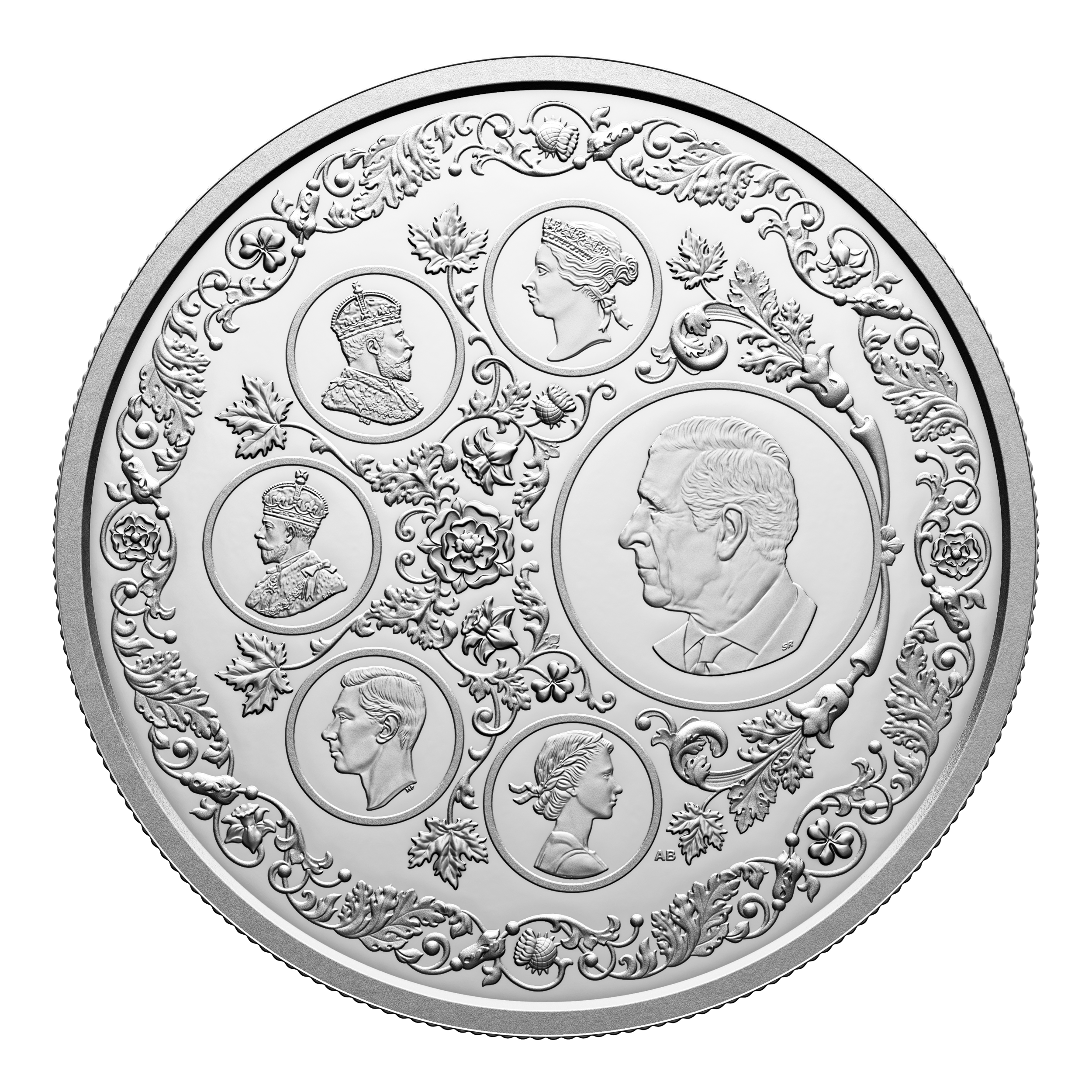 The reverse design by artist Anna Bucciarelli features a circular arrangement of current and historical effigies, one for each reigning monarch whose likeness has graced Canada’s coins since Confederation (from top, counter-clockwise): the effigy of Queen Victoria (1870-1901) by L. C. Wyon; the effigy of King Edward VII (1902-1910) by G. W. De Saulles; the effigy of King George V (1911-1936) by Sir E. B. Mackennal; the effigy of King George VI (1937-1952) by T. H. Paget; the effigy of Queen Elizabeth II (1953-1964) by Mary Gillick; and the effigy of His Majesty King Charles III (2023-present) by Steven Rosati. This collection of royal portraits is surrounded by the emblems of the United Kingdom (Tudor rose, shamrock, thistle and daffodil) and Canada (maple leaf), and elegantly bordered by flourishes of acanthus leaves. The obverse features the effigy of His Majesty King Charles III by Canadian artist Steven Rosati.