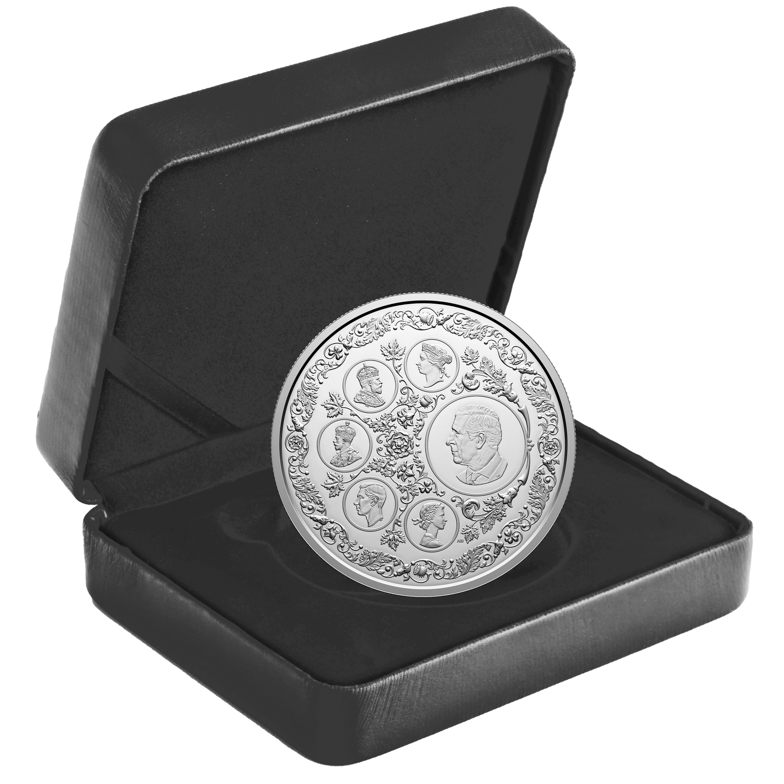 Bridging the past and present, this 5 oz. 99.99% pure silver coin features six well-known effigies, one for each of the reigning monarchs whose likenesses have appeared on post-Confederation Canadian coinage. Surrounded by stately botanical emblems, these royal portraits are portals into the past (and present), and each one represents change: from the Queen Victoria diadem portrait seen on the first coins issued by the Dominion of Canada 155 years ago, to the first image of Queen Elizabeth II’s historically long reign, and the effigy introduced in 2023 – that of His Majesty King Charles III.