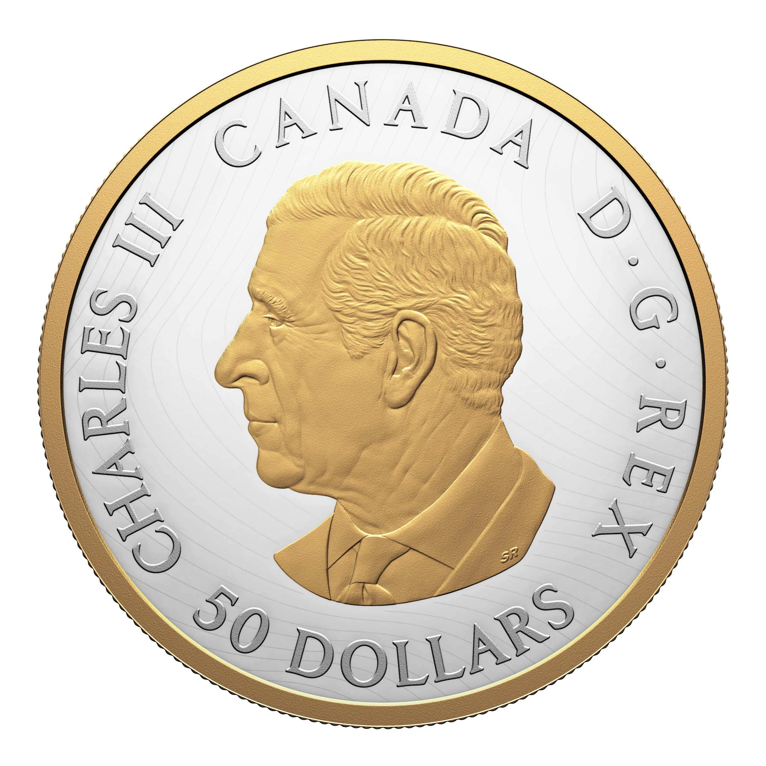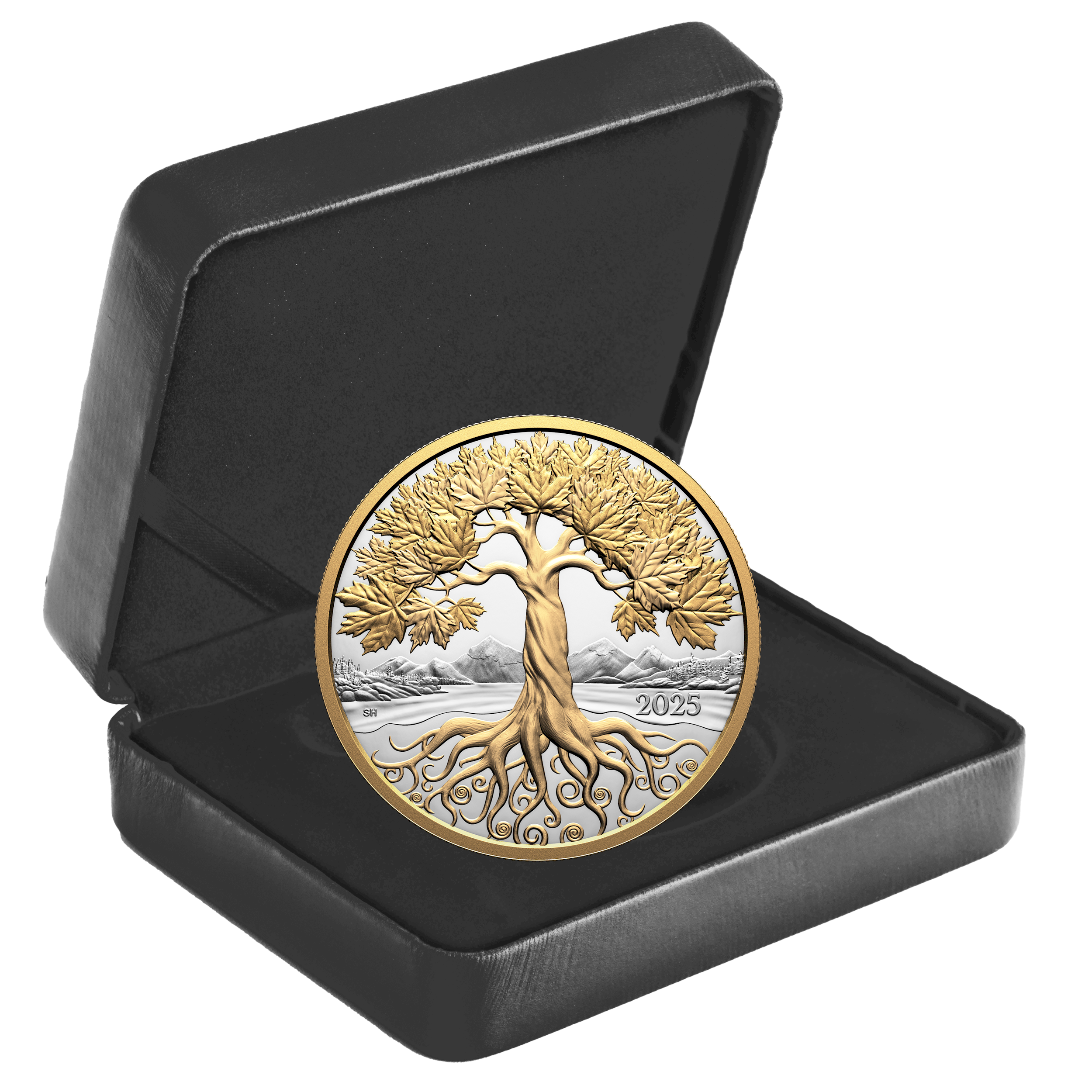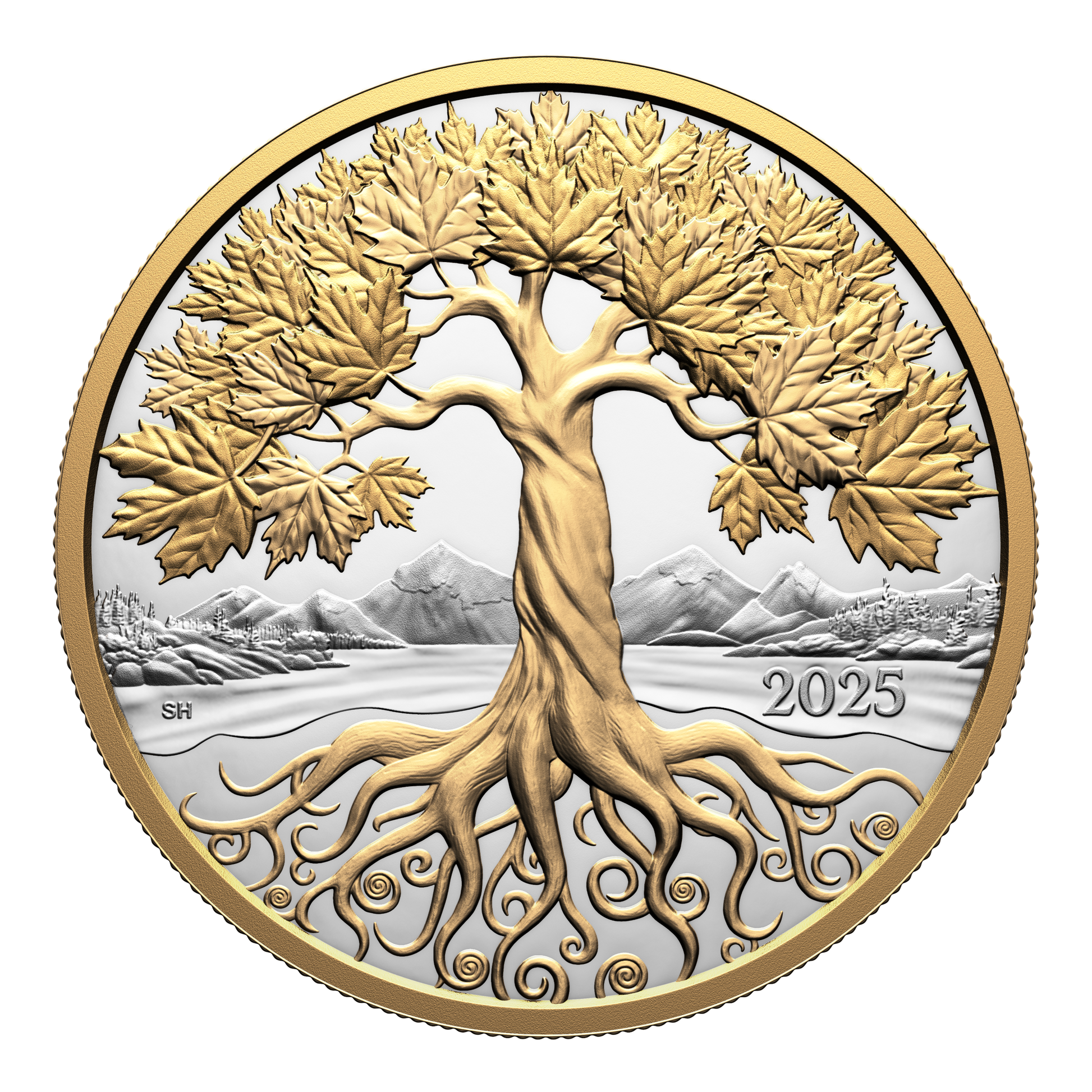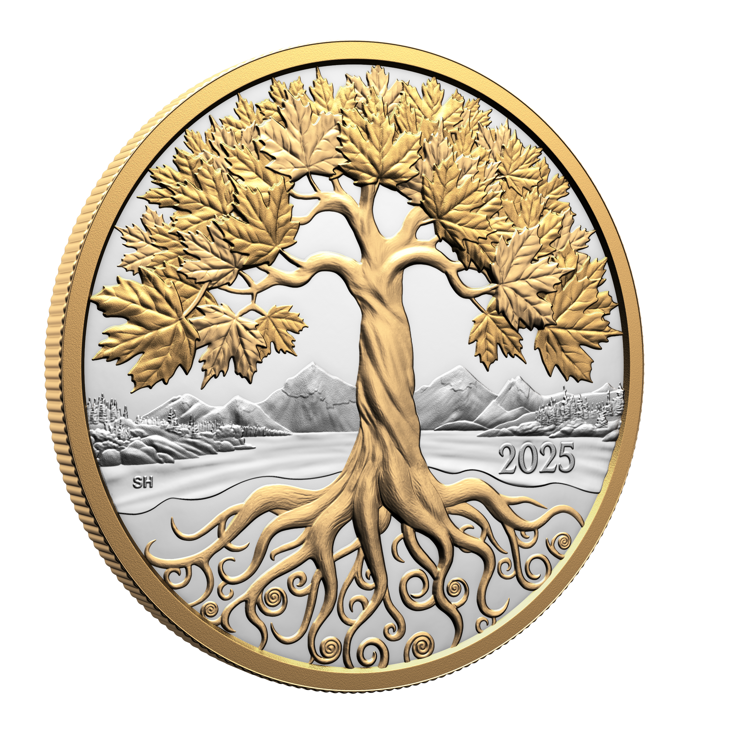 Designed by Canadian artist Steve Hepburn, the coin’s reverse features an artistic interpretation of Canada’s national arboreal emblem, the maple (g. Acer), reimagined as a tree of life and plated with yellow gold. The tree’s curled roots dig deep into the ground to provide a solid foundation for the twisting trunk, the strong branches that stretch up and out, and the sugar maple leaves that are bathed in golden sunlight. Behind the tree, the engraved background combines various land features—mountain ranges, rivers and forests—to showcase the many majestic landscapes that Canada has to offer. The rim on both sides is also plated with yellow gold, while the obverse features a wave pattern and the gold-plated effigy of His Majesty King Charles III by Canadian artist Steven Rosati.