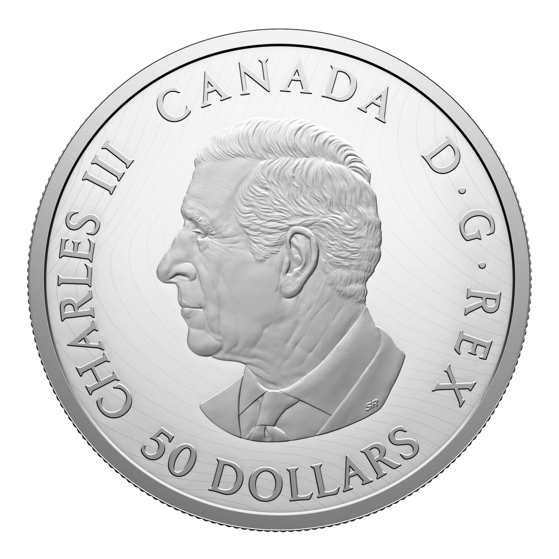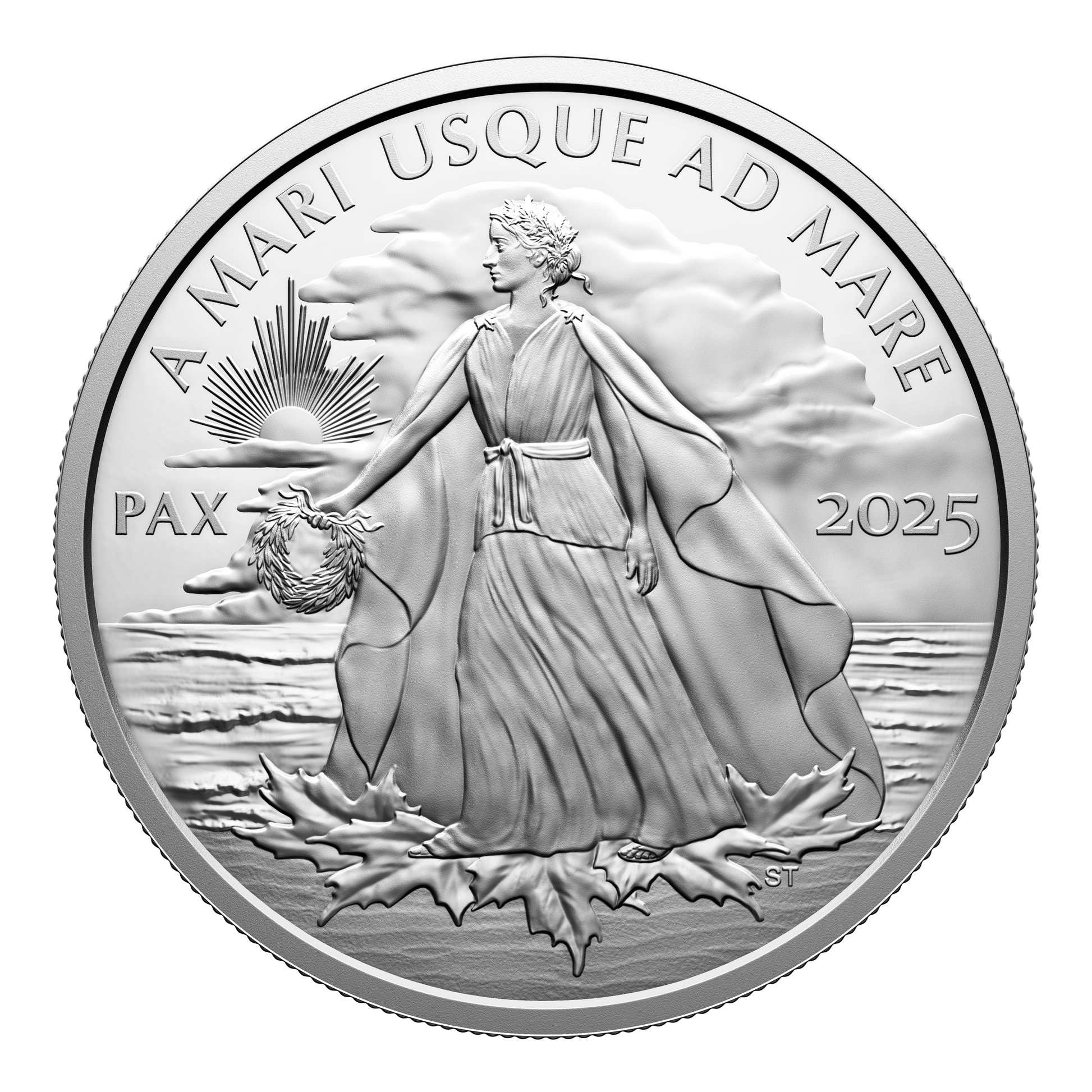 The reverse design by retired RCM Senior Engraver Susan Taylor features a full-body portrait of Lady Peace, a personification of Peace (“PAX”). Inspired by the allegorical figure atop the National War Memorial in Ottawa, Lady Peace is dressed in a flowing robe and crowned with a wreath of maple leaves and olive branches expressing a core Canadian value of peace. Her serene countenance exudes poise, strength and quiet confidence as she extends her right arm, almost as if the peace wreath she holds is an offering to all. Lady Peace stands on the shoreline and is supported by maple leaves that are symbolic of Canada, while Canada’s motto, “A MARI USQUE AD MARE” (“From sea to sea”) appears in the sky above, where the sun’s rays break through the rain clouds and form the shape of a maple leaf. The obverse features the effigy of His Majesty King Charles III by Canadian artist Steven Rosati.