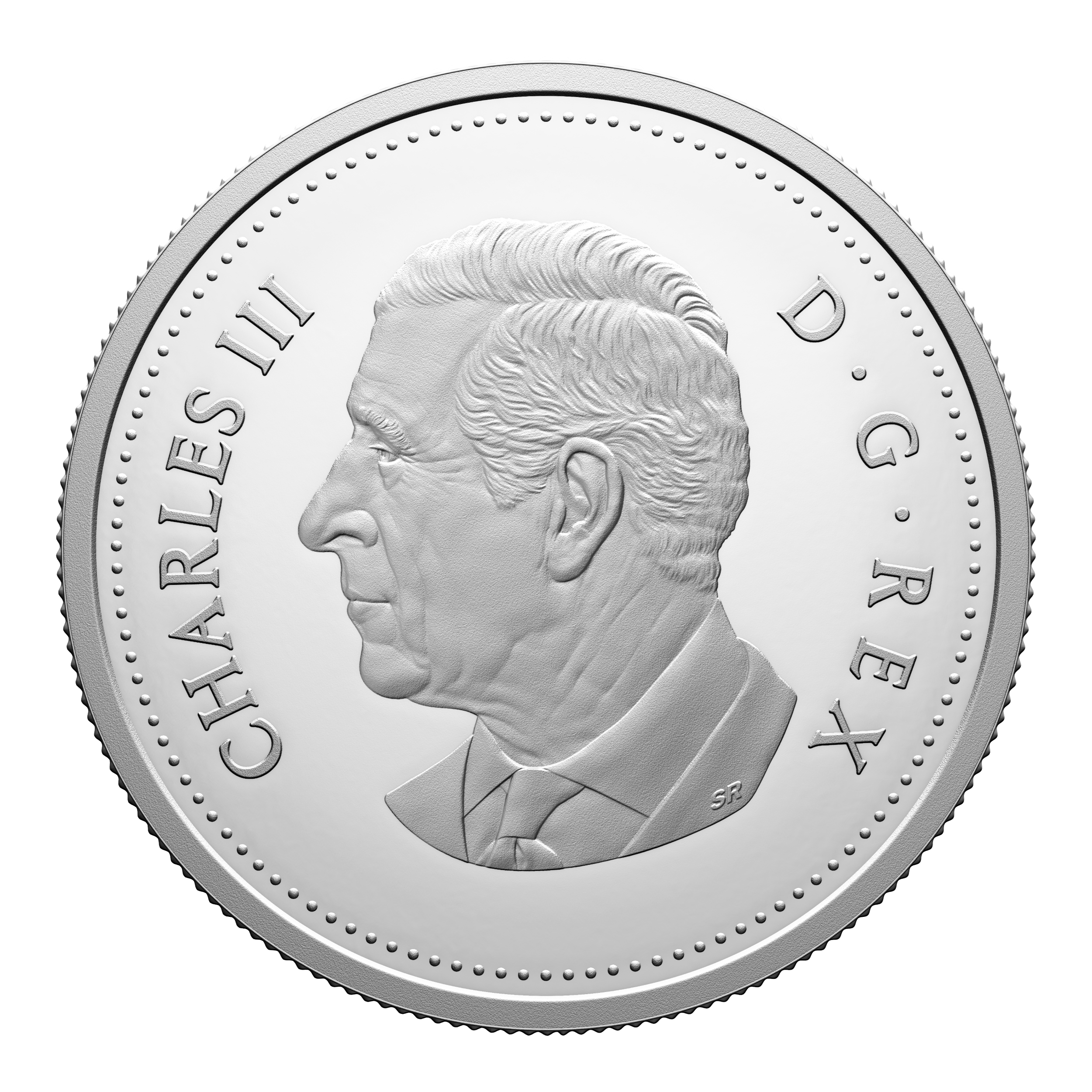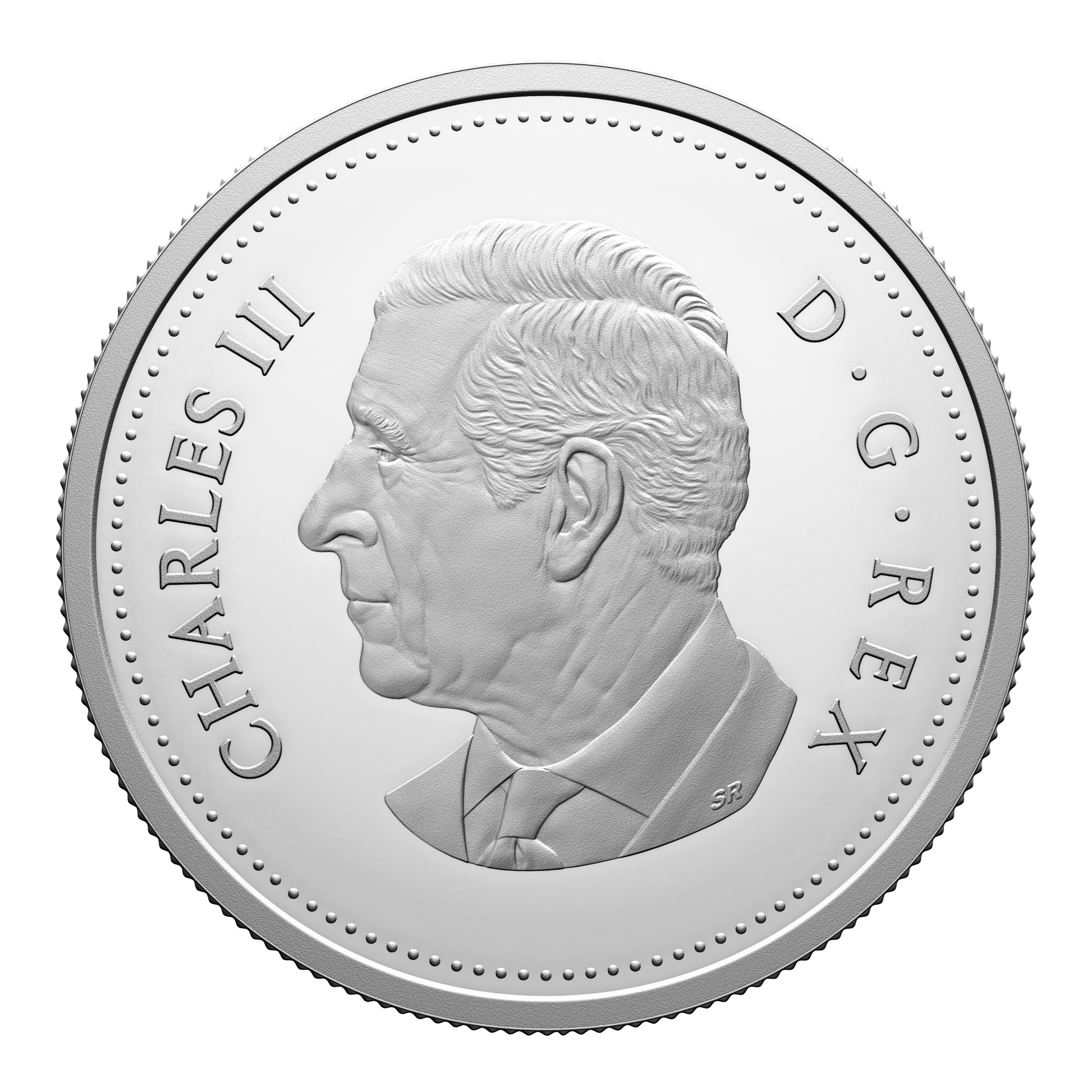 To mark the 50th anniversary (“1975-2025”) of Castor canadensis becoming an official emblem of Canada, the reverse design by Canadian artist Steve Hepburn features a beaver with its broad tail wrapped around its body as it sits on a piece of wood. The Canadian icon is framed by twisting branches bearing sugar maple (Acer saccharum) leaves. The obverse features the effigy of His Majesty King Charles III by Canadian artist Steven Rosati.