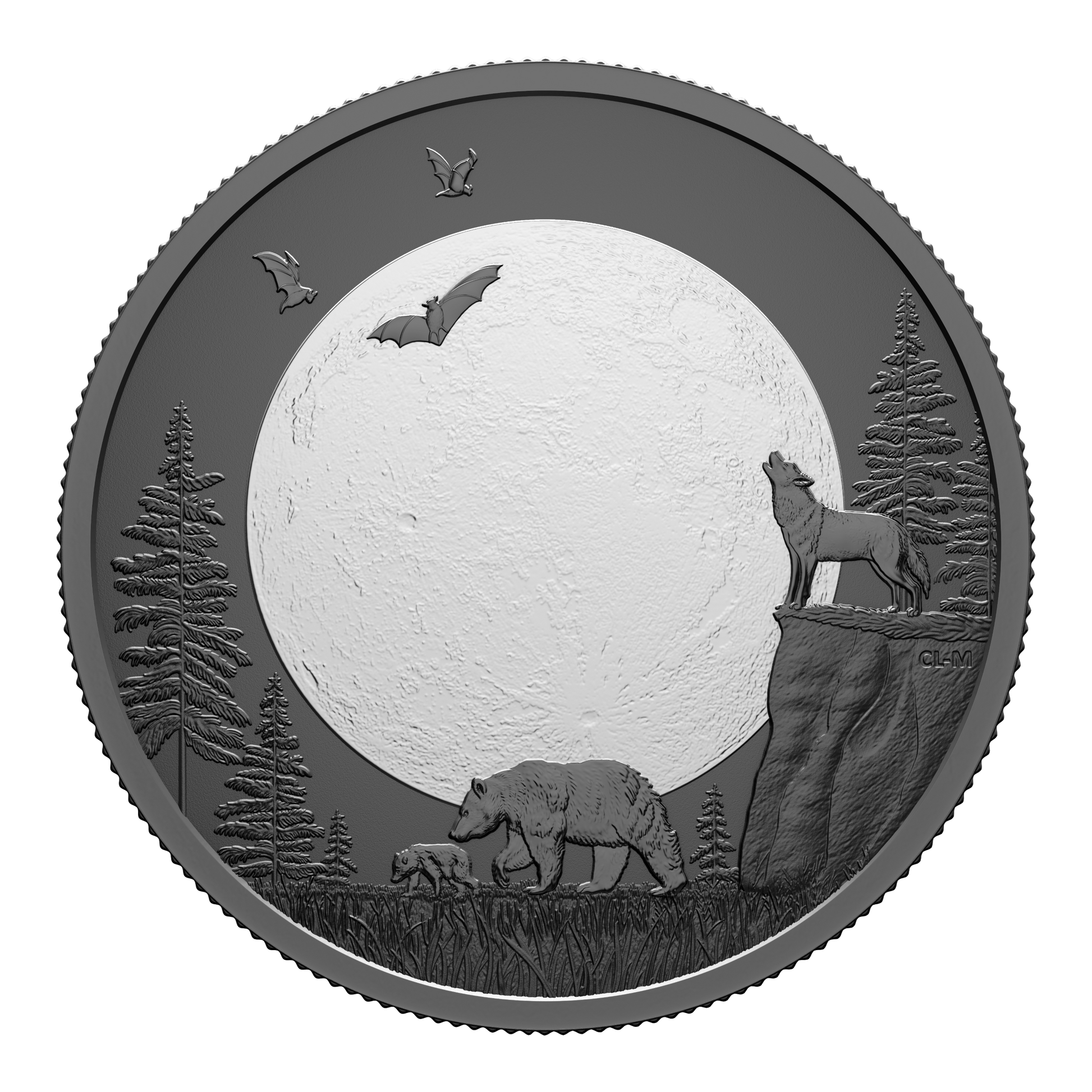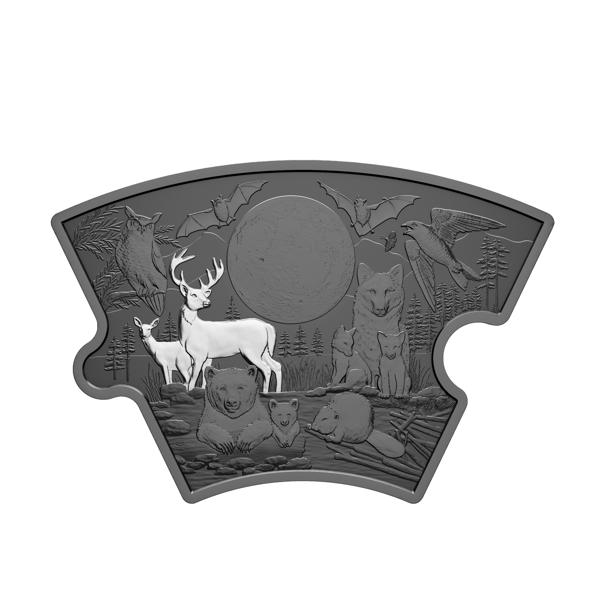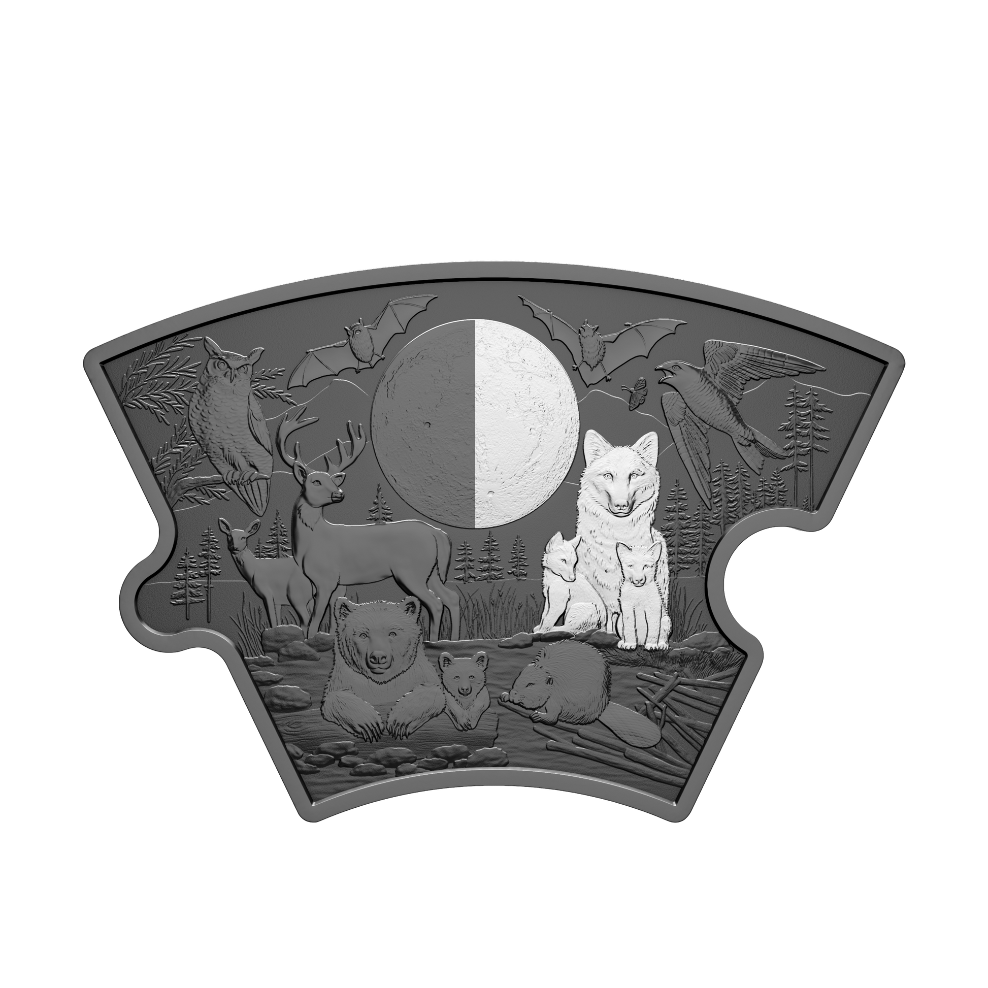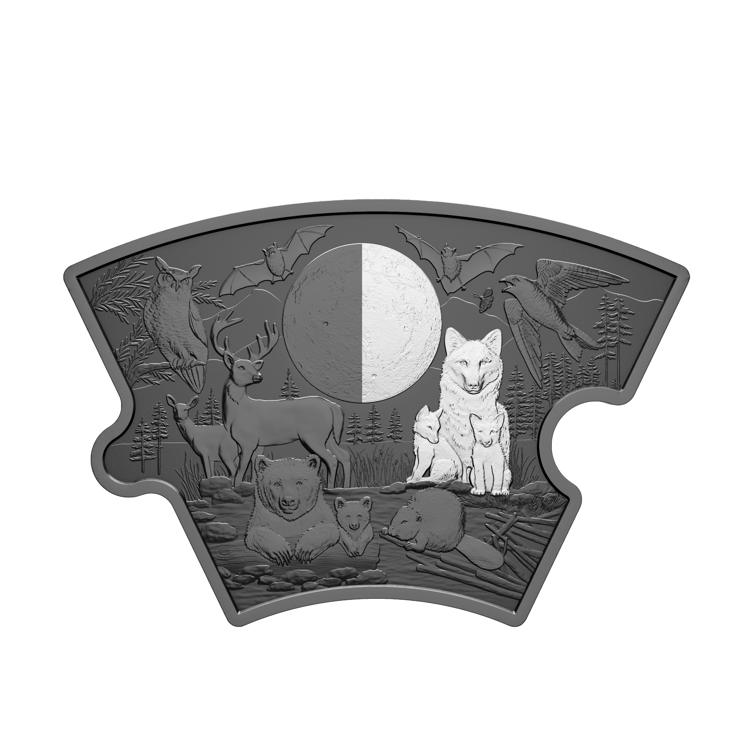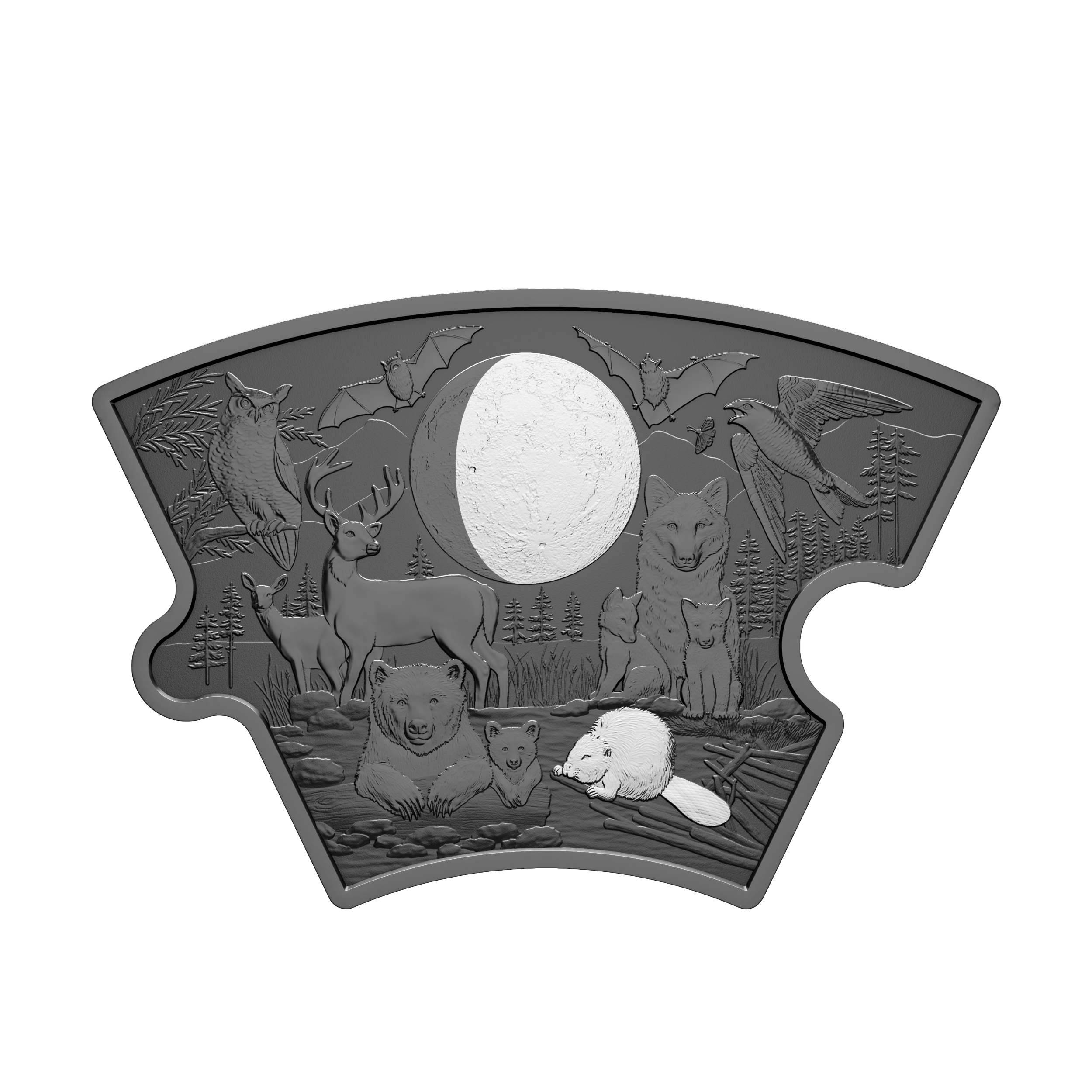The round centrepiece features a nocturnal landscape inhabited by bats, wolves and bears, and illuminated by a full Moon that appears larger near the horizon, allowing a clear view of its surface features. Around this central piece, seven interconnecting, puzzle-shaped pieces share the same engraved, forest-themed design. On each piece, selective black rhodium plating conceals most of the engraving in order to reveal a different Moon phase and a known nocturnal or crepuscular Canadian animal (clockwise from the right/3 o’clock position): white-tailed deer for the new Moon; a Great Horned Owl for the waxing crescent; wolves for the first quarter; a North American beaver for the waxing gibbous; a Common Nighthawk for the waning gibbous; grizzly bears for the third quarter; and little brown bats for the waning crescent Moon.