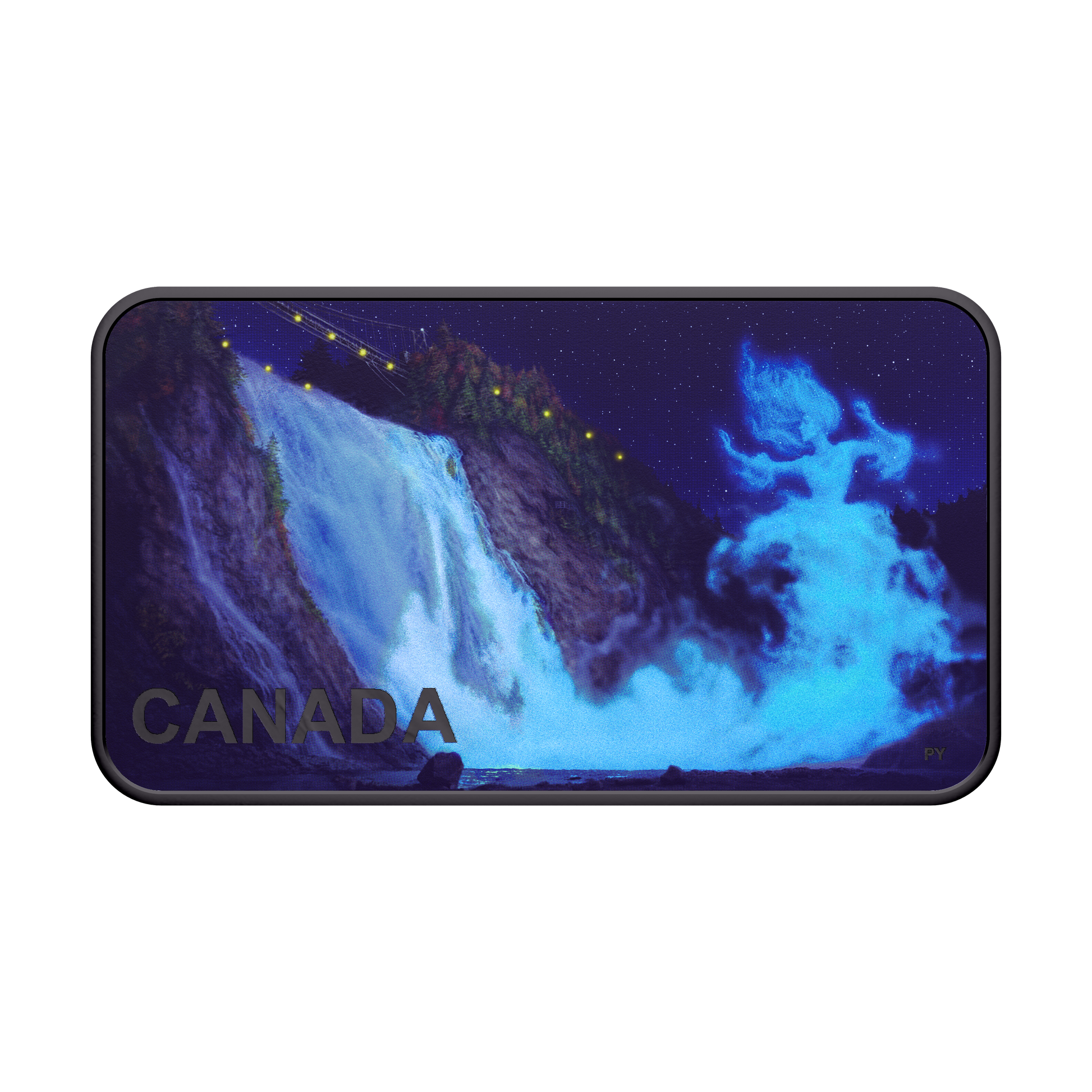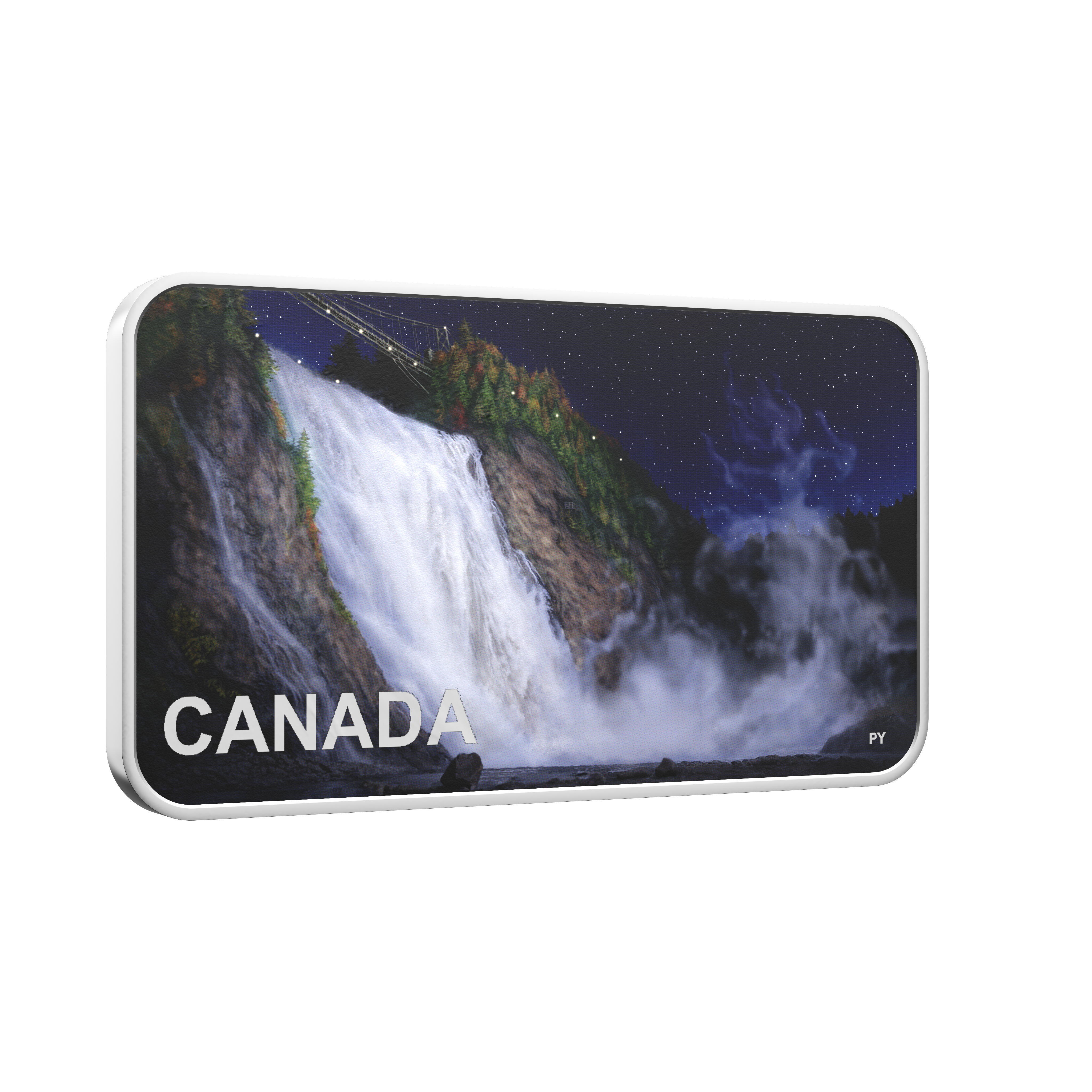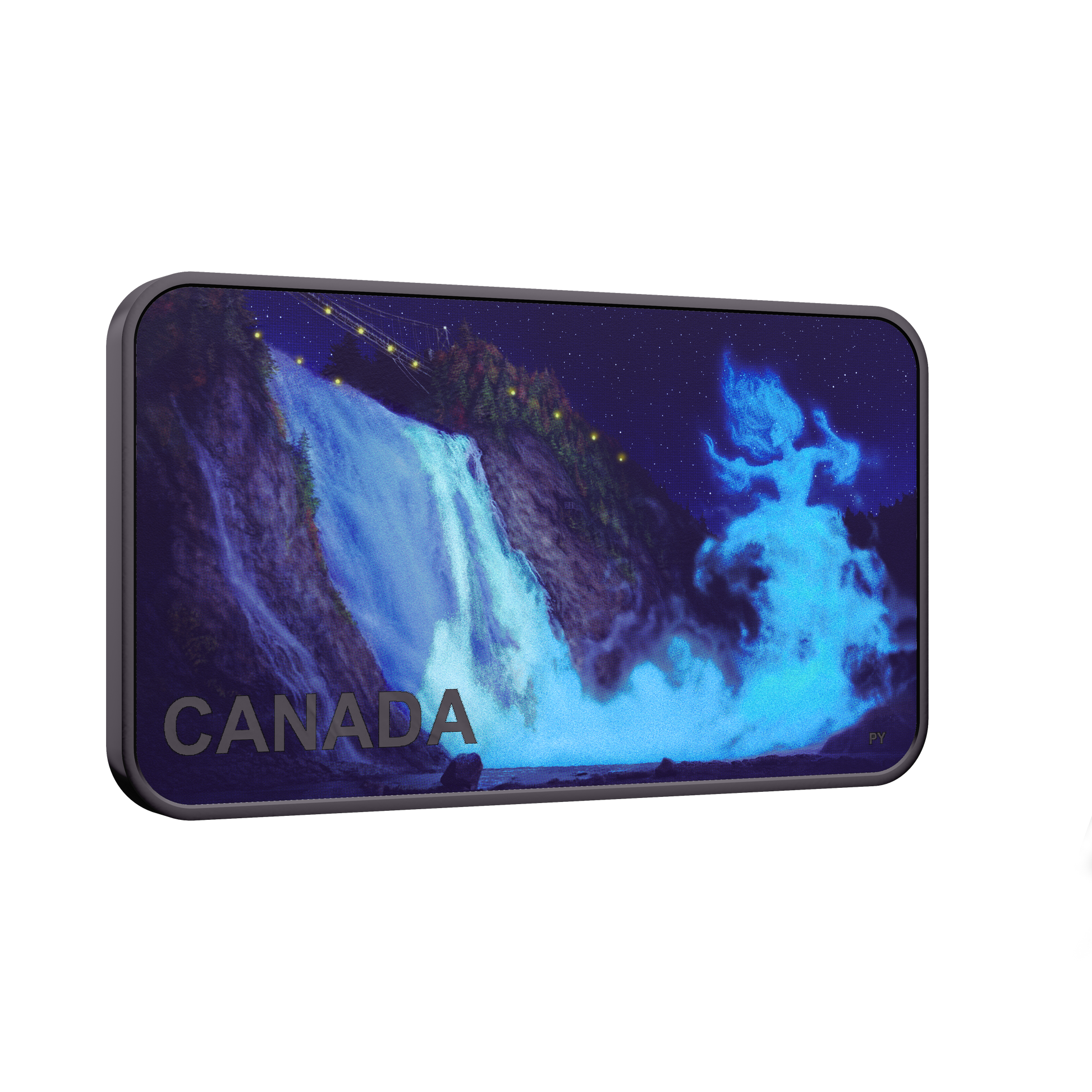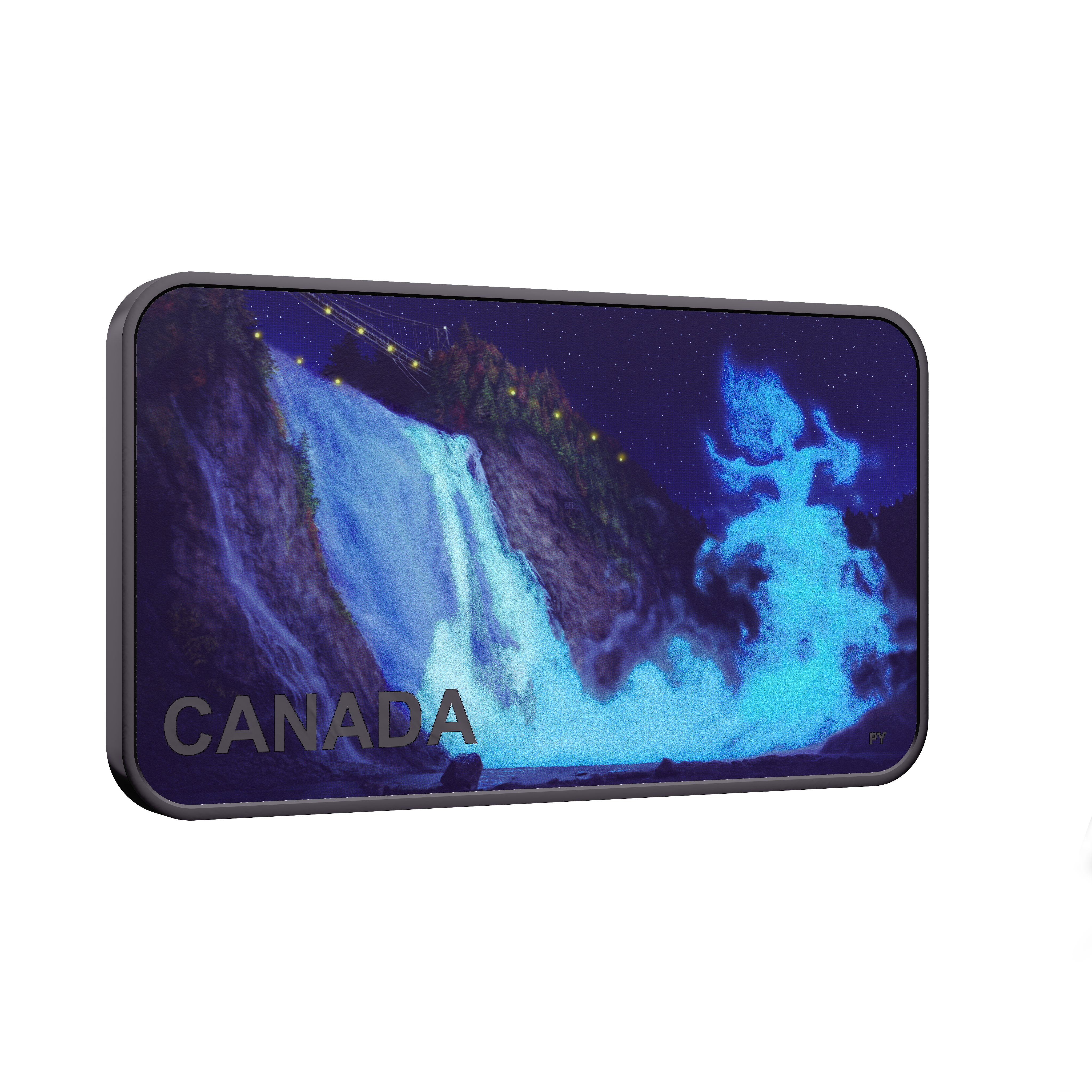 The reverse design by Canadian artist Pandora Young presents a view of the Montmorency Falls in the Québec City area, where a suspension bridge spans the top of the falls that plunge into the St. Lawrence River below. When the black light paint technology is activated, a ghostly figure appears in the mist, clad in a white wedding dress—it is the Lady in White, Mathilde Robin, who, distraught over the death of her fiancé in battle in 1759, threw herself into the falls that she still haunts today. The obverse features a wave pattern behind the effigy of His Majesty King Charles III by Canadian artist Steven Rosati.