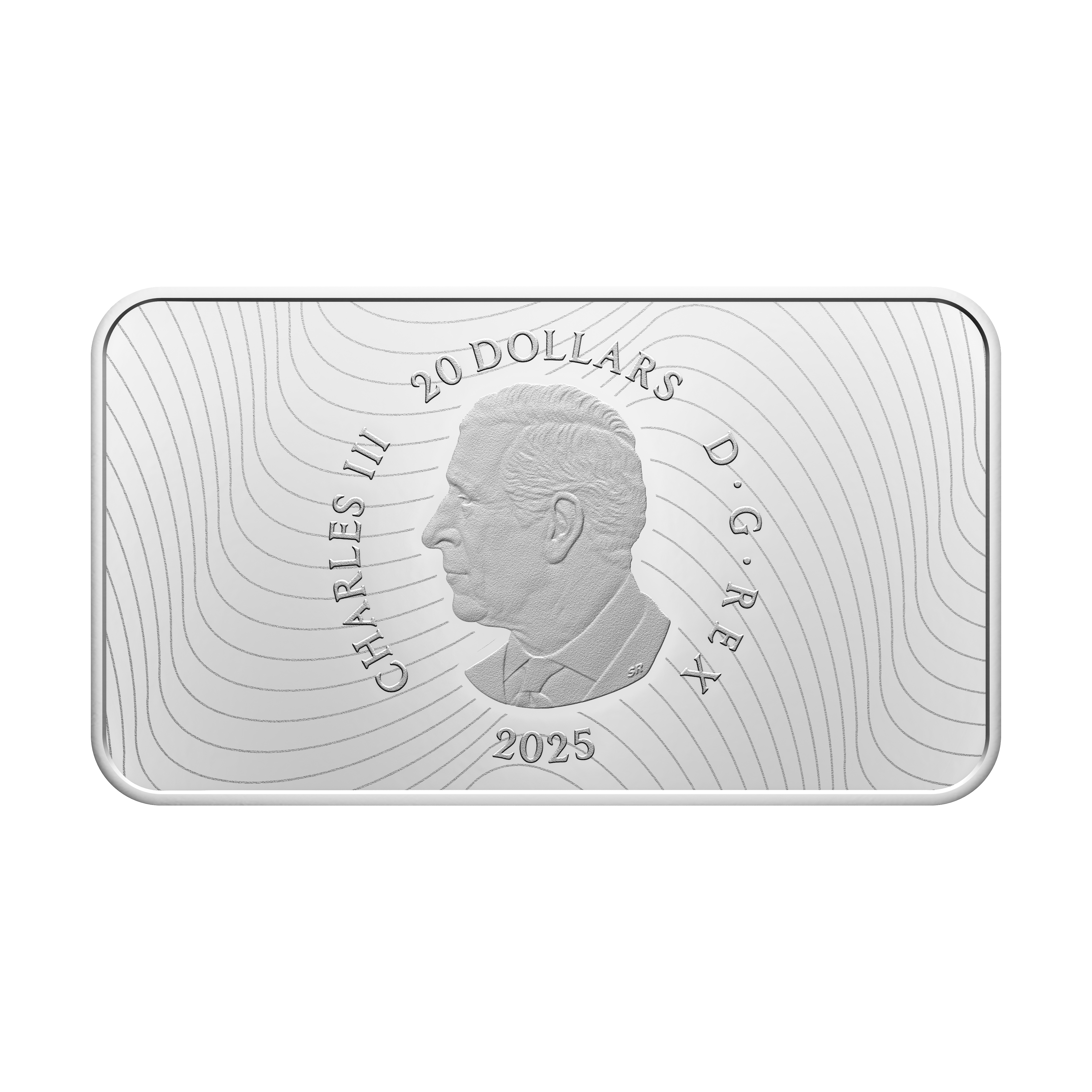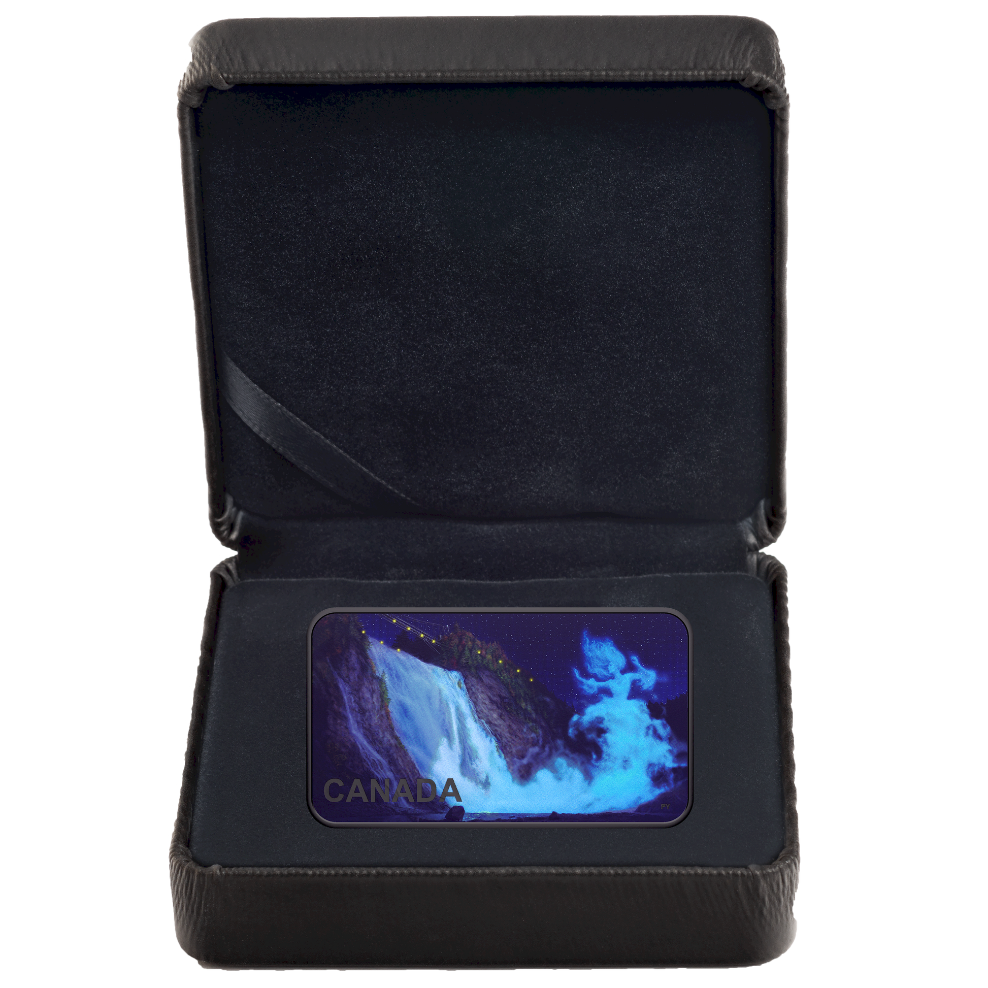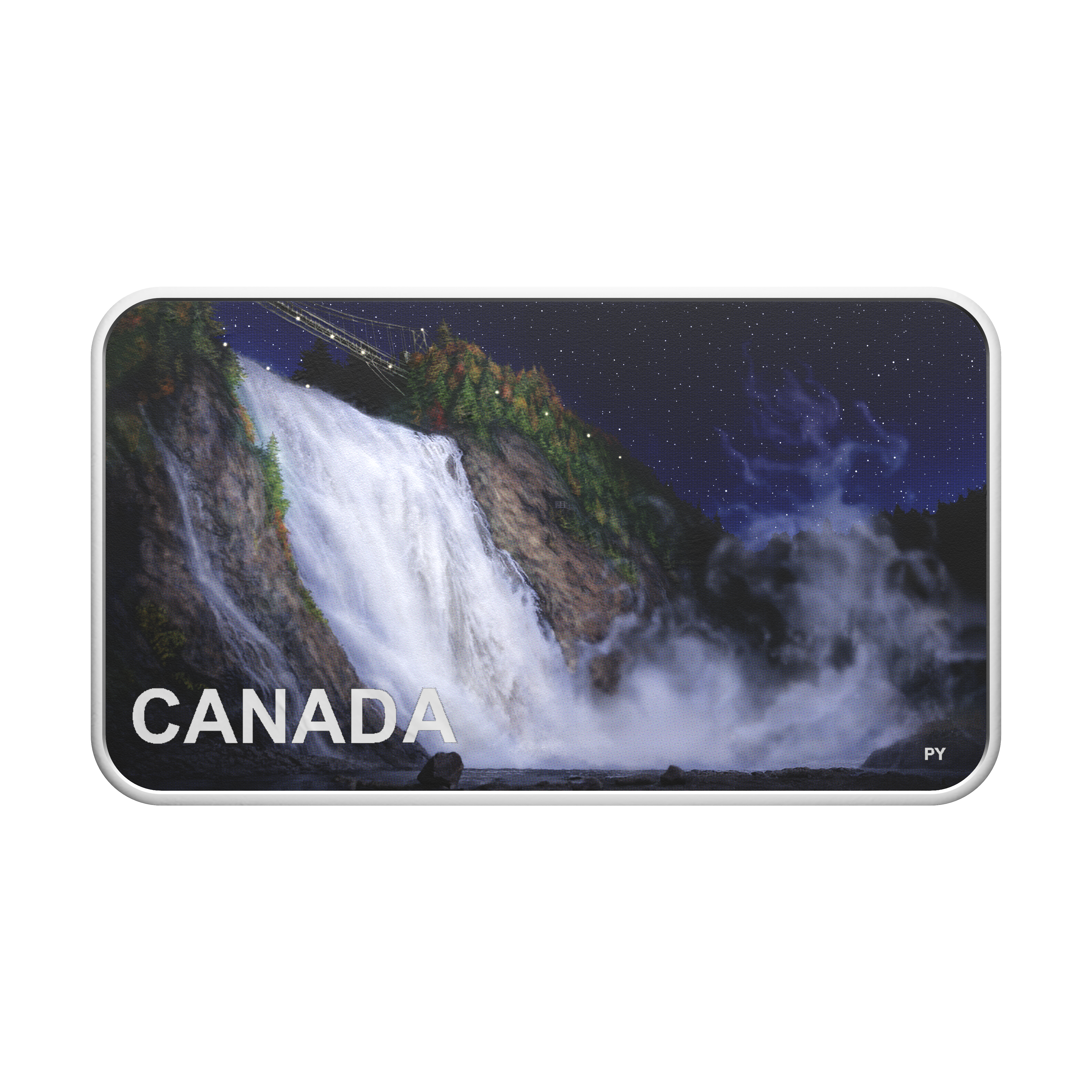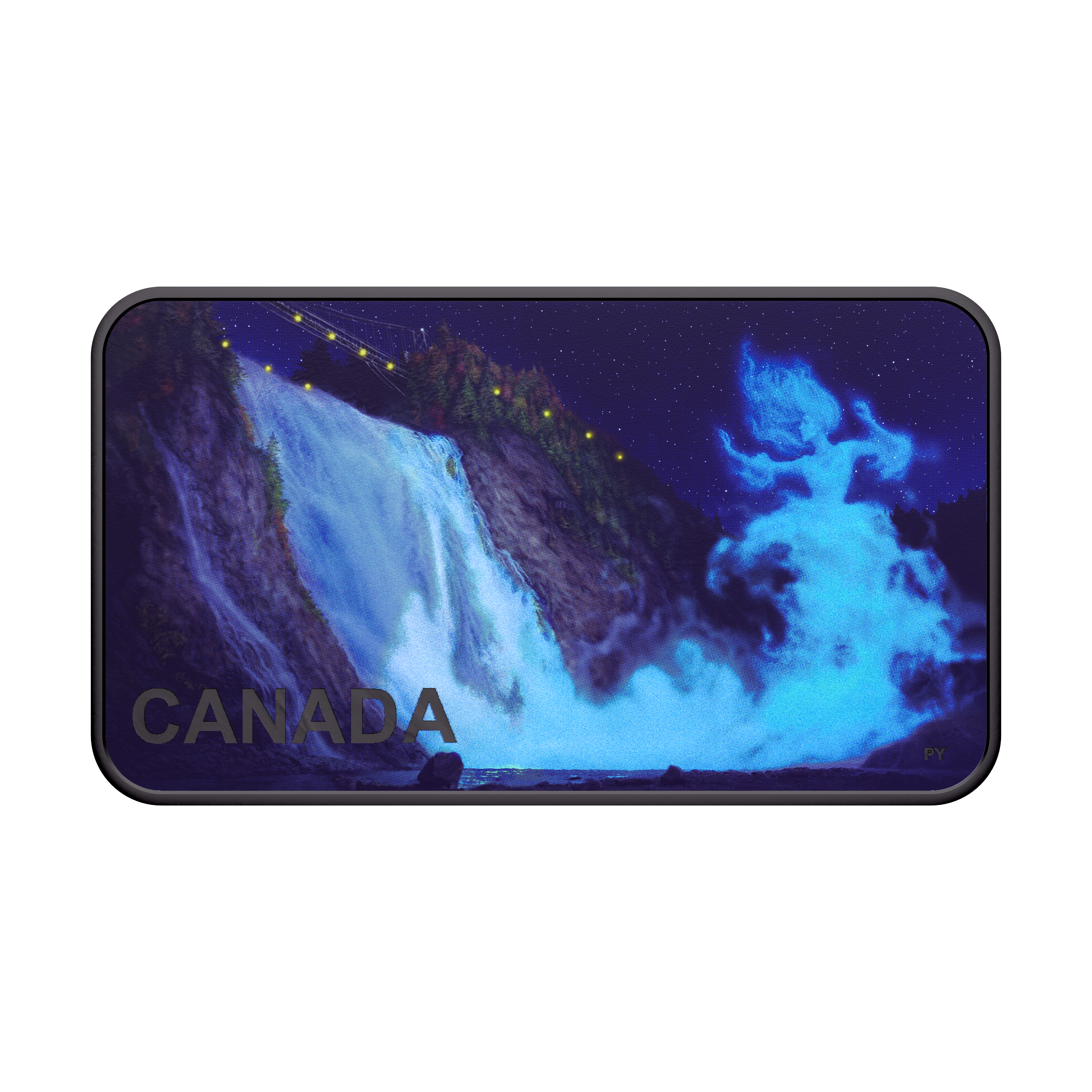 The reverse design by Canadian artist Pandora Young presents a view of the Montmorency Falls in the Québec City area, where a suspension bridge spans the top of the falls that plunge into the St. Lawrence River below. When the black light paint technology is activated, a ghostly figure appears in the mist, clad in a white wedding dress—it is the Lady in White, Mathilde Robin, who, distraught over the death of her fiancé in battle in 1759, threw herself into the falls that she still haunts today. The obverse features a wave pattern behind the effigy of His Majesty King Charles III by Canadian artist Steven Rosati.