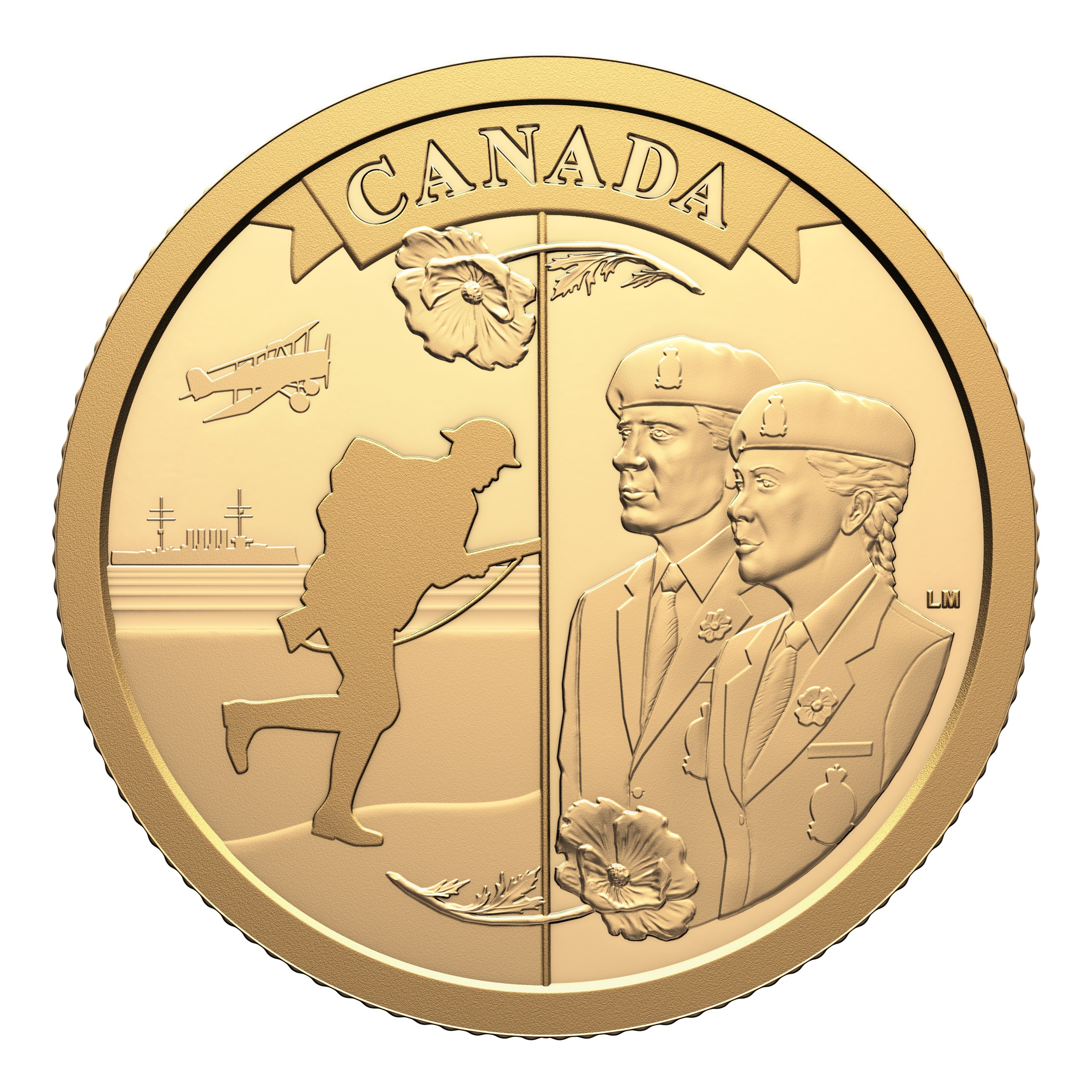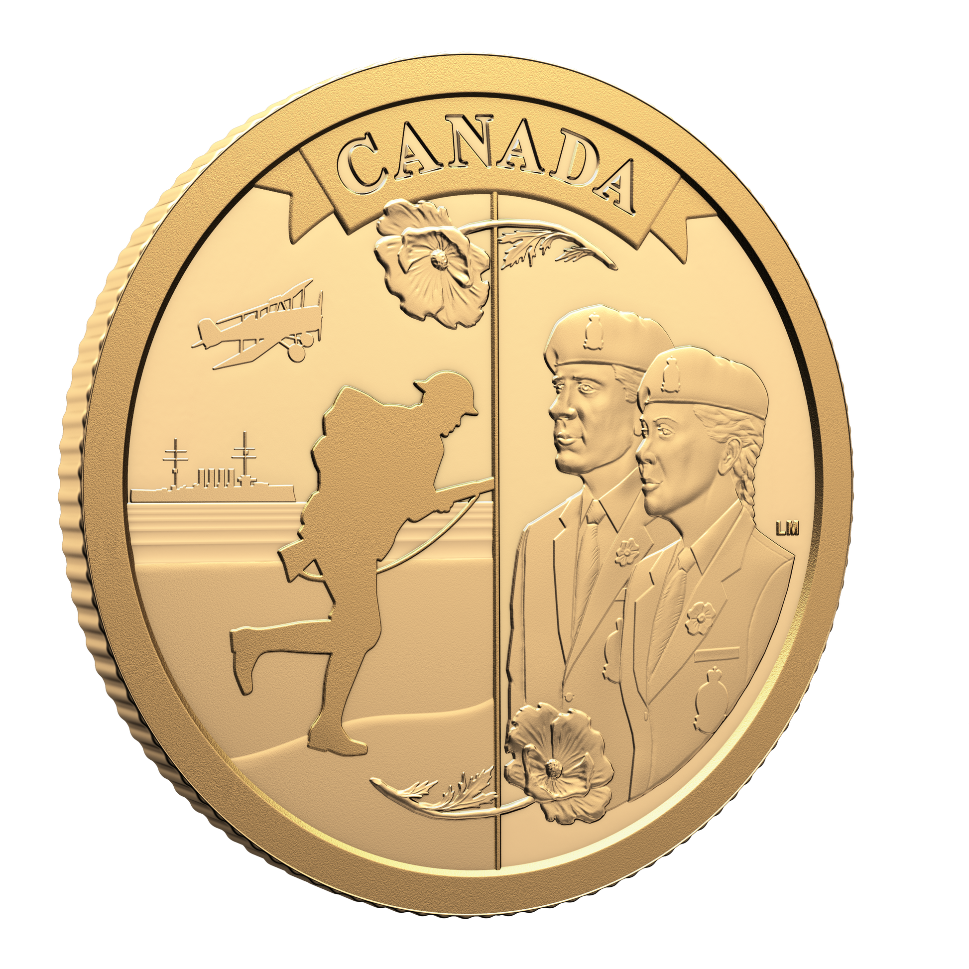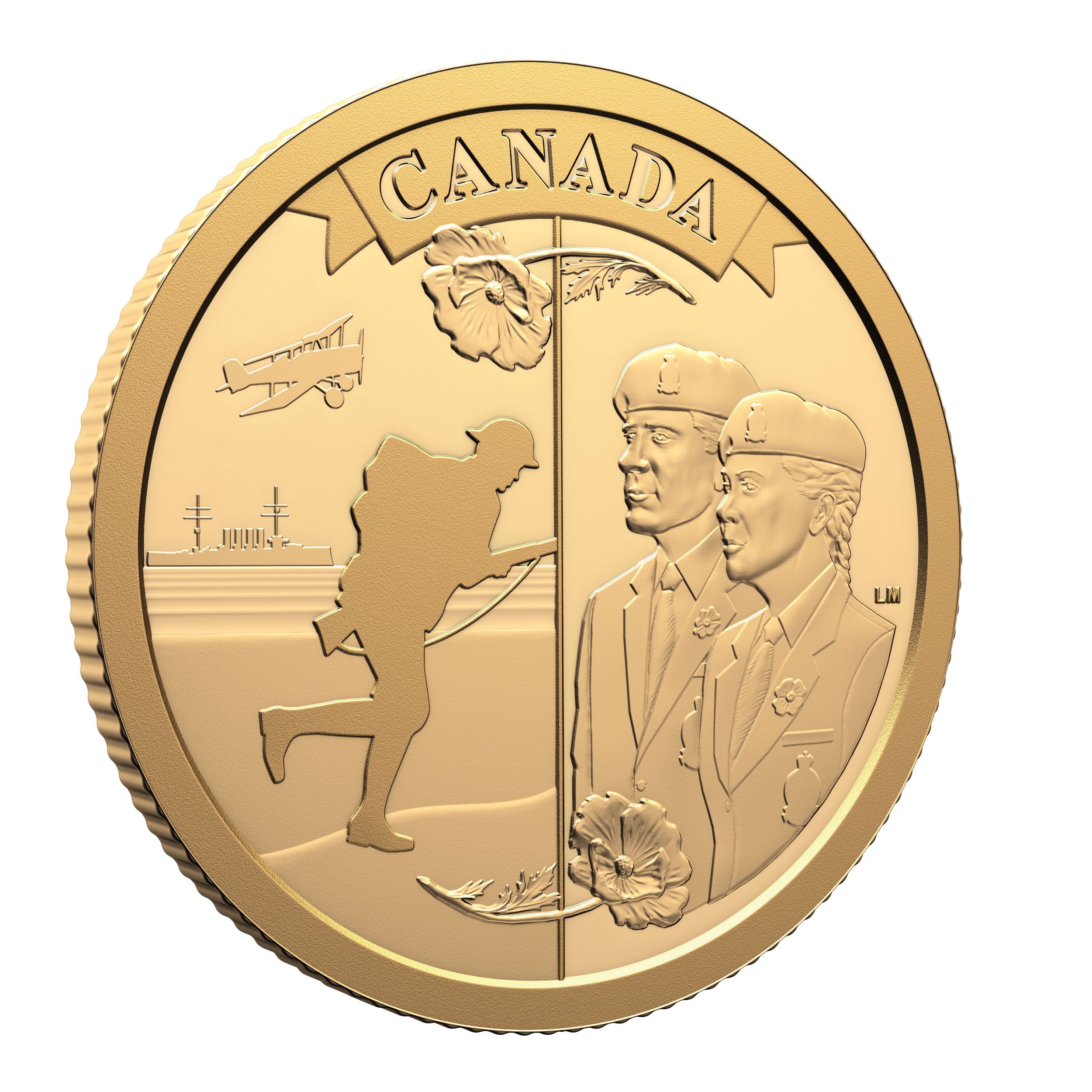 Designed by Canadian artist Laurie McGaw, the reverse features a split image that honours The Royal Canadian Legion’s past, present and future, as the organization celebrates its 100th anniversary in 2026. On the right is a depiction of two present-day Legion members in Legion dress reflecting on the past, which is represented by the scene on the left. This snapshot of history is filled with symbols representing Canada’s contribution to the Allied effort during the First World War and the sacrifices that gave rise to The Royal Canadian Legion: a Canadian infantryman, symbolizing the Army’s unifying effect and pivotal engagements like the Battle of Vimy Ridge; above him, the Royal Aircraft Factory Scout Experimental 5a (S.E.5a) aircraft flown by many Canadian aces during the war; and on the horizon, HMCS Niobe, a Diadem-class protected cruiser commissioned in 1910 into service with the newly formed Naval Service of Canada (later the Royal Canadian Navy). A Poppy in each half—one above, one below—represents an enduring cycle of Remembrance, connecting generations and honouring the pledge to never forget those who served and sacrificed in defence of freedom. The obverse features the effigy of His Majesty King Charles III by Canadian artist Steven Rosati.