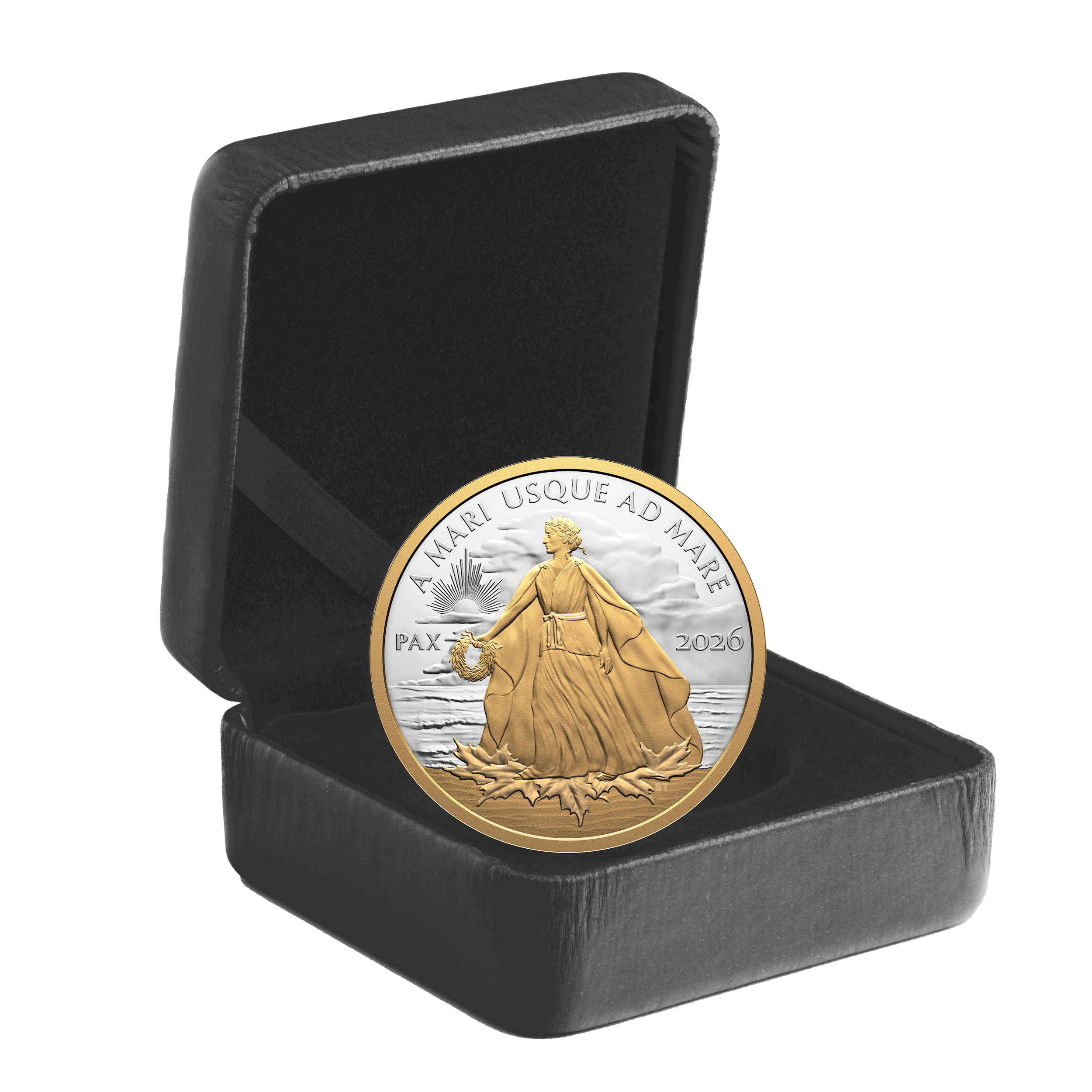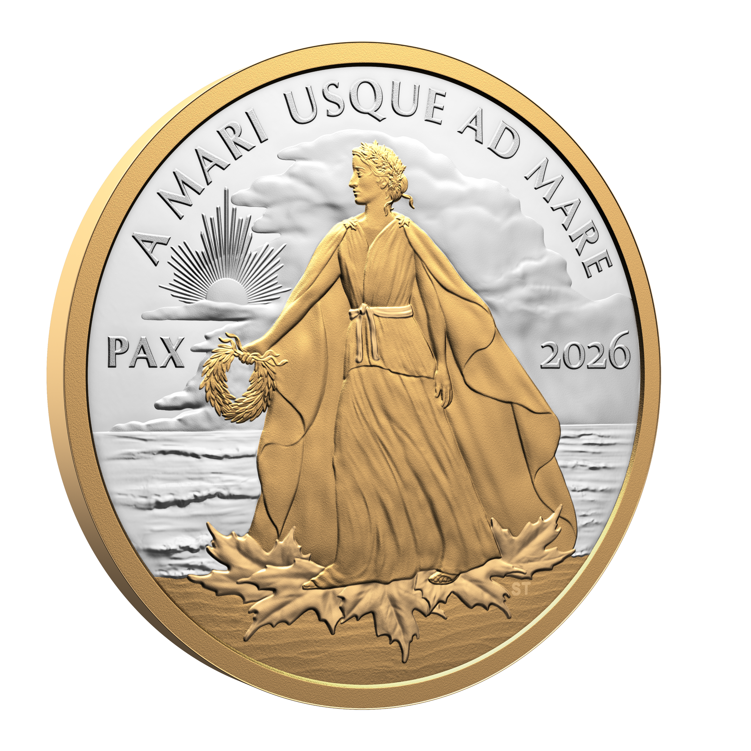 The reverse design by retired RCM Senior Engraver Susan Taylor features a gold-plated, full-body portrait of Lady Peace, a personification of Peace (“PAX”). Inspired by the allegorical figure atop the National War Memorial in Ottawa, Lady Peace is dressed in a flowing robe and crowned with a wreath of maple leaves and olive branches expressing a core Canadian value of peace. Her serene countenance exudes poise, strength and quiet confidence as she extends her right arm, almost as if the peace wreath she holds is an offering to all. Lady Peace stands on the shoreline, which is similarly plated with yellow gold, and is supported by maple leaves that are symbolic of Canada. Canada’s motto, “A MARI USQUE AD MARE” (“From sea to sea”) appears in the sky above, where the sun’s rays break through the rain clouds and form the shape of a maple leaf. The rim on both sides of the coin is plated with yellow gold, while the obverse features the gold-plated effigy of His Majesty King Charles III by Canadian artist Steven Rosati.