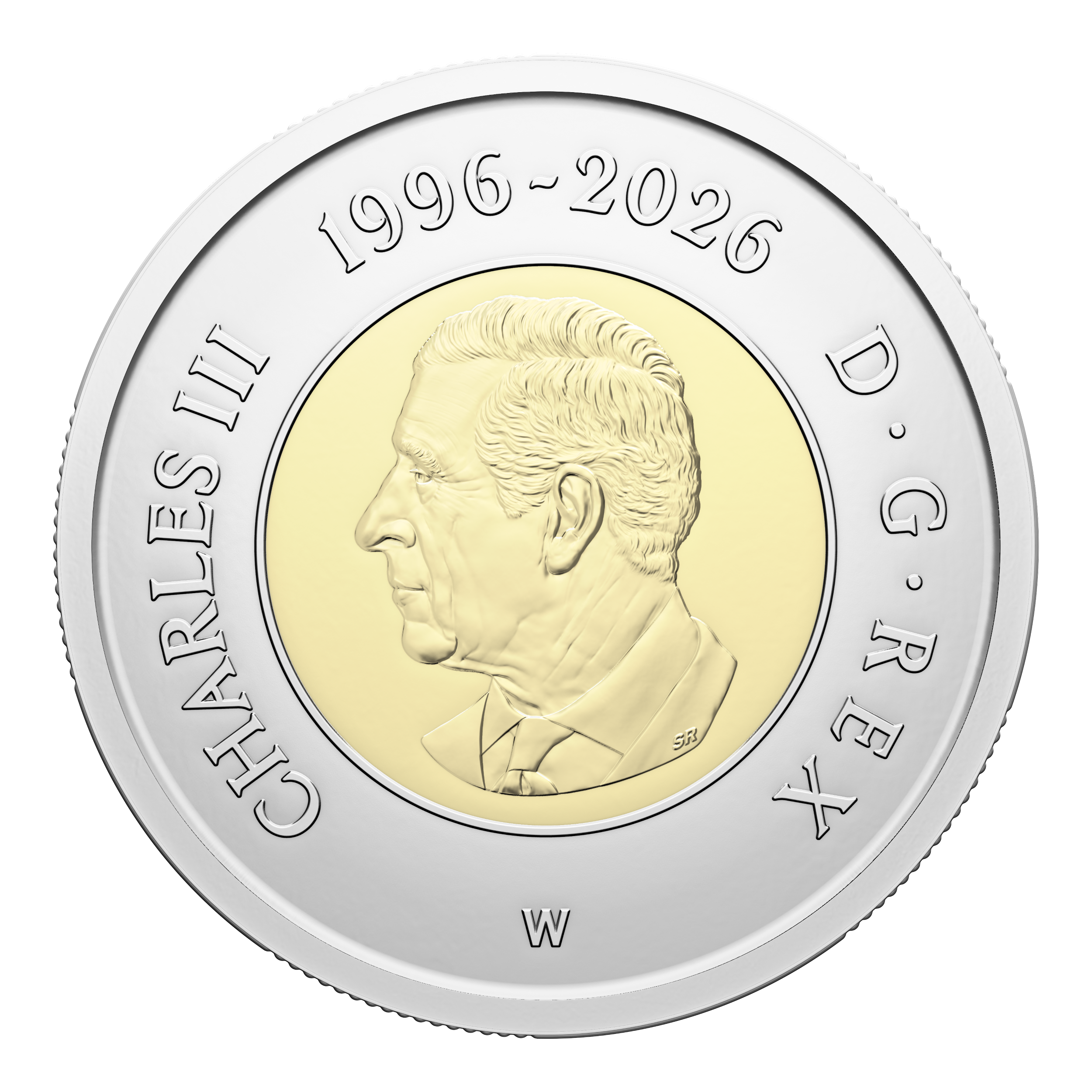 The reverse design by Canadian artist Brent Townsend features the classic image of an adult polar bear on an Arctic ice floe. Double-dated (“1996-2026”) to commemorate the 30th anniversary of Canada’s $2 coin, the obverse features the “W” mint mark of the Royal Canadian Mint’s Winnipeg facility and the effigy of His Majesty King Charles III by Canadian artist Steven Rosati.