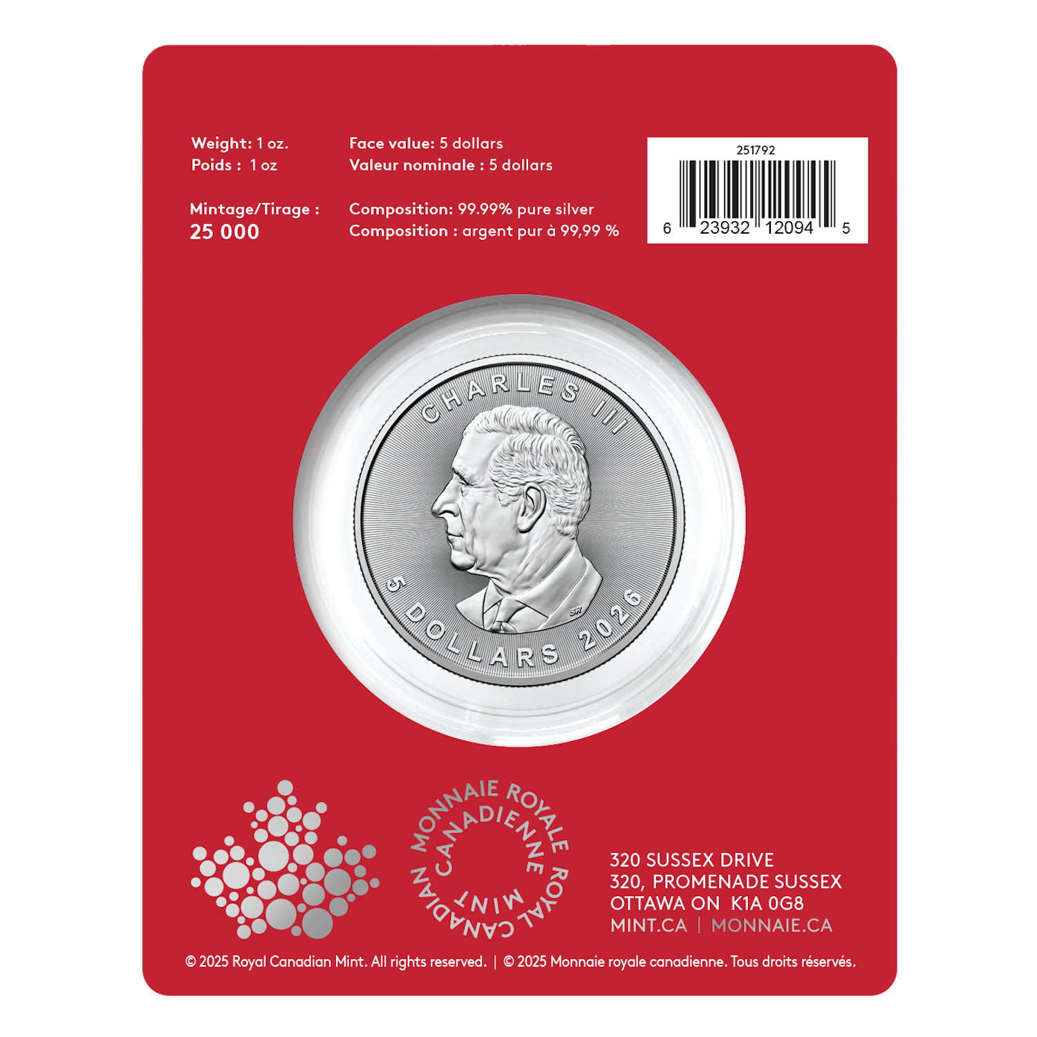 Featuring the effigy of His Majesty King Charles III, the 2026 Treasured Silver Maple Leaf bullion coin makes it easy to give or collect 99.99% pure silver—a lasting treasure that is both precious and pure.