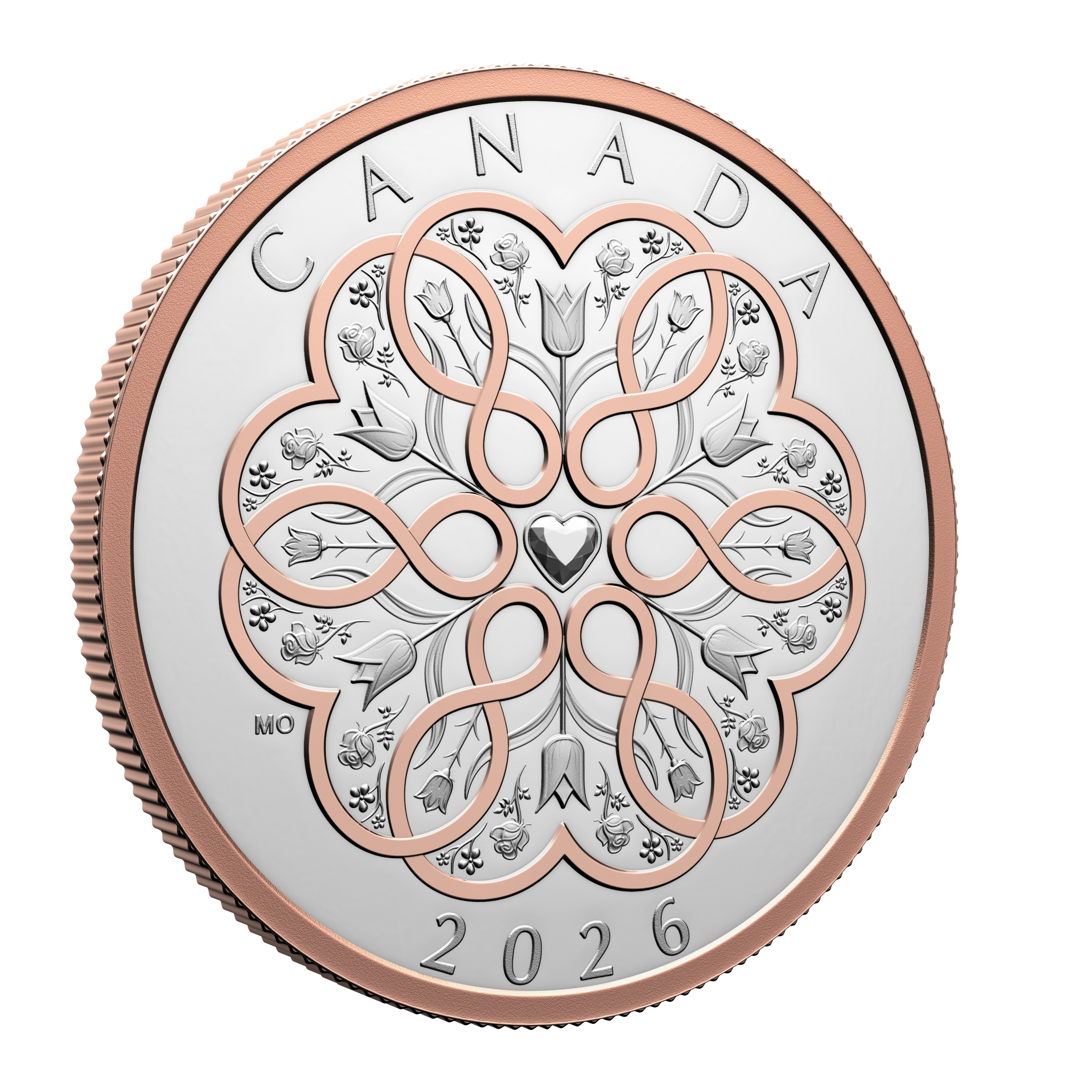 Love isn’t just a feeling, it’s the thread that ties us to one another in different ways—whether it’s the spark of romance, the comforting support of friendship, the heartbeat of family, or the care and attention we give to ourselves, this 99.99% pure silver coin celebrates it all! Its everlasting bouquet features tulips representing affection and renewal, roses for devotion and beauty, and fairy thimble for those small, simple moments that can feel like magic. Tying all of these together is a ribbon plated with rose gold to give it the colour of compassion and tenderness as it weaves its way through the blooms, forming hearts and infinity symbols that reflect love’s boundless nature.