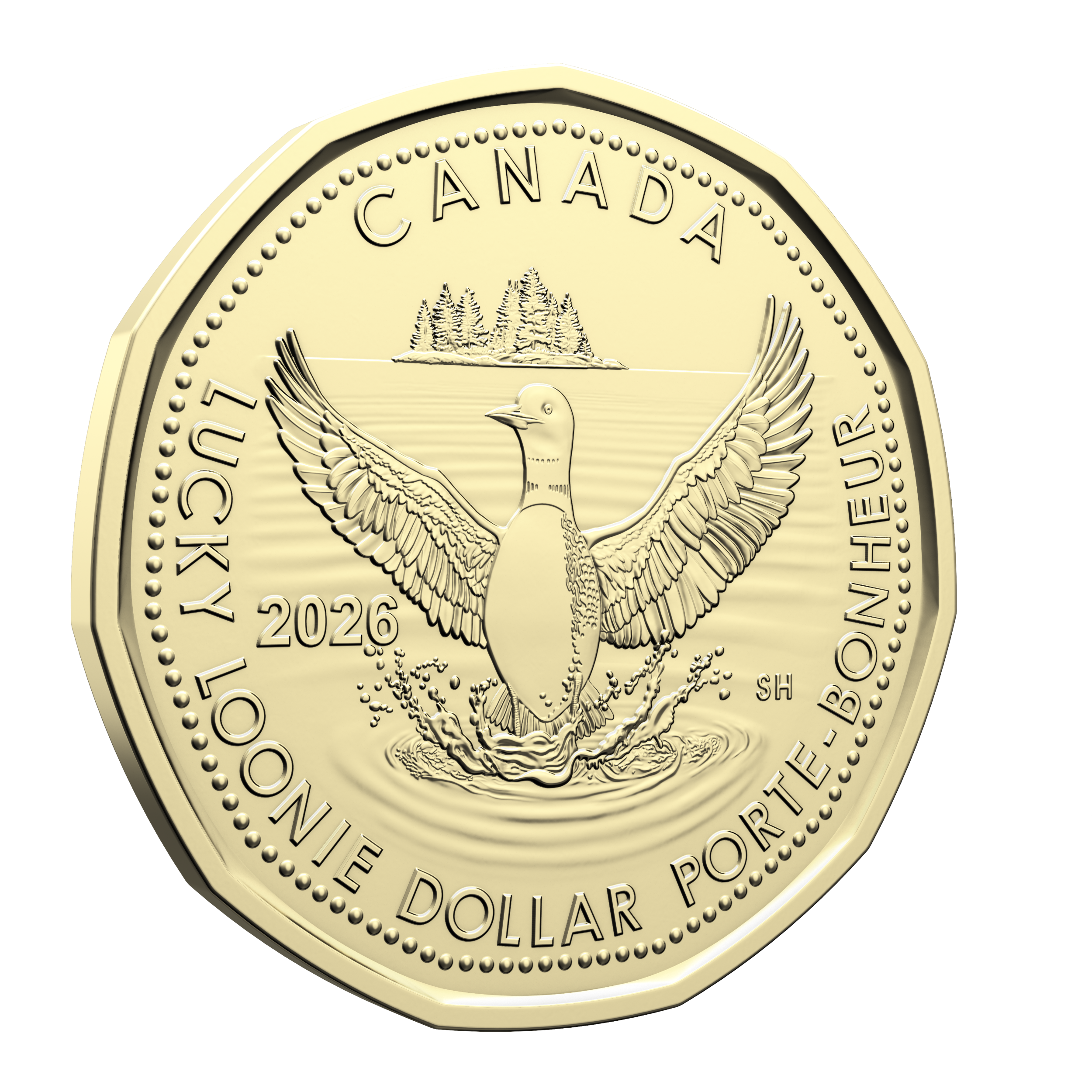 Designed by Canadian artist Steve Hepburn, your 2026 Lucky Loonie continues the tradition of offering a fresh take on the classic $1 circulation coin design by Robert-Ralph Carmichael and features a quintessentially Canadian lake setting. The common loon (Gavia immer)—a Canadian symbol embodying this country’s wilderness and waterways—has its wings raised triumphantly in a “V” (for “Victory”) shape while splashing into the water below. The obverse features the effigy of His Majesty King Charles III by Canadian artist Steven Rosati.