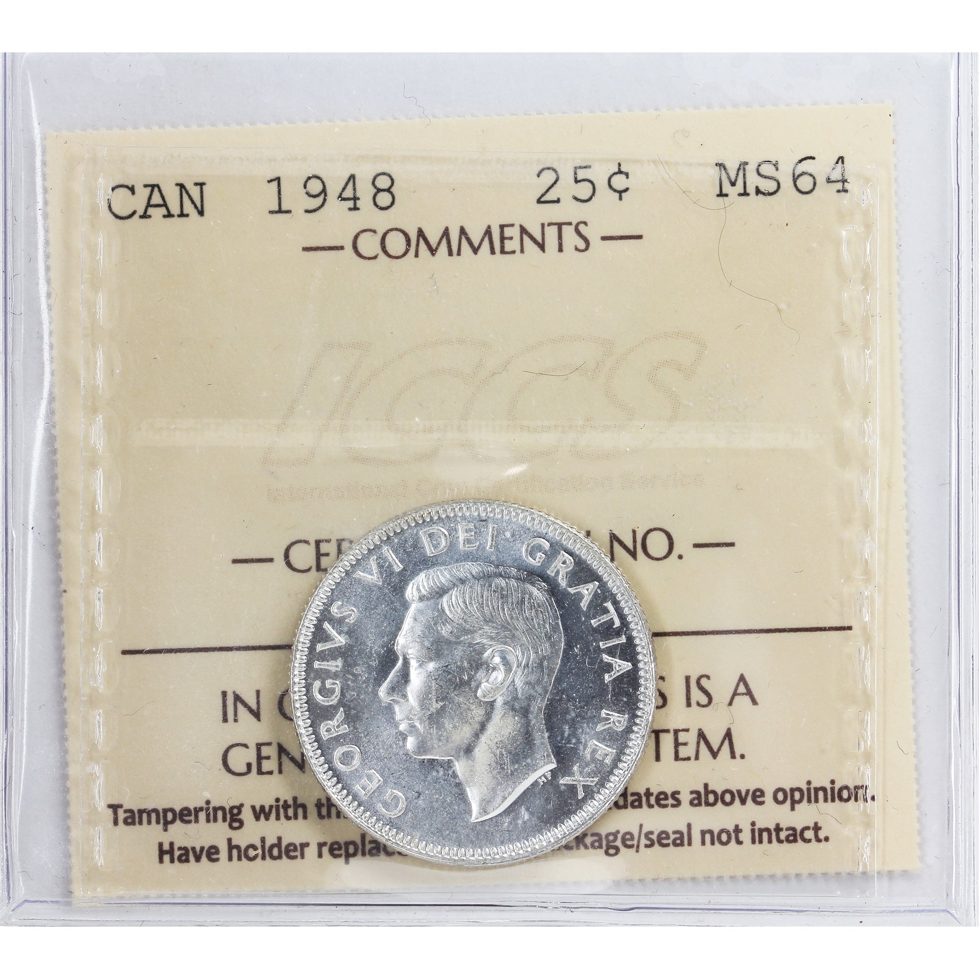 1948 Canada 25-cents ICCS Certified MS64 (XSU 363)