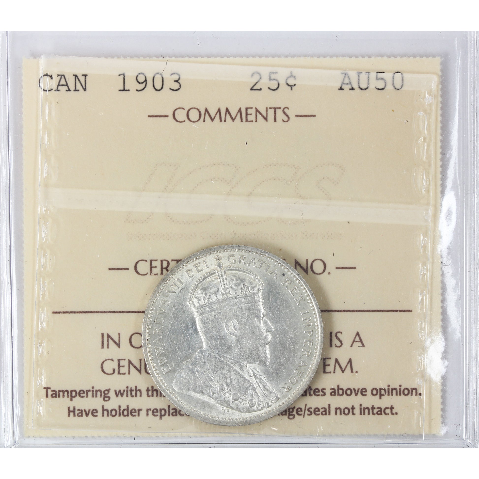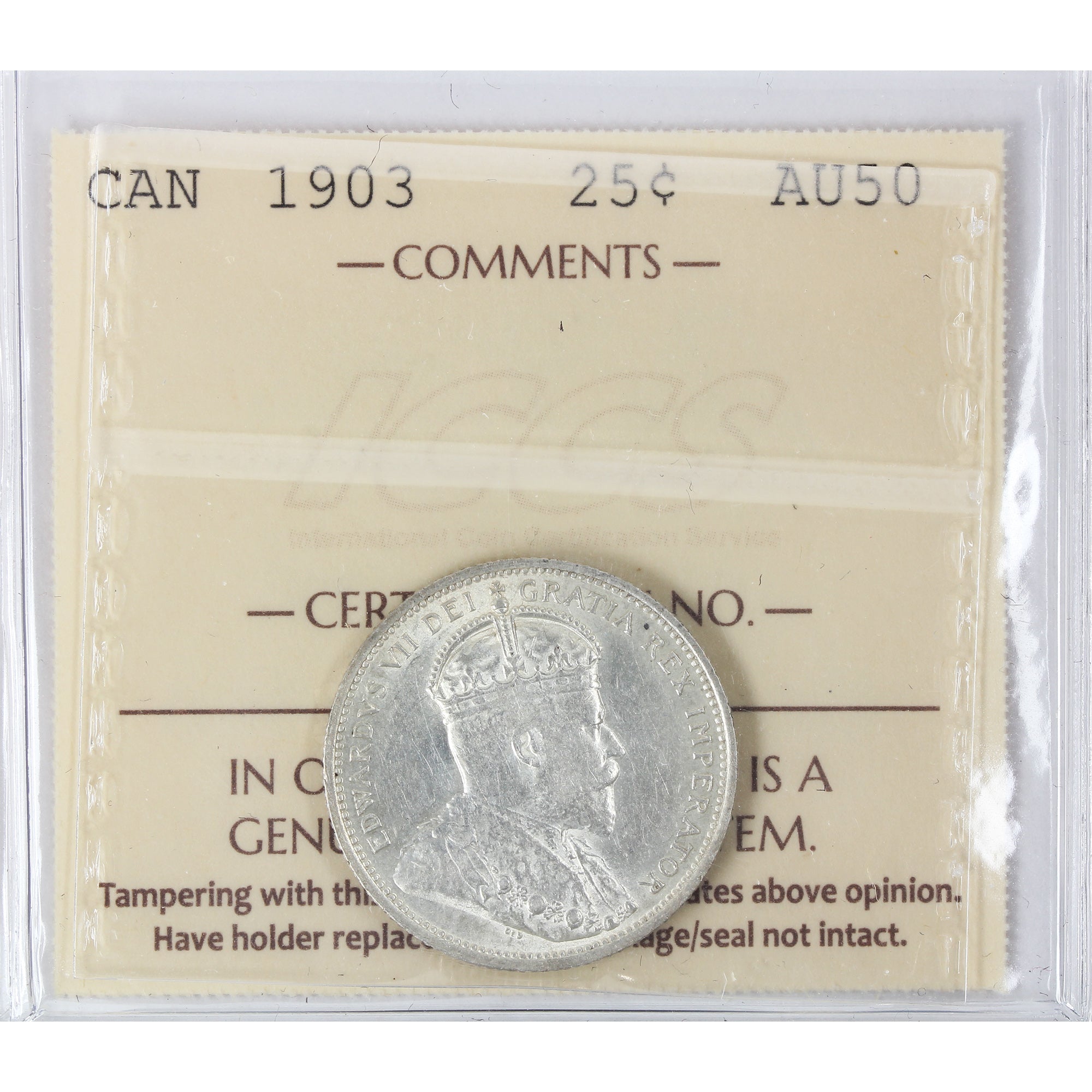 1903 Canada 25-cents ICCS Certified AU-50