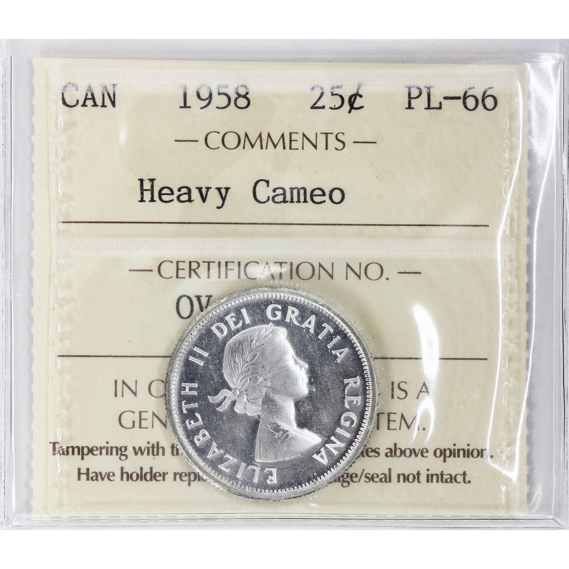 1958 Canada 25-cents ICCS Certified PL-66 Heavy Cameo